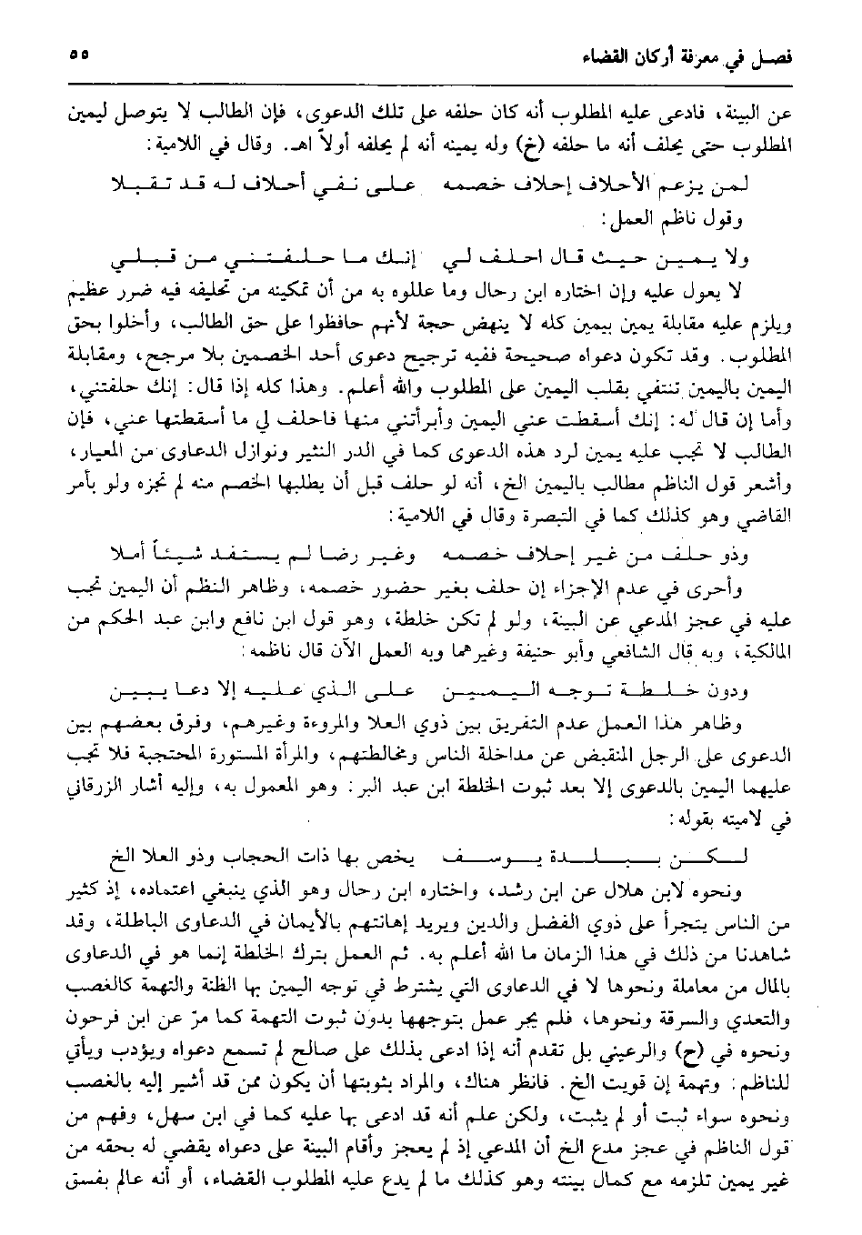 عَن الْبَيِّنَة، فَادّعى عَلَيْهِ الْمَطْلُوب أَنه كَانَ حلفه على تِلْكَ الدَّعْوَى، فَإِن الطَّالِب لَا يتَوَصَّل ليمين الْمَطْلُوب حَتَّى يحلف أَنه مَا حلفه (خَ) وَله يَمِينه أَنه لم يحلفهُ أَولا اه. وَقَالَ فِي اللامية: لمن يزْعم الأحلاف إحلاف خَصمه على نفي أحلاف لَهُ قد تقبلا وَقَول ناظم الْعَمَل: وَلَا يَمِين حَيْثُ قَالَ احْلِف لي إِنَّك مَا حلفتني من قبلي لَا يعول عَلَيْهِ وَإِن اخْتَارَهُ ابْن رحال وَمَا عللوه بِهِ من أَن تَمْكِينه من تَحْلِيفه فِيهِ ضَرَر عَظِيم وَيلْزم عَلَيْهِ مُقَابلَة يَمِين بِيَمِين كُله لَا ينْهض حجَّة لأَنهم حَافظُوا على حق الطَّالِب، وأخلوا بِحَق الْمَطْلُوب. وَقد تكون دَعْوَاهُ صَحِيحَة فَفِيهِ تَرْجِيح دَعْوَى أحد الْخَصْمَيْنِ بِلَا مُرَجّح، ومقابلة الْيَمين بِالْيَمِينِ تَنْتفِي بقلب الْيَمين على الْمَطْلُوب وَالله أعلم. وَهَذَا كُله إِذا قَالَ: إِنَّك حلفتني، وَأما إِن قَالَ لَهُ: إِنَّك أسقطت عني الْيَمين وأبرأتني مِنْهَا فاحلف لي مَا أسقطتها عني، فَإِن الطَّالِب لَا تجب عَلَيْهِ يَمِين لرد هَذِه الدَّعْوَى كَمَا فِي الدّرّ النثير ونوازل الدَّعَاوَى من المعيار، وأشعر قَول النَّاظِم مطَالب بِالْيَمِينِ الخ، أَنه لَو حلف قبل أَن يطْلبهَا الْخصم مِنْهُ لم تجزه وَلَو بِأَمْر القَاضِي وَهُوَ كَذَلِك كَمَا فِي التَّبْصِرَة وَقَالَ فِي اللامية: وَذُو حلف من غير إحلاف خَصمه وَغير رضَا لم يستفد شَيْئا أملا وَأَحْرَى فِي عدم الْإِجْزَاء إِن حلف بِغَيْر حُضُور خَصمه، وَظَاهر النّظم أَن الْيَمين تجب عَلَيْهِ فِي عجز الْمُدَّعِي عَن الْبَيِّنَة، وَلَو لم تكن خلْطَة، وَهُوَ قَول ابْن نَافِع وَابْن عبد الحكم من الْمَالِكِيَّة، وَبِه قَالَ الشَّافِعِي وَأَبُو حنيفَة وَغَيرهمَا وَبِه الْعَمَل الْآن قَالَ ناظمه: وَدون خلْطَة توجه الْيَمين على الَّذِي عَلَيْهِ إِلَّا دَعَا يبين وَظَاهر هَذَا الْعَمَل عدم التَّفْرِيق بَين ذَوي الْعلَا والمروءة وَغَيرهم، وَفرق بَعضهم بَين الدَّعْوَى على الرجل المنقبض عَن مداخلة النَّاس ومخالطتهم، وَالْمَرْأَة المستورة المحتجبة فَلَا تجب عَلَيْهِمَا الْيَمين بِالدَّعْوَى إِلَّا بعد ثُبُوت الْخلطَة ابْن عبد الْبر: وَهُوَ الْمَعْمُول بِهِ، وَإِلَيْهِ أَشَارَ الزّرْقَانِيّ فِي لاميته بقوله: لَكِن ببلدة يُوسُف يخص بهَا ذَات الْحجاب وَذُو الْعلَا الخ وَنَحْوه لِابْنِ هِلَال عَن ابْن رشد، وَاخْتَارَهُ ابْن رحال وَهُوَ الَّذِي يَنْبَغِي اعْتِمَاده، إِذْ كثير من النَّاس يتجرأ على ذَوي الْفضل وَالدّين وَيُرِيد إهانتهم بالأيمان فِي الدَّعَاوَى الْبَاطِلَة، وَقد شاهدنا من ذَلِك فِي هَذَا الزَّمَان مَا الله أعلم بِهِ. ثمَّ الْعَمَل بترك الْخلطَة إِنَّمَا هُوَ فِي الدَّعَاوَى بِالْمَالِ من مُعَاملَة وَنَحْوهَا لَا فِي الدَّعَاوَى الَّتِي يشْتَرط فِي توجه الْيَمين بهَا الظنة والتهمة كالغصب والتعدي وَالسَّرِقَة وَنَحْوهَا فَلم يجر عمل بتوجهها بِدُونِ ثُبُوت التُّهْمَة كَمَا مرّ عَن ابْن فَرِحُونَ وَنَحْوه فِي (ح) والرعيني بل تقدم أَنه إِذا ادّعى بذلك على صَالح لم تسمع دَعْوَاهُ ويؤدب وَيَأْتِي للناظم: وتهمة إِن قويت الخ. فَانْظُر هُنَاكَ، وَالْمرَاد بثوبتها أَن يكون مِمَّن قد أُشير إِلَيْهِ بِالْغَصْبِ وَنَحْوه سَوَاء ثَبت أَو لم يثبت، وَلَكِن علم أَنه قد ادّعى بهَا عَلَيْهِ كَمَا فِي ابْن سهل، وَفهم من قَول النَّاظِم فِي عجز مُدع الخ أَن الْمُدَّعِي إِذْ لم يعجز وَأقَام الْبَيِّنَة على دَعْوَاهُ يقْضِي لَهُ بِحقِّهِ من غير يَمِين تلْزمهُ مَعَ كَمَال بَينته وَهُوَ كَذَلِك مَا لم يدع عَلَيْهِ الْمَطْلُوب الْقَضَاء، أَو أَنه عَالم بفسق