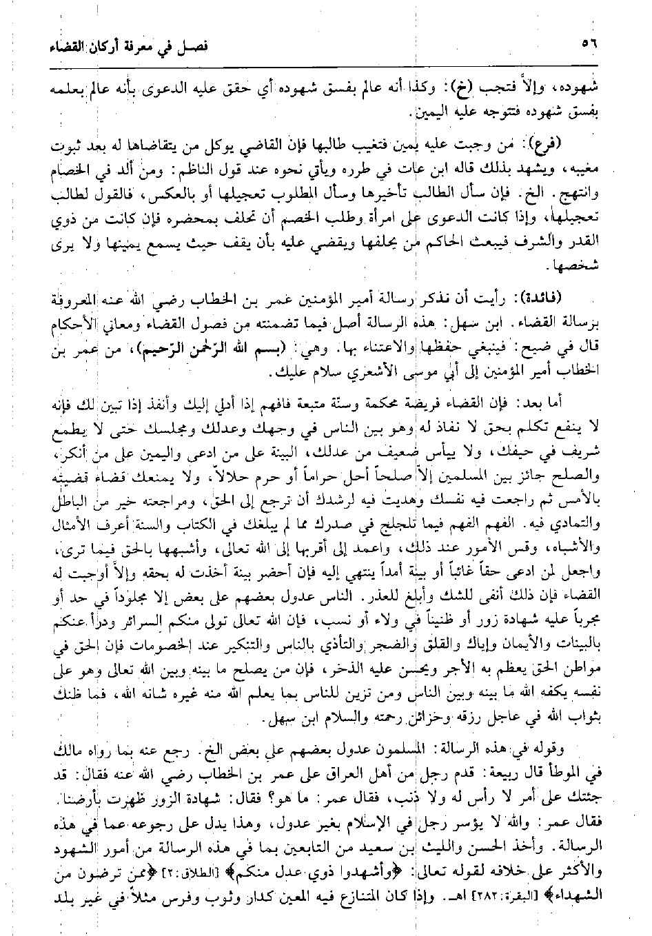 1648 - ; ن الرّحيم) ، من عمر بن الْخطاب أَمِير الْمُؤمنِينَ إِلَى أبي مُوسَى الْأَشْعَرِيّ سَلام عَلَيْك. أما بعد: فَإِن الْقَضَاء فَرِيضَة محكمَة وسنّة متبعة فَافْهَم إِذا أدلي إِلَيْك وأنفذ إِذا تبين لَك فَإِنَّهُ لَا ينفع تكلم بِحَق لَا نَفاذ لَهُ وَهُوَ بَين النَّاس فِي وَجهك وعدلك ومجلسك حَتَّى لَا يطْمع شرِيف فِي حيفك، وَلَا ييأس ضَعِيف من عدلك، الْبَيِّنَة على من ادّعى وَالْيَمِين على من أنكر، وَالصُّلْح جَائِز بَين الْمُسلمين إلاّ صلحا أحل حَرَامًا أَو حرم حَلَالا، وَلَا يمنعك قَضَاء قَضيته بالْأَمْس ثمَّ راجعت فِيهِ نَفسك وهديت فِيهِ لرشدك أَن ترجع إِلَى الْحق، ومراجعته خير من الْبَاطِل والتمادي فِيهِ. الْفَهم الْفَهم فِيمَا تلجلج فِي صدرك مِمَّا لم يبلغك فِي الْكتاب وَالسّنة أعرف الْأَمْثَال والأشباه، وَقس الْأُمُور عِنْد ذَلِك، واعمد إِلَى أقربها إِلَى الله تَعَالَى، وأشبهها بِالْحَقِّ فِيمَا ترى، وَاجعَل لمن ادّعى حَقًا غَائِبا أَو بَيِّنَة أمداً يَنْتَهِي إِلَيْهِ فَإِن أحضر بَيِّنَة أخذت لَهُ بِحقِّهِ وإلاَّ أوجبت لَهُ الْقَضَاء فَإِن ذَلِك أنفى للشَّكّ وأبلغ للْعُذْر. النَّاس عدُول بَعضهم على بعض إِلَّا مجلوداً فِي حد أَو مجرباً عَلَيْهِ شَهَادَة زور أَو ظنيناً فِي وَلَاء أَو نسب، فَإِن الله تَعَالَى تولى مِنْكُم السرائر وَدَرَأَ عَنْكُم بِالْبَيِّنَاتِ والأيمان وَإِيَّاك والقلق والضجر والتأذي بِالنَّاسِ والتنكير عِنْد الْخُصُومَات فَإِن الْحق فِي مَوَاطِن الْحق يعظم بِهِ الْأجر وَيحسن عَلَيْهِ الذخر، فَإِن من يصلح مَا بَينه وَبَين الله تَعَالَى وَهُوَ على نَفسه يكفه الله مَا بَينه وَبَين النَّاس وَمن تزين للنَّاس بِمَا يعلم الله مِنْهُ غَيره شانه الله، فَمَا ظَنك بِثَوَاب الله فِي عَاجل رزقه وخزائن رَحمته وَالسَّلَام ابْن سهل. وَقَوله فِي هَذِه الرسَالَة: الْمُسلمُونَ عدُول بَعضهم على بعض الخ. رَجَعَ عَنهُ بِمَا رَوَاهُ مَالك فِي الْمُوَطَّأ قَالَ ربيعَة: قدم رجل من أهل الْعرَاق على عمر بن الْخطاب رَضِي الله عَنهُ فَقَالَ: قد جئْتُك على أَمر لَا رَأس لَهُ وَلَا ذَنْب، فَقَالَ عمر: مَا هُوَ؟ فَقَالَ: شَهَادَة الزُّور ظَهرت بأرضنا. فَقَالَ عمر: وَالله لَا يؤسر رجل فِي الْإِسْلَام بِغَيْر عدُول، وَهَذَا يدل على رُجُوعه عَمَّا فِي هَذِه الرسَالَة. وَأخذ الْحسن وَاللَّيْث بن سعيد من التَّابِعين بِمَا فِي هَذِه الرسَالَة من أُمُور الشُّهُود وَالْأَكْثَر على خِلَافه لقَوْله تَعَالَى: وَأشْهدُوا ذَوي عدل مِنْكُم} (الطَّلَاق: 2) مِمَّن ترْضونَ من الشُّهَدَاء} (الْبَقَرَة: 282) اه. وَإِذا كَانَ الْمُتَنَازع فِيهِ الْمعِين كدار وثوب وَفرس مثلا فِي غير بلد