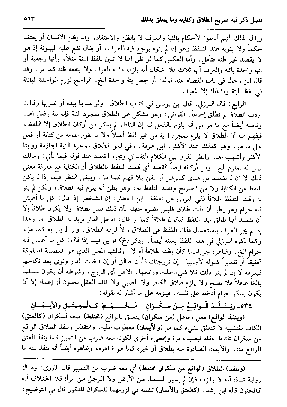 وَيدل لذَلِك أَنهم أناطوا الْأَحْكَام بِالنِّيَّةِ وَالْعرْف لَا بِالظَّنِّ والاعتقاد، وَقد يظنّ الْإِنْسَان أَو يعْتَقد حكما وَلَا ينويه عِنْد التَّلَفُّظ وَهُوَ إِذا لم يُنَوّه يرجع فِيهِ للْعُرْف أَو يُقَال تقع عَلَيْهِ الْبَيْنُونَة إِذْ هُوَ لَا يقْصد غير ظَنّه فَتَأمل. وَأما الْعَكْس كَمَا لَو ظن أَنَّهَا لَا تبين بِلَفْظ الْبَتَّةَ مثلا، وَأَنَّهَا رَجْعِيَّة أَو أَنَّهَا وَاحِدَة بَائِنَة وَالْعرْف أَنَّهَا ثَلَاث فَلَا إِشْكَال أَنه يلْزمه مَا بِهِ الْعرف وَلَا يَنْفَعهُ ظَنّه كَمَا مر. وَقد قَالَ ابْن رحال فِي بَاب الْقَضَاء عِنْد قَوْله: أَو جعل بتة وَاحِدَة الخ. الرَّاجِح لُزُوم الْوَاحِدَة البائنة فِي لفظ الْبَتَّةَ وَمَا ذَاك إِلَّا للْعُرْف. الرَّابِع: قَالَ الْبُرْزُليّ، قَالَ ابْن يُونُس فِي كتاب الطَّلَاق: وَلَو مَسهَا بِيَدِهِ أَو ضربهَا وَقَالَ: أردْت الطَّلَاق لم تطلق إِجْمَاعًا. الْقَرَافِيّ: وَهُوَ مُشكل على الطَّلَاق بِمُجَرَّد النِّيَّة فَإِنَّهُ نِيَّة وَفعل اه. وتأمله أَيْضا مَعَ مَا مر من أَنه يلْزم بِالْفِعْلِ ثمَّ إِن النَّاظِم لم يذكر من أَرْكَان الطَّلَاق إِلَّا اللَّفْظ، فيفهم مِنْهُ أَن الطَّلَاق لَا يلْزم بِمُجَرَّد النِّيَّة من غير لفظ أصلا وَلَا مَا يقوم مقَامه من كِتَابَة أَو فعل على مَا مر، وَهُوَ كَذَلِك عِنْد الْأَكْثَر. ابْن عَرَفَة: وَفِي لَغْو الطَّلَاق بِمُجَرَّد النِّيَّة الجازمة روايتا الْأَكْثَر وَأَشْهَب اه. وَانْظُر الْفرق بَين الْكَلَام النفساني وَمُجَرَّد الْقَصْد عِنْد قَوْله فِيمَا يَأْتِي: وَمَالك لَيْسَ لَهُ بملزم الخ. وَمن أَرْكَانه أَيْضا الْقَصْد أَي قصد التَّلَفُّظ بِالطَّلَاق أَو الْكِنَايَة مَعَ معرفَة معنى ذَلِك لَا أَن لم يقْصد بل هذي كَمَرَض أَو لقن بِلَا فهم كَمَا مرّ. وَيبقى النّظر فِيمَا إِذا لم يكن اللَّفْظ من الْكِنَايَة وَلَا من الصَّرِيح وَقصد التَّلَفُّظ بِهِ، وَهُوَ يظنّ أَنه يلْزم فِيهِ الطَّلَاق، وَلَكِن لم ينْو بِهِ وَقت التَّلَفُّظ طَلَاقا فَفِي الْبُرْزُليّ عَن تعلقة. ابْن الْعَطَّار: إِن الشَّخْص إِذا قَالَ: كل مَا أعيش فِيهِ حرَام وَهُوَ يظنّ أَن ذَلِك طَلَاق فَلَيْسَ يضرّهُ جَهله بِأَن ذَلِك لَيْسَ بِطَلَاق وَلَا يكون طَلَاقا إِلَّا أَن يقْصد أَنَّهَا طَالِق بِهَذَا اللَّفْظ فَيكون طَلَاقا كَمَا لَو قَالَ: ادخلي الدَّار يُرِيد بِهِ الطَّلَاق اه. وَهَذَا إِذا لم يجر الْعرف بِاسْتِعْمَال ذَلِك اللَّفْظ فِي الطَّلَاق وإلاَّ لزمَه الطَّلَاق، وَلَو لم ينْو بِهِ كَمَا مرّ، وكما ذكره الْبُرْزُليّ فِي هَذَا اللَّفْظ بِعَيْنِه أَيْضا. وَذكر (خَ) قَوْلَيْنِ فِيمَا إِذا قَالَ: كل مَا أعيش فِيهِ حرَام الخ. وَظَاهره جريانهما كَأَن يَظُنّهُ طَلَاقا أم لَا. وَثَالِثهَا الْمحل الَّذِي هُوَ الْعِصْمَة الْمَمْلُوكَة تَحْقِيقا أَو تَقْديرا كَقَوْلِه لأجنبية: إِن تَزَوَّجتك فَأَنت طَالِق أَو إِن دخلت الدَّار وَنوى بعد نِكَاحهَا فَيلْزمهُ لَا إِن لم ينْو ذَلِك فَلَا شَيْء عَلَيْهِ. وَرَابِعهَا: الْأَهْل أَي الزَّوْج، وَشَرطه أَن يكون مُسلما بَالغا عَاقِلا فَلَا يَصح وَلَا يلْزم طَلَاق الْكَافِر وَلَا الصَّبِي وَلَا فَاقِد الْعقل بجنون أَو إِغْمَاء إِلَّا أَن يكون بسكر حرَام أدخلهُ على نَفسه، فَيلْزمهُ على مَا أَشَارَ لَهُ بقوله: وَيَنْفُذ الْوَاقِعُ مِنْ سَكْرَانِ مُخْتَلِطٍ كالْعِتْقِ والأيمَانِ (وَينفذ الْوَاقِع) فعل وفاعل (من سَكرَان) يتَعَلَّق بالواقع (مختلط) صفة لسكران (كَالْعِتْقِ) الْكَاف للتشبيه لَا تتَعَلَّق بِشَيْء كَمَا مر (والأيمان) مَعْطُوف عَلَيْهِ، وَالتَّقْدِير وَينفذ الطَّلَاق الْوَاقِع من سَكرَان مختلط عقله فَيُصِيب مرّة ويخطىء أُخْرَى لكَونه مَعَه ضرب من التَّمْيِيز كَمَا ينفذ الْعتْق الْوَاقِع مِنْهُ، والأيمان الصادرة 
