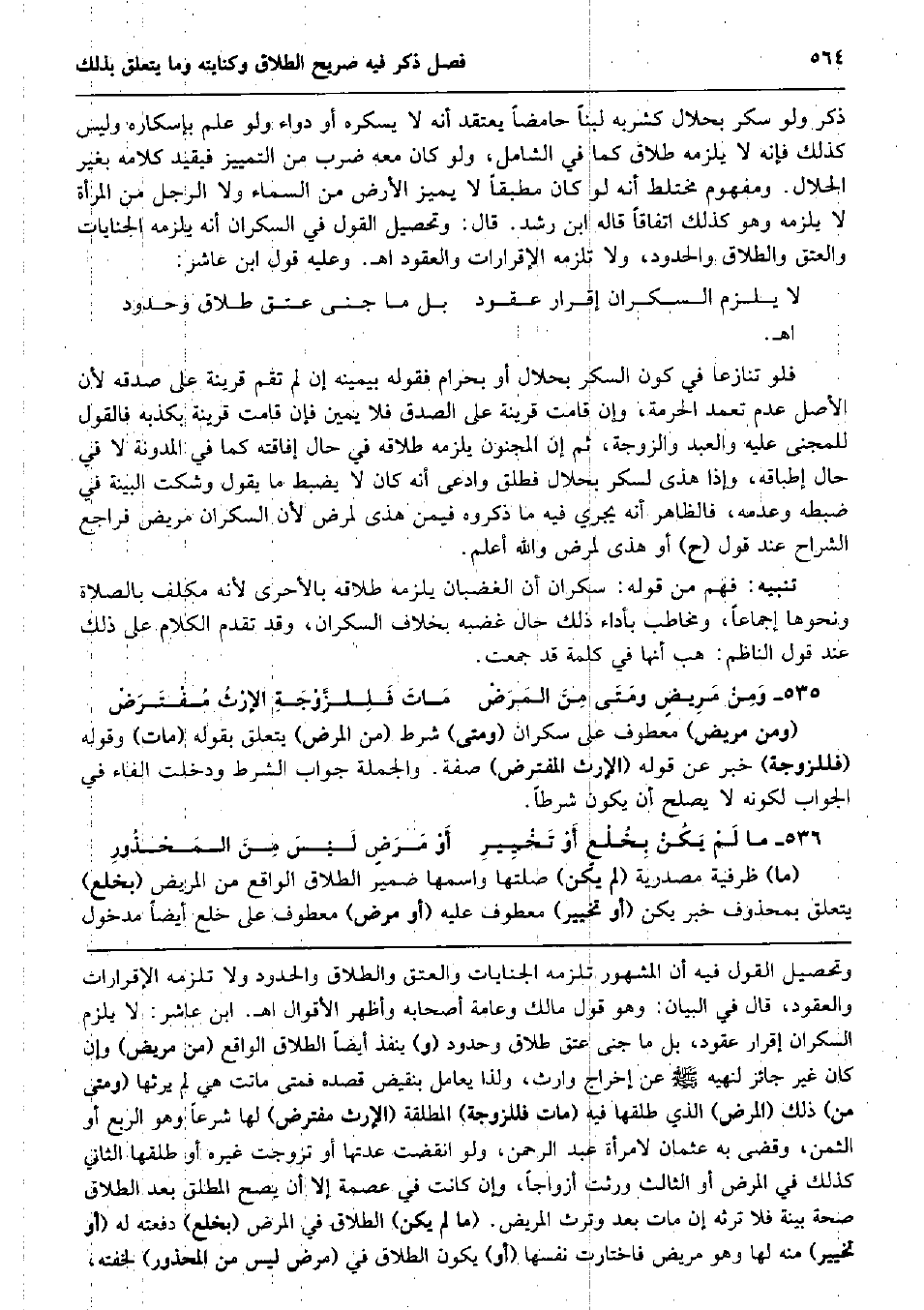 ذكر وَلَو سكر بحلال كشربه لَبَنًا حامضاً يعْتَقد أَنه لَا يسكره أَو دَوَاء وَلَو علم بإسكاره وَلَيْسَ كَذَلِك فَإِنَّهُ لَا يلْزمه طَلَاق كَمَا فِي الشَّامِل، وَلَو كَانَ مَعَه ضرب من التَّمْيِيز فيقيد كَلَامه بِغَيْر الْحَلَال. وَمَفْهُوم مختلط أَنه لَو كَانَ مطبقاً لَا يُمَيّز الأَرْض من السَّمَاء وَلَا الرجل من الْمَرْأَة لَا يلْزمه وَهُوَ كَذَلِك اتِّفَاقًا قَالَه ابْن رشد. قَالَ: وَتَحْصِيل القَوْل فِي السَّكْرَان أَنه يلْزمه الْجِنَايَات وَالْعِتْق وَالطَّلَاق وَالْحُدُود، وَلَا تلْزمهُ الإقرارات والعقود اه. وَعَلِيهِ قَول ابْن عَاشر: لَا يلْزم السَّكْرَان إِقْرَار عُقُود بل مَا جنى عتق طَلَاق وحدود اه. فَلَو تنَازعا فِي كَون السكر بحلال أَو بِحرَام فَقَوله بِيَمِينِهِ إِن لم تقم قرينَة على صدقه لِأَن الأَصْل عدم تعمد الْحُرْمَة وَإِن قَامَت قرينَة على الصدْق فَلَا يَمِين فَإِن قَامَت قرينَة بكذبه فَالْقَوْل للمجنى عَلَيْهِ وَالْعَبْد وَالزَّوْجَة، ثمَّ إِن الْمَجْنُون يلْزمه طَلَاقه فِي حَال إِفَاقَته كَمَا فِي الْمُدَوَّنَة لَا فِي حَال إطباقه، وَإِذا هذى لسكر بحلال فَطلق وَادّعى أَنه كَانَ لَا يضْبط مَا يَقُول وَشَكتْ الْبَيِّنَة فِي ضَبطه وَعَدَمه، فَالظَّاهِر أَنه يجْرِي فِيهِ مَا ذَكرُوهُ فِيمَن هذى لمَرض لِأَن السَّكْرَان مَرِيض فراجع الشُّرَّاح عِنْد قَول (ح) أَو هذى لمَرض وَالله أعلم. تَنْبِيه: فهم من قَوْله: سَكرَان أَن الغضبان يلْزمه طَلَاقه بالأحرى لِأَنَّهُ مُكَلّف بِالصَّلَاةِ وَنَحْوهَا إِجْمَاعًا، ومخاطب بأَدَاء ذَلِك حَال غَضَبه بِخِلَاف السَّكْرَان، وَقد تقدم الْكَلَام على ذَلِك عِنْد قَول النَّاظِم: هَب أَنَّهَا فِي كلمة قد جمعت. وَمِنْ مَرِيضٍ ومَتَى مِنَ المَرَضْ مَاتَ فَلِلزَّوْجَةِ الإرْثُ مُفْتَرَضْ (وَمن مَرِيض) مَعْطُوف على سَكرَان (وَمَتى) شَرط (من الْمَرَض) يتَعَلَّق بقوله (مَاتَ) وَقَوله (فللزوجة) خبر عَن قَوْله (الْإِرْث المفترض) صفة. وَالْجُمْلَة جَوَاب الشَّرْط وَدخلت الْفَاء فِي الْجَواب لكَونه لَا يصلح أَن يكون شرطا. مَا لَمْ يَكُنْ بِخُلْعٍ أَوْ تَخْيِيرِ أَوْ مَرَضٍ لَيْسَ مِنَ المَحْذُورِ (مَا) ظرفية مَصْدَرِيَّة (لم يكن) صلتها وَاسْمهَا ضمير الطَّلَاق الْوَاقِع من الْمَرِيض (بخلع) يتَعَلَّق بِمَحْذُوف خبر يكن (أَو تَخْيِير) مَعْطُوف عَلَيْهِ (أَو مرض) مَعْطُوف على خلع أَيْضا مَدْخُول