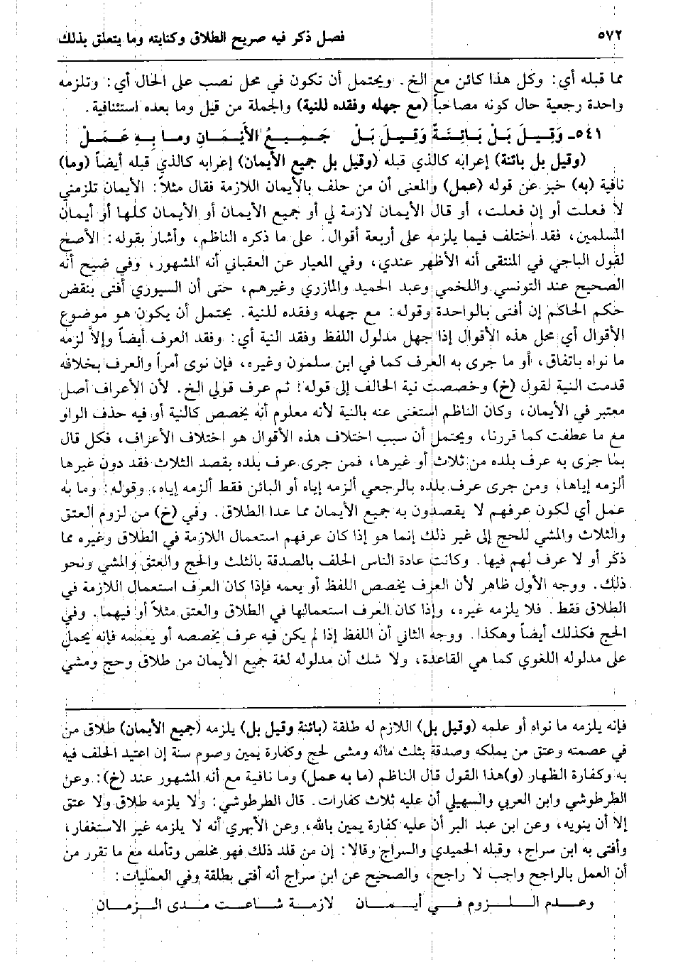مِمَّا قبله أَي: وكل هَذَا كَائِن مَعَ الخ. وَيحْتَمل أَن تكون فِي مَحل نصب على الْحَال أَي: وَتلْزَمهُ وَاحِدَة رَجْعِيَّة حَال كَونه مصاحباً (مَعَ جَهله وفقده للنِّيَّة) وَالْجُمْلَة من قيل وَمَا بعده استئنافية. وَقِيلَ بَلْ بَائِنَةٌ وَقِيلَ بَلْ جَمِيعُ الأَيْمَانِ وَمَا بِهِ عَمَلْ (وَقيل بل بَائِنَة) إعرابه كَالَّذي قبله (وَقيل بل جَمِيع الْأَيْمَان) إعرابه كَالَّذي قبله أَيْضا (وَمَا) نَافِيَة (بِهِ) خبر عَن قَوْله (عمل) وَالْمعْنَى أَن من حلف بالأيمان اللَّازِمَة فَقَالَ مثلا: الْأَيْمَان تلزمني لَا فعلت أَو إِن فعلت، أَو قَالَ الْأَيْمَان لَازِمَة لي أَو جَمِيع الْأَيْمَان أَو الْأَيْمَان كلهَا أَو أَيْمَان الْمُسلمين، فقد اخْتلف فِيمَا يلْزمه على أَرْبَعَة أَقْوَال. على مَا ذكره النَّاظِم، وَأَشَارَ بقوله: الْأَصَح لقَوْل الْبَاجِيّ فِي الْمُنْتَقى أَنه الْأَظْهر عِنْدِي، وَفِي المعيار عَن العقباني أَنه الْمَشْهُور، وَفِي ضيح أَنه الصَّحِيح عِنْد التّونسِيّ وَاللَّخْمِيّ وَعبد الحميد والمازري وَغَيرهم، حَتَّى أَن السيوري أفتى بِنَقْض حكم الْحَاكِم إِن أفتى بالواحدة وَقَوله: مَعَ جَهله وفقده للنِّيَّة. يحْتَمل أَن يكون هُوَ مَوْضُوع الْأَقْوَال أَي مَحل هَذِه الْأَقْوَال إِذا جهل مَدْلُول اللَّفْظ وفقد النِّيَّة أَي: وفقد الْعرف أَيْضا وإلاَّ لزمَه مَا نَوَاه بِاتِّفَاق، أَو مَا جرى بِهِ الْعرف كَمَا فِي ابْن سَلمُون وَغَيره، فَإِن نوى أمرا وَالْعرْف بِخِلَافِهِ قدمت النِّيَّة لقَوْل (خَ) وخصصت نِيَّة الْحَالِف إِلَى قَوْله: ثمَّ عرف قولي الخ. لِأَن الْأَعْرَاف أصل مُعْتَبر فِي الْأَيْمَان، وَكَانَ النَّاظِم اسْتغنى عَنهُ بِالنِّيَّةِ لِأَنَّهُ مَعْلُوم أَنه يخصص كالنية أَو فِيهِ حذف الْوَاو مَعَ مَا عطفت كَمَا قَررنَا، وَيحْتَمل أَن سَبَب اخْتِلَاف هَذِه الْأَقْوَال هُوَ اخْتِلَاف الْأَعْرَاف، فَكل قَالَ بِمَا جرى بِهِ عرف بَلَده من ثَلَاث أَو غَيرهَا، فَمن جرى عرف بَلَده بِقصد الثَّلَاث فقد دون غَيرهَا ألزمهُ إِيَّاهَا، وَمن جرى عرف بَلَده بالرجعي ألزمهُ إِيَّاه أَو الْبَائِن فَقَط ألزمهُ إِيَّاه، وَقَوله: وَمَا بِهِ عمل أَي لكَون عرفهم لَا يقصدون بِهِ جَمِيع الْأَيْمَان مِمَّا عدا الطَّلَاق. وَفِي (خَ) من لُزُوم الْعتْق وَالثَّلَاث وَالْمَشْي لِلْحَجِّ إِلَى غير ذَلِك إِنَّمَا هُوَ إِذا كَانَ عرفهم اسْتِعْمَال اللَّازِمَة فِي الطَّلَاق وَغَيره مِمَّا ذكر أَو لَا عرف لَهُم فِيهَا. وَكَانَت عَادَة النَّاس الْحلف بِالصَّدَقَةِ بِالثُّلثِ وَالْحج وَالْعِتْق وَالْمَشْي وَنَحْو ذَلِك. وَوجه الأول ظَاهر لِأَن الْعرف يخصص اللَّفْظ أَو يعمه فَإِذا كَانَ الْعرف اسْتِعْمَال اللَّازِمَة فِي الطَّلَاق فَقَط. فَلَا يلْزمه غَيره، وَإِذا كَانَ الْعرف اسْتِعْمَالهَا فِي الطَّلَاق وَالْعِتْق مثلا أَو فيهمَا. وَفِي الْحَج فَكَذَلِك أَيْضا وَهَكَذَا. وَوجه الثَّانِي أَن اللَّفْظ إِذا لم يكن فِيهِ عرف يخصصه أَو يعممه فَإِنَّهُ يحمل على مَدْلُوله اللّغَوِيّ كَمَا هِيَ الْقَاعِدَة، وَلَا شكّ أَن مَدْلُوله لُغَة جَمِيع الْأَيْمَان من طَلَاق وَحج ومشي