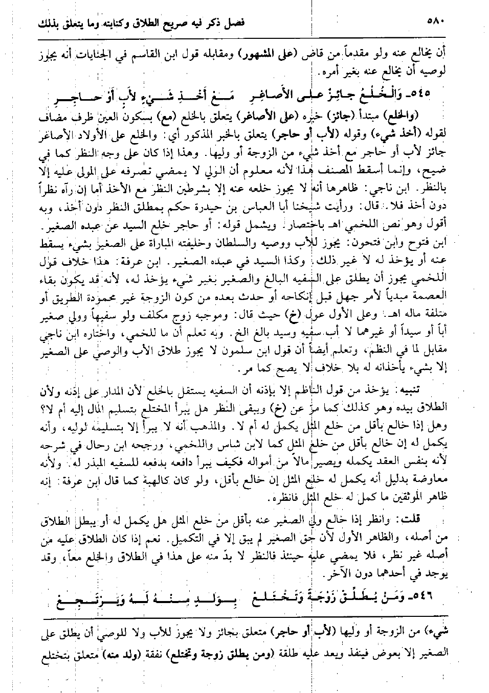 أَن يخالع عَنهُ وَلَو مقدما من قَاض (على الْمَشْهُور) وَمُقَابِله قَول ابْن الْقَاسِم فِي الْجِنَايَات أَنه يجوز لوصيه أَن يخالع عَنهُ بِغَيْر أمره. وَالْخُلْعُ جائِزٌ على الأَصاغِرِ مَعْ أَخْذِ شَيْءٍ لأَبٍ أَوْ حاجِرِ (وَالْخلْع) مُبْتَدأ (جَائِز) خَبره (على الأصاغر) يتَعَلَّق بِالْخلْعِ (مَعَ) بِسُكُون الْعين ظرف مُضَاف لقَوْله (أَخذ شَيْء) وَقَوله (لأَب أَو حاجر) يتَعَلَّق بالْخبر الْمَذْكُور أَي: وَالْخلْع على الْأَوْلَاد الأصاغر جَائِز لأَب أَو حاجر مَعَ أَخذ شَيْء من الزَّوْجَة أَو وَليهَا. وَهَذَا إِذا كَانَ على وَجه النّظر كَمَا فِي ضيح، وَإِنَّمَا أسقط المُصَنّف هَذَا لِأَنَّهُ مَعْلُوم أَن الْوَلِيّ لَا يمْضِي تصرفه على الْمولى عَلَيْهِ إِلَّا بِالنّظرِ. ابْن نَاجِي: ظَاهرهَا أَنه لَا يجوز خلعه عَنهُ إِلَّا بِشَرْطَيْنِ النّظر مَعَ الْأَخْذ أما إِن رَآهُ نظرا دون أَخذ فَلَا. قَالَ: وَرَأَيْت شَيخنَا أَبَا الْعَبَّاس بن حيدرة حكم بِمُطلق النّظر دون أَخذ، وَبِه أَقُول وَهُوَ نَص اللَّخْمِيّ اه بِاخْتِصَار. ويشمل قَوْله: أَو حاجر خلع السَّيِّد عَن عَبده الصَّغِير. ابْن فتوح وَابْن فتحون: يجوز للْأَب ووصيه وَالسُّلْطَان وخليفته المباراة على الصَّغِير بِشَيْء يسْقط عَنهُ أَو يُؤْخَذ لَهُ لَا غير ذَلِك. وَكَذَا السَّيِّد فِي عَبده الصَّغِير. ابْن عَرَفَة: هَذَا خلاف قَول اللَّخْمِيّ يجوز أَن يُطلق على السَّفِيه الْبَالِغ وَالصَّغِير بِغَيْر شَيْء يُؤْخَذ لَهُ، لِأَنَّهُ قد يكون بَقَاء الْعِصْمَة مبدياً لأمر جهل قبل إنكاحه أَو حدث بعده من كَون الزَّوْجَة غير محمودة الطَّرِيق أَو متلفة مَاله اه. وعَلى الأول عول (خَ) حَيْثُ قَالَ: وموجبه زوج مُكَلّف وَلَو سَفِيها وَولي صَغِير أَبَا أَو سيداً أَو غَيرهمَا لَا أَب سَفِيه وَسيد بَالغ الخ. وَبِه تعلم أَن مَا للخمي، وَاخْتَارَهُ ابْن نَاجِي مُقَابل لما فِي النّظم، وَتعلم أَيْضا أَن قَول ابْن سَلمُون لَا يجوز طَلَاق الْأَب وَالْوَصِيّ على الصَّغِير إِلَّا بِشَيْء يأخذانه لَهُ بِلَا خلاف لَا يَصح كَمَا مر. تَنْبِيه: يُؤْخَذ من قَول النَّاظِم إِلَّا بِإِذْنِهِ أَن السَّفِيه يسْتَقلّ بِالْخلْعِ لِأَن الْمدَار على إِذْنه وَلِأَن الطَّلَاق بِيَدِهِ وَهُوَ كَذَلِك كَمَا مرّ عَن (خَ) وَيبقى النّظر هَل يبرأ المختلع بِتَسْلِيم المَال إِلَيْهِ أم لَا؟ وَهل إِذا خَالع بِأَقَلّ من خلع الْمثل يكمل لَهُ أم لَا. وَالْمذهب أَنه لَا يبرأ إِلَّا بِتَسْلِيمِهِ لوَلِيِّه، وَأَنه يكمل لَهُ إِن خَالع بِأَقَلّ من خلع الْمثل كَمَا لِابْنِ شَاس وَاللَّخْمِيّ، وَرجحه ابْن رحال فِي شَرحه لِأَنَّهُ بِنَفس العقد يكمله وَيصير مَالا من أَمْوَاله فَكيف يبرأ دافعه بِدَفْعِهِ للسفيه المبذر لَهُ. وَلِأَنَّهُ مُعَاوضَة بِدَلِيل أَنه يكمل لَهُ خلع الْمثل إِن خَالع بِأَقَلّ، وَلَو كَانَ كَالْهِبَةِ كَمَا قَالَ ابْن عَرَفَة: إِنَّه ظَاهر الموثقين مَا كمل لَهُ خلع الْمثل فَانْظُرْهُ. قلت: وَانْظُر إِذا خَالع ولي الصَّغِير عَنهُ بِأَقَلّ من خلع الْمثل هَل يكمل لَهُ أَو يبطل الطَّلَاق من أَصله، وَالظَّاهِر الأول لِأَن حق الصَّغِير لم يبْق إِلَّا فِي التَّكْمِيل. نعم إِذا كَانَ الطَّلَاق عَلَيْهِ من أَصله غير نظر، فَلَا يمْضِي عَلَيْهِ حِينَئِذٍ فالنظر لَا بدّ مِنْهُ على هَذَا فِي الطَّلَاق وَالْخلْع مَعًا، وَقد يُوجد فِي أَحدهمَا دون الآخر. وَمَنْ يُطَلِّقْ زَوْجَةً وَتَخْتَلعْ بِوَلدٍ مِنْهُ لَهُ وَيَرْتَجِعْ