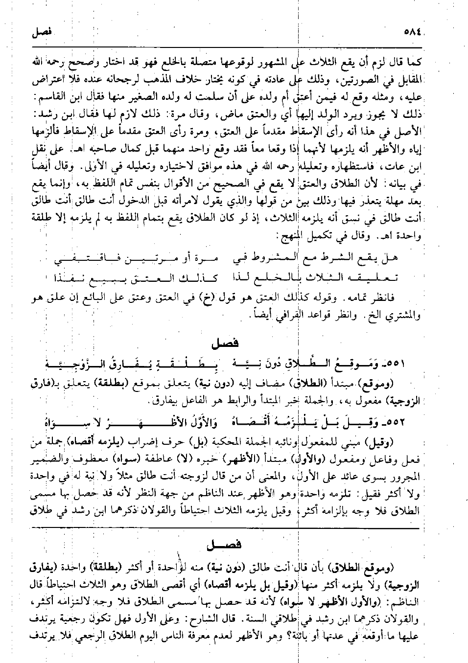 وَمَوقِعُ الطَّلاقِ دُونَ نِيَّهْ بِطَلْقَةٍ يُفَارِقُ الزَّوْجِيَّهْ (وموقع) مُبْتَدأ (الطَّلَاق) مُضَاف إِلَيْهِ (دون نِيَّة) يتَعَلَّق بموقع (بِطَلْقَة) يتَعَلَّق ب (فَارق الزَّوْجِيَّة) مفعول بِهِ، وَالْجُمْلَة خبر الْمُبْتَدَأ والرابط هُوَ الْفَاعِل بيفارق. وَقِيلَ بَلْ يَلْزَمُهُ أَقْصَاهُ وَالأَوَّلُ الأظْهَرُ لَا سِوَاهُ (وَقيل) مَبْنِيّ للْمَفْعُول ونائبه الْجُمْلَة المحكية (بل) حرف إضراب (يلْزمه أقصاه) جملَة من فعل وفاعل ومفعول (وَالْأول) مُبْتَدأ (الْأَظْهر) خَبره (لَا) عاطفة (سواهُ) مَعْطُوف وَالضَّمِير الْمَجْرُور بسوى عَائِد على الأول، وَالْمعْنَى أَن من قَالَ لزوجته أَنْت طَالِق مثلا وَلَا نِيَّة لَهُ فِي وَاحِدَة وَلَا أَكثر فَقيل: تلْزمهُ وَاحِدَة وَهُوَ الْأَظْهر عِنْد النَّاظِم من جِهَة النّظر لِأَنَّهُ قد حصل بهَا مُسَمّى الطَّلَاق فَلَا وَجه بإلزامه أَكثر، وَقيل يلْزمه الثَّلَاث احْتِيَاطًا وَالْقَوْلَان ذكرهمَا ابْن رشد فِي طَلَاق