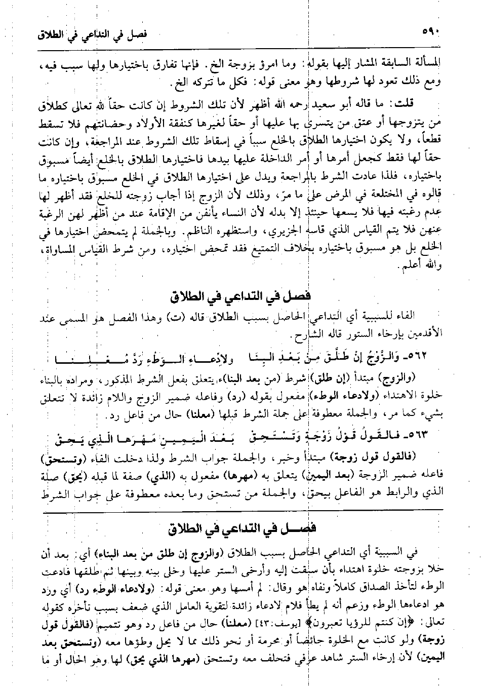 الْفَاء للسَّبَبِيَّة أَي التداعي الْحَاصِل بِسَبَب الطَّلَاق قَالَه (ت) وَهَذَا الْفَصْل هُوَ الْمُسَمّى عِنْد الأقدمين بإرخاء الستور قَالَه الشَّارِح. وَالزَّوْجُ إنْ طَلَّقَ مِنْ بَعْدِ البِنَا ولاِدِّعاءِ الوَطْءِ رَدَّ مُعْلِنا (وَالزَّوْج) مُبْتَدأ (إِن طلق) شَرط (من بعد الْبَنَّا) ء يتَعَلَّق بِفعل الشَّرْط الْمَذْكُور، وَمرَاده بِالْبِنَاءِ خلْوَة الاهتداء (ولادعاء الْوَطْء) مفعول بقوله (رد) وفاعله ضمير الزَّوْج وَاللَّام زَائِدَة لَا تتَعَلَّق بِشَيْء كَمَا مر، وَالْجُمْلَة معطوفة على جملَة الشَّرْط قبلهَا (مُعْلنا) حَال من فَاعل رد. فالقَولُ قَوْلُ زَوْجَةٍ وَتَسْتَحِقْ بَعْدَ الْيَمِينِ مَهْرَها الّذِي يَحِقْ (فَالْقَوْل قَول زَوْجَة) مُبْتَدأ وَخبر، وَالْجُمْلَة جَوَاب الشَّرْط وَلذَا دخلت الْفَاء (وتستحق) فَاعله ضمير الزَّوْجَة (بعد الْيَمين) يتَعَلَّق بِهِ (مهرهَا) مفعول بِهِ (الَّذِي) صفة لما قبله (يحِق) صلَة الَّذِي والرابط هُوَ الْفَاعِل بيحق، وَالْجُمْلَة من تسْتَحقّ وَمَا بعده معطوفة على جَوَاب الشَّرْط
