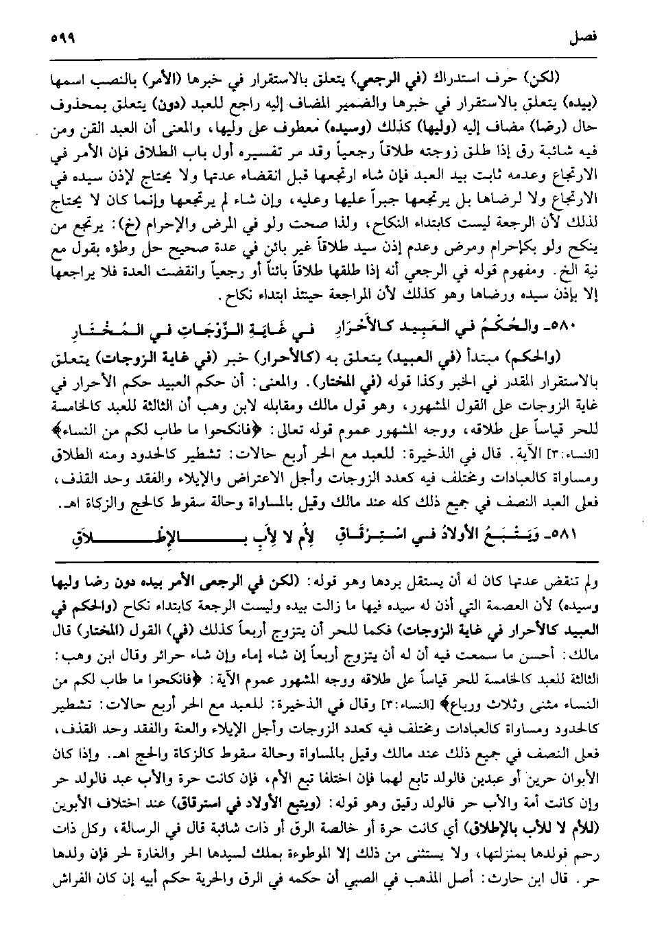 (لَكِن) حرف اسْتِدْرَاك (فِي الرَّجْعِيّ) يتَعَلَّق بالاستقرار فِي خَبَرهَا (الْأَمر) بِالنّصب اسْمهَا (بِيَدِهِ) يتَعَلَّق بالاستقرار فِي خَبَرهَا وَالضَّمِير الْمُضَاف إِلَيْهِ رَاجع للْعَبد (دون) يتَعَلَّق بِمَحْذُوف حَال (رضَا) مُضَاف إِلَيْهِ (وَليهَا) كَذَلِك (وسيده) مَعْطُوف على وَليهَا، وَالْمعْنَى أَن العَبْد الْقِنّ وَمن فِيهِ شَائِبَة رق إِذا طلق زَوجته طَلَاقا رَجْعِيًا وَقد مر تَفْسِيره أول بَاب الطَّلَاق فَإِن الْأَمر فِي الارتجاع وَعَدَمه ثَابت بيد العَبْد فَإِن شَاءَ ارتجعها قبل انْقِضَاء عدتهَا وَلَا يحْتَاج لإذن سَيّده فِي الارتجاع وَلَا لرضاها بل يرتجعها جبرا عَلَيْهَا وَعَلِيهِ، وَإِن شَاءَ لم يرتجعها وَإِنَّمَا كَانَ لَا يحْتَاج لذَلِك لِأَن الرّجْعَة لَيست كابتداء النِّكَاح، وَلذَا صحت وَلَو فِي الْمَرَض وَالْإِحْرَام (خَ) : يرتجع من ينْكح وَلَو بكإحرام وَمرض وَعدم إِذن سيد طَلَاقا غير بَائِن فِي عدَّة صَحِيح حل وَطْؤُهُ بقول مَعَ نِيَّة الخ. وَمَفْهُوم قَوْله فِي الرَّجْعِيّ أَنه إِذا طَلقهَا طَلَاقا بَائِنا أَو رَجْعِيًا وَانْقَضَت الْعدة فَلَا يُرَاجِعهَا إِلَّا بِإِذن سَيّده ورضاها وَهُوَ كَذَلِك لِأَن الْمُرَاجَعَة حِينَئِذٍ ابْتِدَاء نِكَاح. والحُكْمُ فِي العَبِيد كالأَحْرَارِ فِي غَايَةِ الزَّوْجَاتِ فِي المُخْتَارِ (وَالْحكم) مُبْتَدأ (فِي العبيد) يتَعَلَّق بِهِ (كالأحرار) خبر (فِي غَايَة الزَّوْجَات) يتَعَلَّق بالاستقرار الْمُقدر فِي الْخَبَر وَكَذَا قَوْله (فِي الْمُخْتَار) . وَالْمعْنَى: أَن حكم العبيد حكم الْأَحْرَار فِي غَايَة الزَّوْجَات على القَوْل الْمَشْهُور، وَهُوَ قَول مَالك وَمُقَابِله لِابْنِ وهب أَن الثَّالِثَة للْعَبد كالخامسة للْحرّ قِيَاسا على طَلَاقه، وَوجه الْمَشْهُور عُمُوم قَوْله تَعَالَى: فانكحوا مَا طَابَ لكم من النِّسَاء} (النِّسَاء: 3) الْآيَة. قَالَ فِي الذَّخِيرَة: للْعَبد مَعَ الْحر أَربع حالات: تشطير كالحدود وَمِنْه الطَّلَاق ومساواة كالعبادات ومختلف فِيهِ كعدد الزَّوْجَات وَأجل الِاعْتِرَاض وَالْإِيلَاء والفقد وحد الْقَذْف، فعلى العَبْد النّصْف فِي جَمِيع ذَلِك كُله عِنْد مَالك وَقيل بالمساواة وَحَالَة سُقُوط كَالْحَجِّ وَالزَّكَاة اه. وَيَتْبَعُ الأولادُ فِي اسْتِرْقَاقِ لأُم لَا لأَبِ بالإِطْلاَقِ