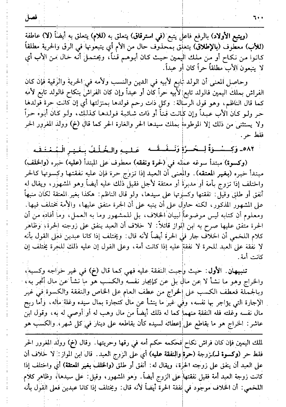 (وَيتبع الْأَوْلَاد) بِالرَّفْع فَاعل يتبع (فِي استرقاق) يتَعَلَّق بِهِ (للام) يتَعَلَّق بِهِ أَيْضا (لَا) عاطفة (للْأَب) مَعْطُوف (بِالْإِطْلَاقِ) يتَعَلَّق بِمَحْذُوف حَال من الْأُم أَي يتبعونها فِي الرّقّ وَالْحريَّة مُطلقًا كَانُوا من نِكَاح أَو من ملك الْيَمين حَيْثُ كَانَ أبوهم قِنَا، وَيحْتَمل أَنه حَال من الْأَب أَي لَا يتبعُون الْأَب مُطلقًا حرا كَانَ أَو عبدا. وَحَاصِل الْمَعْنى أَن الْوَلَد تَابع لِأَبِيهِ فِي الدّين وَالنّسب ولأمه فِي الْحُرِّيَّة والرقية فَإِن كَانَ الْفراش بِملك الْيَمين فَالْوَلَد تَابع لِأَبِيهِ حرا كَانَ أَو عبدا وَإِن كَانَ الْفراش بِنِكَاح فَالْوَلَد تَابع لأمه كَمَا قَالَ النَّاظِم، وَهُوَ قَول الرسَالَة: وكل ذَات رحم فولدها بمنزلتها أَي إِن كَانَت حرَّة فولدها حر وَلَو كَانَ الْأَب عبدا وَإِن كَانَت قِنَا أَو ذَات شَائِبَة فولدها كَذَلِك، وَلَو كَانَ أَبوهُ حرا وَلَا يسْتَثْنى من ذَلِك إِلَّا الْمَوْطُوءَة بِملك سَيِّدهَا الْحر والغارة الْحر كَمَا قَالَ (خَ) وَولد الْمَغْرُور الْحر فَقَط حر. وَكِسْوَةٌ لِحُرَّةٍ وَنَفَقَه عَليهِ والخُلْفُ بِغَيْرِ الْمُعْتَقَه (وَكِسْوَة) مُبْتَدأ سوغه عمله فِي (لحرة ونفقه) مَعْطُوف على الْمُبْتَدَأ (عَلَيْهِ) خَبره (وَالْخلف) مُبْتَدأ خَبره (بِغَيْر المعتقه) . وَالْمعْنَى أَن العَبْد إِذا تزوج حرَّة فَإِن عَلَيْهِ نَفَقَتهَا وكسوتها كَالْحرِّ وَاخْتلف إِذا تزوج بِأمة أَو مُدبرَة أَو مُعتقة لأجل فَقيل ذَلِك عَلَيْهِ أَيْضا وَهُوَ الْمَشْهُور، وَيُقَال لَهُ أنْفق أَو طلق وَقيل: نَفَقَتهَا وكسوتها على سَيِّدهَا، وَلَو قَالَ النَّاظِم: هَكَذَا بِغَيْر الْمُعتقَة لَكَانَ منبهاً على الْمَشْهُور الْمَذْكُور، لكنه حاول على أَن يُنَبه على أَن الْحرَّة مُتَّفق عَلَيْهَا وَالْأمة مُخْتَلف فِيهَا. وَمَعْلُوم أَن كِتَابه لَيْسَ مَوْضُوعا لبَيَان الْخلاف، بل للمشهور وَمَا بِهِ الْعَمَل، وَمَا أَفَادَهُ من أَن الْحرَّة مُتَّفق عَلَيْهَا صرح بِهِ ابْن الْمَوَّاز قَائِلا: لَا خلاف أَن العَبْد ينْفق على زَوجته الْحرَّة، وَظَاهر كَلَام اللَّخْمِيّ أَن الْخلاف جَار فِي الْحرَّة أَيْضا لِأَنَّهُ قَالَ: وَيخْتَلف إِذا كَانَا عَبْدَيْنِ فعلى القَوْل بِأَنَّهُ لَا نَفَقَة على العَبْد للْحرَّة لَا نَفَقَة عَلَيْهِ إِذا كَانَت أمة، وعَلى القَوْل إِن عَلَيْهِ ذَلِك للْحرَّة يخْتَلف إِن كَانَت أمة. تَنْبِيهَانِ. الأول: حَيْثُ وَجَبت النَّفَقَة عَلَيْهِ فَهِيَ كَمَا قَالَ (خَ) فِي غير خراجه وَكَسبه، وَالْخَرَاج وَهُوَ مَا نَشأ لَا عَن مَال بل عَن كإيجار نَفسه وَالْكَسْب هُوَ مَا نَشأ عَن مَال أتجر بِهِ، وَبِالْجُمْلَةِ فعطف الْكسْب على الْخراج من عطف الْعَام على الْخَاص وَالنَّفقَة وَالْكِسْوَة فِي غير الْإِجَارَة الَّتِي يُؤَاجر بهَا نَفسه، وَفِي غير مَا ينشأ عَن مَال كتجارة بِمَال سَيّده وغلة مَاله، وَأما ربح مَال نَفسه وغلته فَلهُ النَّفَقَة مِنْهُمَا كَمَا لَهُ ذَلِك أَيْضا من مَال وهب لَهُ أَو أوصِي لَهُ بِهِ، وَقَول ابْن عَاشر: الْخراج هُوَ مَا يقاطع على إِعْطَائِهِ لسَيِّده كَأَن يقاطعه على دِينَار فِي كل شهر، وَالْكَسْب هُوَ