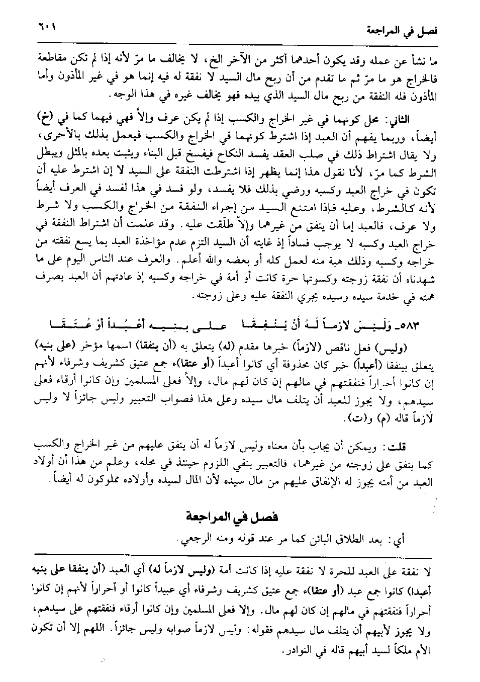 مَا نَشأ عَن عمله وَقد يكون أَحدهمَا أَكثر من الآخر الخ، لَا يُخَالف مَا مرّ لِأَنَّهُ إِذا لم تكن مقاطعة فالخراج هُوَ مَا مرّ ثمَّ مَا تقدم من أَن ربح مَال السَّيِّد لَا نَفَقَة لَهُ فِيهِ إِنَّمَا هُوَ فِي غير الْمَأْذُون وَأما الْمَأْذُون فَلهُ النَّفَقَة من ربح مَال السَّيِّد الَّذِي بِيَدِهِ فَهُوَ يُخَالف غَيره فِي هَذَا الْوَجْه. الثَّانِي: مَحل كَونهمَا فِي غير الْخراج وَالْكَسْب إِذا لم يكن عرف وإلاَّ فَهِيَ فيهمَا كَمَا فِي (خَ) أَيْضا، وَرُبمَا يفهم أَن العَبْد إِذا اشْترط كَونهمَا فِي الْخراج وَالْكَسْب فَيعْمل بذلك بالأحرى، وَلَا يُقَال اشْتِرَاط ذَلِك فِي صلب العقد يفْسد النِّكَاح فَيفْسخ قبل الْبناء وَيثبت بعده بِالْمثلِ وَيبْطل الشَّرْط كَمَا مرّ، لأَنا نقُول هَذَا إِنَّمَا يظْهر إِذا اشْترطت النَّفَقَة على السَّيِّد لَا إِن اشْترط عَلَيْهِ أَن تكون فِي خراج العَبْد وَكَسبه وَرَضي بذلك فَلَا يفْسد، وَلَو فسد فِي هَذَا لفسد فِي الْعرف أَيْضا لِأَنَّهُ كالشرط، وَعَلِيهِ فَإِذا امْتنع السَّيِّد من إِجْرَاء النَّفَقَة من الْخراج وَالْكَسْب وَلَا شَرط وَلَا عرف، فَالْعَبْد إِمَّا أَن ينْفق من غَيرهمَا وإلاّ طلّقت عَلَيْهِ. وَقد علمت أَن اشْتِرَاط النَّفَقَة فِي خراج العَبْد وَكَسبه لَا يُوجب فَسَادًا إِذْ غَايَته أَن السَّيِّد الْتزم عدم مُؤَاخذَة العَبْد بِمَا يسع نَفَقَته من خراجه وَكَسبه وَذَلِكَ هبة مِنْهُ لعمل كُله أَو بعضه وَالله أعلم. وَالْعرْف عِنْد النَّاس الْيَوْم على مَا شهدناه أَن نَفَقَة زَوجته وكسوتها حرَّة كَانَت أَو أمة فِي خراجه وَكَسبه إِذْ عَادَتهم أَن العَبْد يصرف همته فِي خدمَة سَيّده وسيده يجْرِي النَّفَقَة عَلَيْهِ وعَلى زَوجته. وَلَيْسَ لَازِما لَهُ أَنْ يُنْفِقَا على بنِيه أعْبُداً أوْ عُتَقَا (وَلَيْسَ) فعل نَاقص (لَازِما) خَبَرهَا مقدم (لَهُ) يتَعَلَّق بِهِ (أَن ينفقا) اسْمهَا مُؤخر (على بنيه) يتَعَلَّق بينفقا (أعبداً) خبر كَانَ محذوفة أَي كَانُوا أعبداً (أَو عتقا) ء جمع عَتيق كشريف وشرفاء لأَنهم إِن كَانُوا أحراراً فنفقتهم فِي مَالهم إِن كَانَ لَهُم مَال، وإلاَّ فعلى الْمُسلمين وَإِن كَانُوا أرقاء فعلى سيدهم، وَلَا يجوز للْعَبد أَن يتْلف مَال سَيّده وعَلى هَذَا فصواب التَّعْبِير وَلَيْسَ جَائِزا لَا وَلَيْسَ لَازِما قَالَه (م) و (ت) . قلت: وَيُمكن أَن يُجَاب بِأَن مَعْنَاهُ وَلَيْسَ لَازِما لَهُ أَن ينْفق عَلَيْهِم من غير الْخراج وَالْكَسْب كَمَا ينْفق على زَوجته من غَيرهمَا، فالتعبير بِنَفْي اللُّزُوم حِينَئِذٍ فِي مَحَله، وَعلم من هَذَا أَن أَوْلَاد العَبْد من أمته يجوز لَهُ الْإِنْفَاق عَلَيْهِم من مَال سَيّده لِأَن المَال لسَيِّده وَأَوْلَاده مملوكون لَهُ أَيْضا.