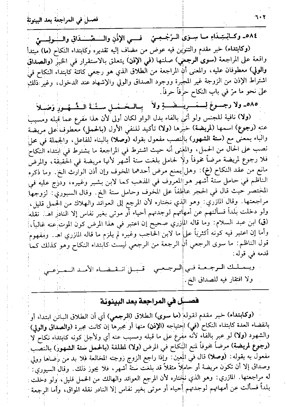 وكابْتِدَاءِ مَا سِوَى الرَّجْعِيِّ فِي الإذْنِ والصَّدَاقِ والولِيِّ (وكابتداء) خبر مقدم والتنوين فِيهِ عوض من مُضَاف إِلَيْهِ تَقْدِيره وكابتداء النِّكَاح (مَا) مُبْتَدأ وَاقعَة على الْمُرَاجَعَة (سوى الرَّجْعِيّ) صلتها (فِي الْإِذْن) يتَعَلَّق بالاستقرار فِي الْخَبَر (وَالصَّدَاق وَالْوَلِيّ) معطوفان عَلَيْهِ، وَالْمعْنَى أَن الْمُرَاجَعَة من الطَّلَاق الَّذِي هُوَ رَجْعِيّ كائنة كابتداء النِّكَاح فِي اشْتِرَاط الْإِذْن من الزَّوْجَة غير الْمُجبرَة وَوُجُود الصَدَاق وَالْوَلِيّ وَالْإِشْهَاد عِنْد الدُّخُول، وَغير ذَلِك على نَحْو مَا مرّ فِي بَاب النِّكَاح حرفا حرفا. وَلَا رجوعَ لِمَرِيضَةٍ ولاَ بِالحَمْلِ ستَّةَ الشُّهُورِ وَصَلاَ (وَلَا) نَافِيَة للْجِنْس وَلَو أَتَى بِالْفَاءِ بدل الْوَاو لَكَانَ أولى لِأَن هَذَا مُفَرع عَمَّا قبله ومسبب عَنهُ (رُجُوع) اسْمهَا (لمريضة) خَبَرهَا (وَلَا) تَأْكِيد للنَّفْي الأول (بِالْحملِ) مَعْطُوف على مَرِيضَة وَالْبَاء بِمَعْنى مَعَ (سِتَّة الشُّهُور) بِالنّصب مفعول بقوله (وصلا) بِالْبِنَاءِ للْفَاعِل، وَالْجُمْلَة فِي مَحل نصب على الْحَال من الْحمل، وَالْمعْنَى أَنه حَيْثُ اشْترط فِي الْمُرَاجَعَة مَا يشْتَرط فِي ابْتِدَاء النِّكَاح فَلَا رُجُوع لمريضة مَرضا مخوفا وَلَا لحامل بلغت سِتَّة أشهر لِأَنَّهَا مَرِيضَة فِي الْحَقِيقَة، وَالْمَرَض مَانع من عقد النِّكَاح (خَ) : وَهل يمْنَع مرض أَحدهمَا الْمخوف وَإِن أذن الْوَارِث الخ. وَمَا ذكره النَّاظِم فِي حَامِل سِتَّة أشهر هُوَ الْمَعْرُوف فِي الْمَذْهَب كَمَا لِابْنِ بشير وَغَيره، ودرج عَلَيْهِ فِي الْمُخْتَصر حَيْثُ قَالَ فِي الْحجر عاطفاً على الْمخوف وحامل سِتَّة الخ. وَقَالَ السيوري: لزَوجهَا مراجعتها. وَقَالَ الْمَازرِيّ: وَهُوَ الَّذِي نختاره لِأَن الْمرجع إِلَى العوائد والهلاك من الْحمل قَلِيل، وَلَو دخلت بَلَدا فسألتهم عَن أمهاتهم لوجدتهم أَحيَاء أَو موتى بِغَيْر نِفَاس إِلَّا النَّادِر اه. نَقله (ق) ابْن عبد السَّلَام: وَمَا قَالَه الْمَازرِيّ صَحِيح إِن اعْتبر فِي هَذَا الْمَرَض كَون الْمَوْت عَنهُ غَالِبا، وَأما إِن اعْتبر فِيهِ كَونه أكثرياً على مَا لِابْنِ الْحَاجِب وَغَيره لم يلْزم مَا قَالَه الْمَازرِيّ اه. وَمَفْهُوم قَول النَّاظِم: مَا سوى الرَّجْعِيّ أَن الرّجْعَة من الرَّجْعِيّ لَيست كابتداء النِّكَاح وَهُوَ كَذَلِك كَمَا قدمه فِي قَوْله: وَيملك الرّجْعَة فِي الرَّجْعِيّ قبل انْقِضَاء الأمد المرعي وَلَا افتقار فِيهِ للصداق الخ.