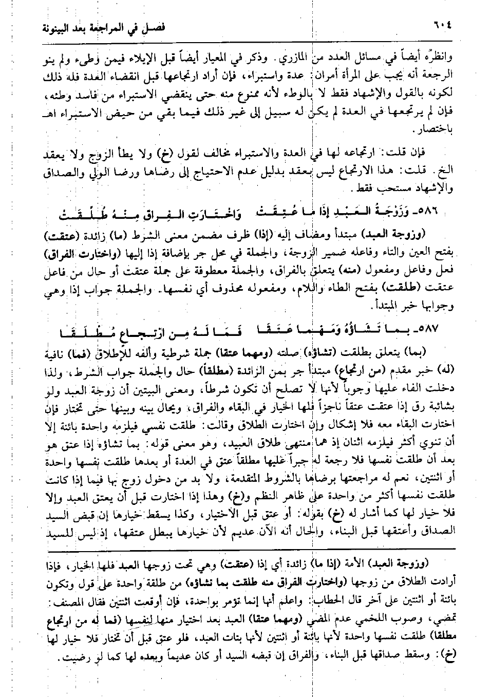 وانظره أَيْضا فِي مسَائِل الْعدَد من الْمَازرِيّ. وَذكر فِي المعيار أَيْضا قبل الْإِيلَاء فِيمَن وطىء وَلم ينْو الرّجْعَة أَنه يجب على الْمَرْأَة أَمْرَانِ: عدَّة واستبراء، فَإِن أَرَادَ ارتجاعها قبل انْقِضَاء الْعدة فَلهُ ذَلِك لكَونه بالْقَوْل وَالْإِشْهَاد فَقَط لَا بِالْوَطْءِ لِأَنَّهُ مَمْنُوع مِنْهُ حَتَّى يَنْقَضِي الِاسْتِبْرَاء من فَاسد وَطئه، فَإِن لم يرتجعها فِي الْعدة لم يكن لَهُ سَبِيل إِلَى غير ذَلِك فِيمَا بَقِي من حيض الِاسْتِبْرَاء اه بِاخْتِصَار. فَإِن قلت: ارتجاعه لَهَا فِي الْعدة والاستبراء مُخَالف لقَوْل (خَ) وَلَا يطَأ الزَّوْج وَلَا يعْقد الخ. قلت: هَذَا الارتجاع لَيْسَ بِعقد بِدَلِيل عدم الِاحْتِيَاج إِلَى رِضَاهَا ورضا الْوَلِيّ وَالصَّدَاق وَالْإِشْهَاد مُسْتَحبّ فَقَط. وَزَوْجَةُ العَبْدِ إذَا مَا عُتِقَتْ وَاخْتَارَتِ الفِراق مِنْهُ طُلِّقَتْ (وَزَوْجَة العَبْد) مُبْتَدأ ومضاف إِلَيْهِ (إِذا) ظرف مضمن معنى الشَّرْط (مَا) زَائِدَة (عتقت) بِفَتْح الْعين وَالتَّاء وفاعله ضمير الزَّوْجَة، وَالْجُمْلَة فِي مَحل جر بِإِضَافَة إِذا إِلَيْهَا (واختارت الْفِرَاق) فعل وفاعل ومفعول (مِنْهُ) يتَعَلَّق بالفراق، وَالْجُمْلَة معطوفة على جملَة عتقت أَو حَال من فَاعل عتقت (طلقت) بِفَتْح الطَّاء وَاللَّام، ومفعوله مَحْذُوف أَي نَفسهَا. وَالْجُمْلَة جَوَاب إِذا وَهِي وجوابها خبر الْمُبْتَدَأ. بِمَا تَشَاؤُهُ وَمَهْما عَتَقَا فَمَا لَهُ مِن ارْتِجاعٍ مُطْلَقَا (بِمَا) يتَعَلَّق بطلقت (تشاؤه) صلته (وَمهما عتقا) جملَة شَرْطِيَّة وألفه للإطلاق (فَمَا) نَافِيَة (لَهُ) خبر مقدم (من ارتجاع) مُبْتَدأ جر بِمن الزَّائِدَة (مُطلقًا) حَال وَالْجُمْلَة جَوَاب الشَّرْط، وَلذَا دخلت الْفَاء عَلَيْهَا وجوبا لِأَنَّهَا لَا تصلح أَن تكون شرطا، وَمعنى الْبَيْتَيْنِ أَن زَوْجَة العَبْد وَلَو بشائبة رق إِذا عتقت عتقا ناجزاً فلهَا الْخِيَار فِي الْبَقَاء والفراق، ويحال بَينه وَبَينهَا حَتَّى تخْتَار فَإِن اخْتَارَتْ الْبَقَاء مَعَه فَلَا إِشْكَال وَإِن اخْتَارَتْ الطَّلَاق وَقَالَت: طلقت نَفسِي فَيلْزمهُ وَاحِدَة بَائِنَة إِلَّا أَن تنوي أَكثر فَيلْزمهُ اثْنَان إِذْ هما مُنْتَهى طَلَاق العبيد، وَهُوَ معنى قَوْله: بِمَا تشاؤه إِذا عتق هُوَ بعد أَن طلقت نَفسهَا فَلَا رَجْعَة لَهُ جبرا عَلَيْهَا مُطلقًا عتق فِي الْعدة أَو بعْدهَا طلقت نَفسهَا وَاحِدَة أَو اثْنَتَيْنِ نعم لَهُ مراجعتها بِرِضَاهَا بِالشُّرُوطِ الْمُتَقَدّمَة، وَلَا بُد من دُخُول زوج بهَا فِيمَا إِذا كَانَت طلقت نَفسهَا أَكثر من وَاحِدَة على ظَاهر النّظم و (خَ) وَهَذَا إِذا اخْتَارَتْ قبل أَن يعْتق العَبْد وَإِلَّا فَلَا خِيَار لَهَا كَمَا أَشَارَ لَهُ (خَ) بقوله: أَو عتق قبل الِاخْتِيَار، وَكَذَا يسْقط خِيَارهَا إِن قبض السَّيِّد الصَدَاق وأعتقها قبل الْبناء، وَالْحَال أَنه الْآن عديم لِأَن خِيَارهَا يبطل عتقهَا، إِذْ لَيْسَ للسَّيِّد