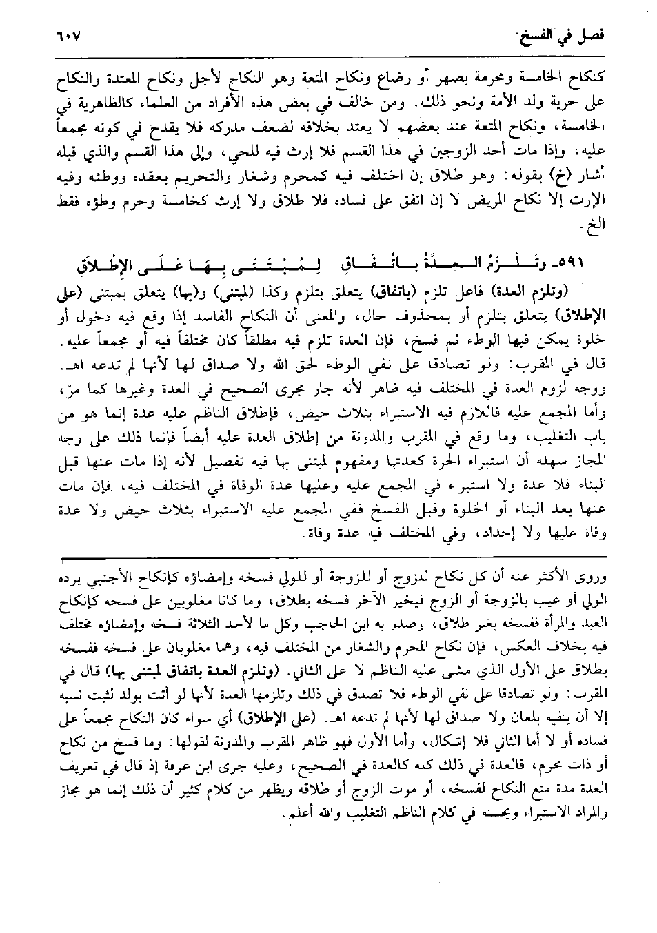 وَذَلِكَ كَنِكَاح الْخَامِسَة ومحرمة بصهر أَو رضَاع وَنِكَاح الْمُتْعَة وَهُوَ النِّكَاح لأجل وَنِكَاح الْمُعْتَدَّة وَالنِّكَاح على حريَّة ولد الْأمة وَنَحْو ذَلِك. وَمن خَالف فِي بعض هَذِه الْأَفْرَاد من الْعلمَاء كالظاهرية فِي الْخَامِسَة، وَنِكَاح الْمُتْعَة عِنْد بَعضهم لَا يعْتد بِخِلَافِهِ لضعف مدركه فَلَا يقْدَح فِي كَونه مجمعا عَلَيْهِ، وَإِذا مَاتَ أحد الزَّوْجَيْنِ فِي هَذَا الْقسم فَلَا إِرْث فِيهِ للحي، وَإِلَى هَذَا الْقسم وَالَّذِي قبله أَشَارَ (خَ) بقوله: وَهُوَ طَلَاق إِن اخْتلف فِيهِ كمحرم وشغار وَالتَّحْرِيم بعقده ووطئه وَفِيه الْإِرْث إِلَّا نِكَاح الْمَرِيض لَا إِن اتّفق على فَسَاده فَلَا طَلَاق وَلَا إِرْث كخامسة وَحرم وَطْؤُهُ فَقَط الخ. وتَلْزَمُ العِدَّةُ باتِّفَاقِ لِمُبْتَنَى بِهَا عَلَى الإِطْلاَقِ (وَتلْزم الْعدة) فَاعل تلْزم (بِاتِّفَاق) يتَعَلَّق بتلزم وَكَذَا (لمبتنى) و (بهَا) يتَعَلَّق بمبتنى (على الْإِطْلَاق) يتَعَلَّق بتلزم أَو بِمَحْذُوف حَال، وَالْمعْنَى أَن النِّكَاح الْفَاسِد إِذا وَقع فِيهِ دُخُول أَو خلْوَة يُمكن فِيهَا الْوَطْء ثمَّ فسخ، فَإِن الْعدة تلْزم فِيهِ مُطلقًا كَانَ مُخْتَلفا فِيهِ أَو مجمعا عَلَيْهِ. قَالَ فِي المقرب: وَلَو تَصَادقا على نفي الْوَطْء لحق الله وَلَا صدَاق لَهَا لِأَنَّهَا لم تَدعه اه. وَوجه لُزُوم الْعدة فِي الْمُخْتَلف فِيهِ ظَاهر لِأَنَّهُ جَار مجْرى الصَّحِيح فِي الْعدة وَغَيرهَا كَمَا مرّ، وَأما الْمجمع عَلَيْهِ فاللازم فِيهِ الِاسْتِبْرَاء بِثَلَاث حيض، فإطلاق النَّاظِم عَلَيْهِ عدَّة إِنَّمَا هُوَ من بَاب التغليب، وَمَا وَقع فِي المقرب والمدونة من إِطْلَاق الْعدة عَلَيْهِ أَيْضا فَإِنَّمَا ذَلِك على وَجه الْمجَاز سهله أَن اسْتِبْرَاء الْحرَّة كعدتها وَمَفْهُوم لمبتنى بهَا فِيهِ تَفْصِيل لِأَنَّهُ إِذا مَاتَ عَنْهَا قبل الْبناء فَلَا عدَّة وَلَا اسْتِبْرَاء فِي الْمجمع عَلَيْهِ وَعَلَيْهَا عدَّة الْوَفَاة فِي الْمُخْتَلف فِيهِ، فَإِن مَاتَ عَنْهَا بعد الْبناء أَو الْخلْوَة وَقبل الْفَسْخ فَفِي الْمجمع عَلَيْهِ الِاسْتِبْرَاء بِثَلَاث حيض وَلَا عدَّة وَفَاة عَلَيْهَا وَلَا إحداد، وَفِي الْمُخْتَلف فِيهِ عدَّة وَفَاة.