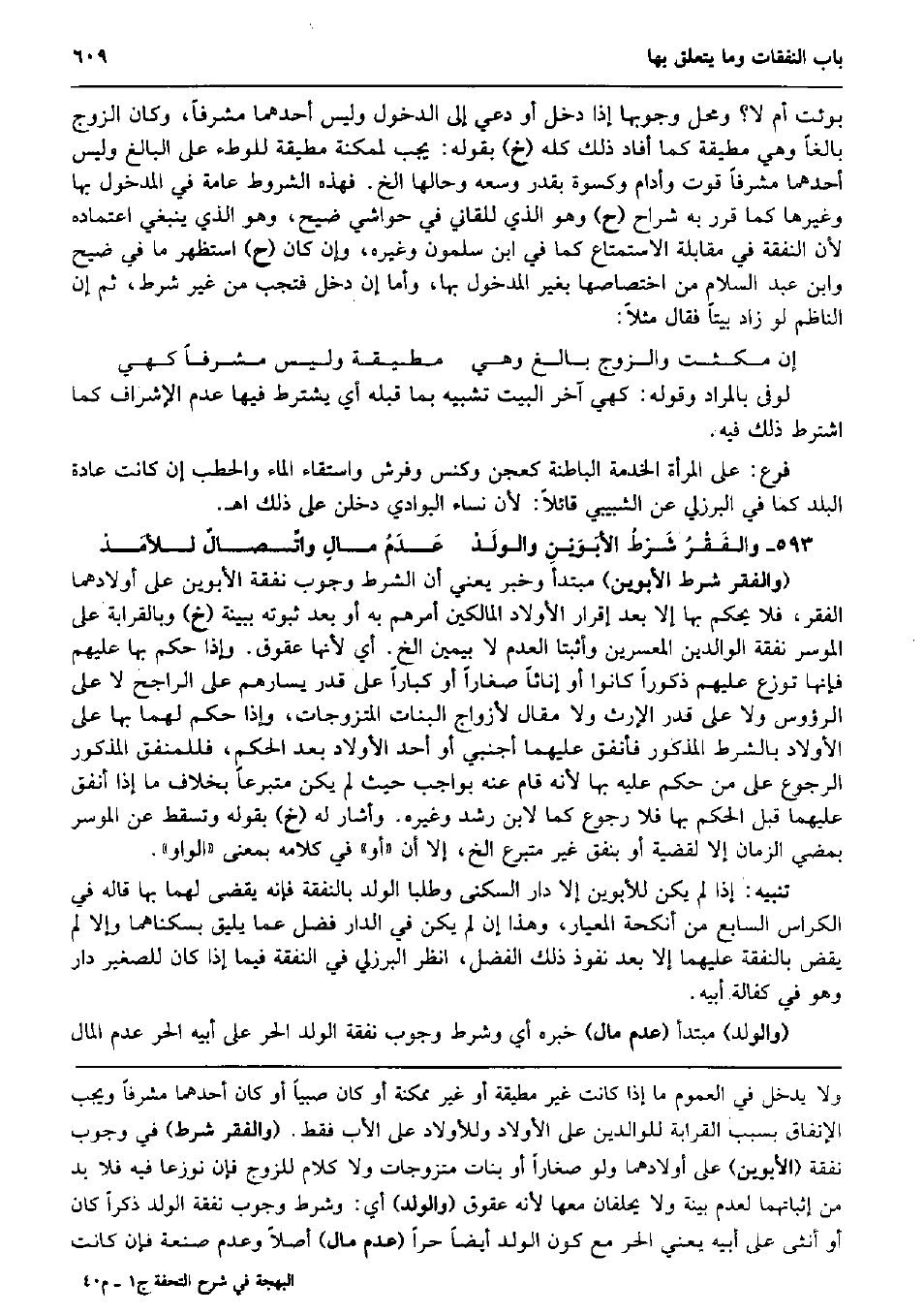 بوئت أم لَا؟ وَمحل وُجُوبهَا إِذا دخل أَو دعِي إِلَى الدُّخُول وَلَيْسَ أَحدهمَا مشرفاً، وَكَانَ الزَّوْج بَالغا وَهِي مطيقة كَمَا أَفَادَ ذَلِك كُله (خَ) بقوله: يجب لممكنة مطيقة للْوَطْء على الْبَالِغ وَلَيْسَ أَحدهمَا مشرفاً قوت وأدام وَكِسْوَة بِقدر وَسعه وحالها الخ. فَهَذِهِ الشُّرُوط عَامَّة فِي الْمَدْخُول بهَا وَغَيرهَا كَمَا قرر بِهِ شرَّاح (ح) وَهُوَ الَّذِي للقاني فِي حَوَاشِي ضيح، وَهُوَ الَّذِي يَنْبَغِي اعْتِمَاده لِأَن النَّفَقَة فِي مُقَابلَة الِاسْتِمْتَاع كَمَا فِي ابْن سَلمُون وَغَيره، وَإِن كَانَ (ح) استظهر مَا فِي ضيح وَابْن عبد السَّلَام من اختصاصها بِغَيْر الْمَدْخُول بهَا، وَأما إِن دخل فَتجب من غير شَرط، ثمَّ إِن النَّاظِم لَو زَاد بَيْتا فَقَالَ مثلا: إِن مكثت وَالزَّوْج بَالغ وَهِي مطيقة وَلَيْسَ مشرفاً كهي لوفى بالمراد وَقَوله: كهي آخر الْبَيْت تَشْبِيه بِمَا قبله أَي يشْتَرط فِيهَا عدم الإشراف كَمَا اشْترط ذَلِك فِيهِ. فرع: على الْمَرْأَة الْخدمَة الْبَاطِنَة كعجن وكنس وفرش واستقاء المَاء والحطب إِن كَانَت عَادَة الْبَلَد كَمَا فِي الْبُرْزُليّ عَن الشبيبي قَائِلا: لِأَن نسَاء الْبَوَادِي دخلن على ذَلِك اه. والفَقْرُ شَرْطُ الأبَوَيْنِ والولَدْ عَدَمُ مالٍ واتِّصالٌ للأمَدْ (والفقر شَرط الْأَبَوَيْنِ) مُبْتَدأ وَخبر يَعْنِي أَن الشَّرْط وجوب نَفَقَة الْأَبَوَيْنِ على أولادهما الْفقر، فَلَا يحكم بهَا إِلَّا بعد إِقْرَار الْأَوْلَاد المالكين أَمرهم بِهِ أَو بعد ثُبُوته بِبَيِّنَة (خَ) وبالقرابة على الْمُوسر نَفَقَة الْوَالِدين المعسرين وأثبتا الْعَدَم لَا بِيَمِين الخ. أَي لِأَنَّهَا عقوق. وَإِذا حكم بهَا عَلَيْهِم فَإِنَّهَا توزع عَلَيْهِم ذُكُورا كَانُوا أَو إِنَاثًا صغَارًا أَو كبارًا على قدر يسارهم على الرَّاجِح لَا على الرؤوس وَلَا على قدر الْإِرْث وَلَا مقَال لِأَزْوَاج الْبَنَات المتزوجات وَإِذا حكم لَهما بهَا على الْأَوْلَاد بِالشّرطِ الْمَذْكُور فأنفق عَلَيْهِمَا أَجْنَبِي أَو أحد الْأَوْلَاد بعد الحكم، فللمنفق الْمَذْكُور الرُّجُوع على من حكم عَلَيْهِ بهَا لِأَنَّهُ قَامَ عَنهُ بِوَاجِب حَيْثُ لم يكن مُتَبَرعا بِخِلَاف مَا إِذا أنْفق عَلَيْهِمَا قبل الحكم بهَا فَلَا رُجُوع كَمَا لِابْنِ رشد وَغَيره. وَأَشَارَ لَهُ (خَ) بقوله وَتسقط عَن الْمُوسر بِمُضِيِّ الزَّمَان إِلَّا لقضية أَو بنفق غير مُتَبَرّع الخ، إِلَّا أَن (أَو) فِي كَلَامه بِمَعْنى (الْوَاو) . تَنْبِيه: إِذا لم يكن لِلْأَبَوَيْنِ إِلَّا دَار السُّكْنَى وطلبا الْوَلَد بِالنَّفَقَةِ فَإِنَّهُ يقْضى لَهما بهَا قَالَه فِي الكراس السَّابِع من أنكحة المعيار، وَهَذَا إِن لم يكن فِي الدَّار فضل عَمَّا يَلِيق بسكناهما وَإِلَّا لم يقْض بِالنَّفَقَةِ عَلَيْهِمَا إِلَّا بعد نُفُوذ ذَلِك الْفضل، انْظُر الْبُرْزُليّ فِي النَّفَقَة فِيمَا إِذا كَانَ للصَّغِير دَار وَهُوَ فِي كَفَالَة أَبِيه. (وَالْولد) مُبْتَدأ (عدم مَال) خَبره أَي وَشرط وجوب نَفَقَة الْوَلَد الْحر على أَبِيه الْحر عدم المَال