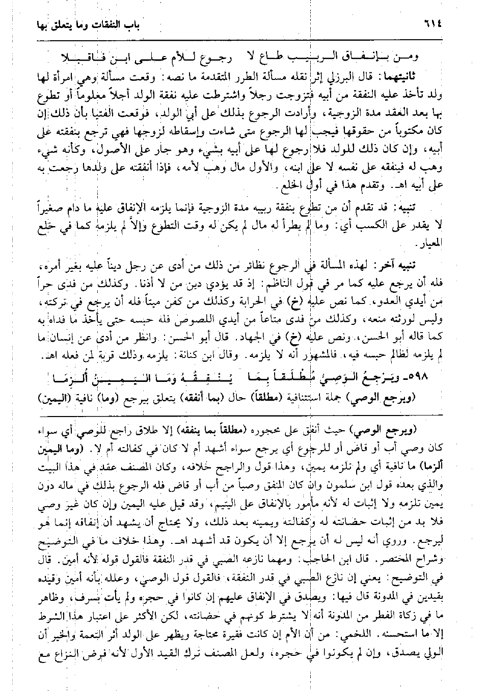 وَمن بإنفاق الربيب طاع لَا رُجُوع للْأُم على ابْن فاقبلا ثانيتهما: قَالَ الْبُرْزُليّ إِثْر نَقله مَسْأَلَة الطرر الْمُتَقَدّمَة مَا نَصه: وَقعت مَسْأَلَة وَهِي امْرَأَة لَهَا ولد تَأْخُذ عَلَيْهِ النَّفَقَة من أَبِيه فَتزوّجت رجلا واشترطت عَلَيْهِ نَفَقَة الْوَلَد أَََجَلًا مَعْلُوما أَو تطوع بهَا بعد العقد مُدَّة الزَّوْجِيَّة، وأرادت الرُّجُوع بذلك على أبي الْوَلَد، فَوَقَعت الْفتيا بِأَن ذَلِك إِن كَانَ مَكْتُوبًا من حُقُوقهَا فَيجب لَهَا الرُّجُوع مَتى شَاءَت وإسقاطه لزَوجهَا فَهِيَ ترجع بِنَفَقَتِهِ على أَبِيه، وَإِن كَانَ ذَلِك للْوَلَد فَلَا رُجُوع لَهَا على أَبِيه بِشَيْء وَهُوَ جَار على الْأُصُول، وَكَأَنَّهُ شَيْء وهب لَهُ فينفقه على نَفسه لَا على ابْنه، وَالْأول مَال وهب لأمه، فَإِذا أنفقته على وَلَدهَا رجعت بِهِ على أَبِيه اه. وَتقدم هَذَا فِي أول الْخلْع. تَنْبِيه: قد تقدم أَن من تطوع بِنَفَقَة ربيبه مُدَّة الزَّوْجِيَّة فَإِنَّمَا يلْزمه الْإِنْفَاق عَلَيْهِ مَا دَامَ صَغِيرا لَا يقدر على الْكسْب أَي: وَمَا لم يطْرَأ لَهُ مَال لم يكن لَهُ وَقت التَّطَوُّع وإلاَّ لم يلْزمه كَمَا فِي خلع المعيار. تَنْبِيه آخر: لهَذِهِ الْمَسْأَلَة فِي الرُّجُوع نَظَائِر من ذَلِك من أدّى عَن رجل دينا عَلَيْهِ بِغَيْر أمره، فَلهُ أَن يرجع عَلَيْهِ كَمَا مر فِي قَول النَّاظِم: إِذْ قد يُؤَدِّي دين من لَا أذنا. وَكَذَلِكَ من فدى حرا من أَيدي الْعَدو، كَمَا نَص عَلَيْهِ (خَ) فِي الْحِرَابَة وَكَذَلِكَ من كفن مَيتا فَلهُ أَن يرجع فِي تركته، وَلَيْسَ لوَرثَته مَنعه، وَكَذَلِكَ من فدى مَتَاعا من أَيدي اللُّصُوص فَلهُ حَبسه حَتَّى يَأْخُذ مَا فدَاه بِهِ كَمَا قَالَه أَبُو الْحسن، وَنَصّ عَلَيْهِ (خَ) فِي الْجِهَاد. قَالَ أَبُو الْحسن: وَانْظُر من أدّى عَن إِنْسَان مَا لم يلْزمه لظَالِم حَبسه فِيهِ، فَالْمَشْهُور أَنه لَا يلْزمه. وَقَالَ ابْن كنَانَة: يلْزمه وَذَلِكَ قربَة لمن فعله اه. ويَرْجِعُ الوَصِيُّ مُطْلَقاً بِمَا يُنْفِقُهُ وَمَا اليَمِينُ أُلزِمَا (وَيرجع الْوَصِيّ) جملَة استئنافية (مُطلقًا) حَال (بِمَا أنفقهُ) يتَعَلَّق بيرجع (وَمَا) نَافِيَة (الْيَمين)