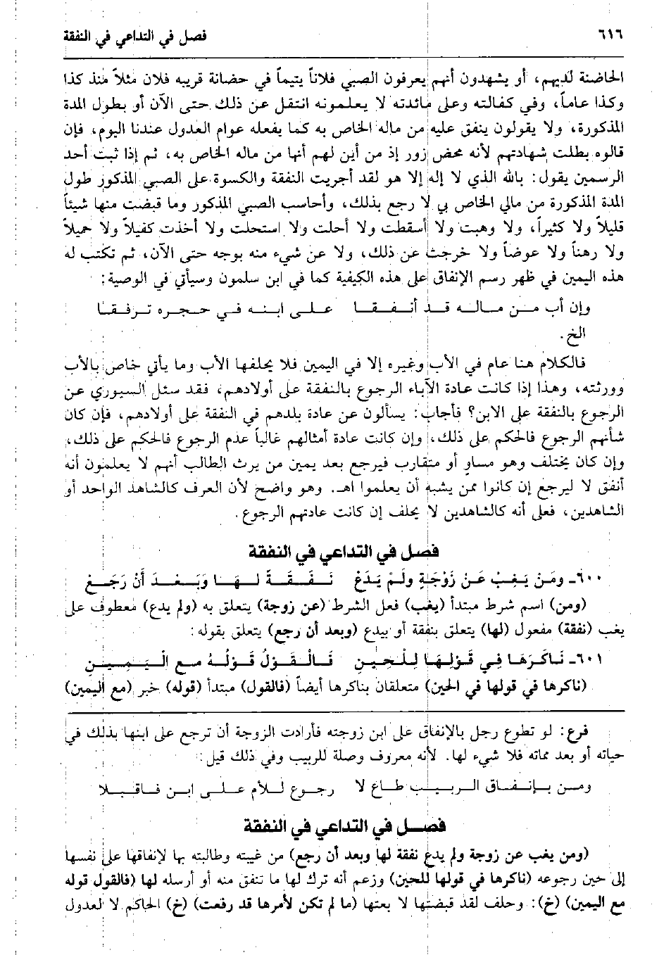 الحاضنة لديهم، أَو يشْهدُونَ أَنهم يعْرفُونَ الصَّبِي فلَانا يَتِيما فِي حضَانَة قَرِيبه فلَان مثلا مُنْذُ كَذَا وَكَذَا عَاما، وَفِي كفَالَته وعَلى مائدته لَا يعلمونه انْتقل عَن ذَلِك حَتَّى الْآن أَو بطول الْمدَّة الْمَذْكُورَة، وَلَا يَقُولُونَ ينْفق عَلَيْهِ من مَاله الْخَاص بِهِ كَمَا يَفْعَله عوام الْعُدُول عندنَا الْيَوْم، فَإِن قَالُوهُ بطلت شَهَادَتهم لِأَنَّهُ مَحْض زور إِذْ من أَيْن لَهُم أَنَّهَا من مَاله الْخَاص بِهِ، ثمَّ إِذا ثَبت أحد الرسمين يَقُول: بِاللَّه الَّذِي لَا إِلَه إِلَّا هُوَ لقد أجريت النَّفَقَة وَالْكِسْوَة على الصَّبِي الْمَذْكُور طول الْمدَّة الْمَذْكُورَة من مَالِي الْخَاص بِي لَا رَجَعَ بذلك، وأحاسب الصَّبِي الْمَذْكُور وَمَا قبضت مِنْهَا شَيْئا قَلِيلا وَلَا كثيرا، وَلَا وهبت وَلَا أسقطت وَلَا أحلّت وَلَا استحلت وَلَا أخذت كَفِيلا وَلَا حميلاً وَلَا رهنا وَلَا عوضا وَلَا خرجت عَن ذَلِك، وَلَا عَن شَيْء مِنْهُ بِوَجْه حَتَّى الْآن، ثمَّ تكْتب لَهُ هَذِه الْيَمين فِي ظهر رسم الْإِنْفَاق على هَذِه الْكَيْفِيَّة كَمَا فِي ابْن سَلمُون وَسَيَأْتِي فِي الْوَصِيَّة: وَإِن أَب من مَاله قد أنفقا على ابْنه فِي حجره ترفقا الخ. فَالْكَلَام هُنَا عَام فِي الْأَب وَغَيره إِلَّا فِي الْيَمين فَلَا يحلفها الْأَب وَمَا يَأْتِي خَاص بِالْأَبِ وورثته، وَهَذَا إِذا كَانَت عَادَة الْآبَاء الرُّجُوع بِالنَّفَقَةِ على أَوْلَادهم، فقد سُئِلَ السيوري عَن الرُّجُوع بِالنَّفَقَةِ على الابْن؟ فَأجَاب: يسْأَلُون عَن عَادَة بلدهم فِي النَّفَقَة على أَوْلَادهم، فَإِن كَانَ شَأْنهمْ الرُّجُوع فَالْحكم على ذَلِك، وَإِن كَانَت عَادَة أمثالهم غَالِبا عدم الرُّجُوع فَالْحكم على ذَلِك، وَإِن كَانَ يخْتَلف وَهُوَ مساوٍ أَو مُتَقَارب فَيرجع بعد يَمِين من يَرث الطَّالِب أَنهم لَا يعلمُونَ أَنه أنْفق لَا ليرْجع إِن كَانُوا مِمَّن يشبه أَن يعلمُوا اه. وَهُوَ وَاضح لِأَن الْعرف كالشاهد الْوَاحِد أَو الشَّاهِدين، فعلى أَنه كالشاهدين لَا يحلف إِن كَانَت عَادَتهم الرُّجُوع.