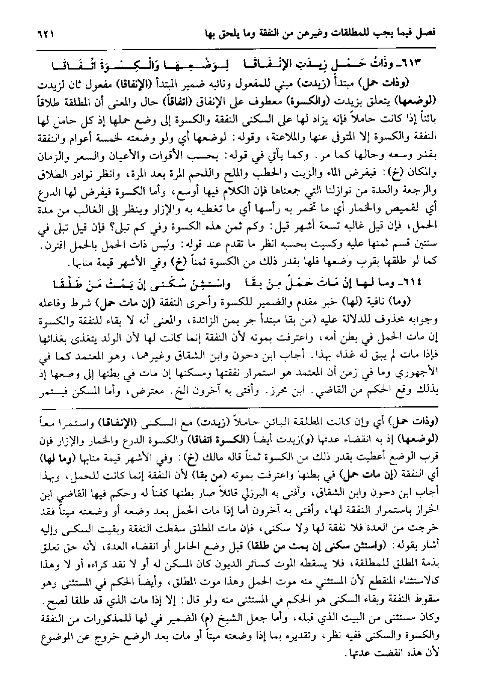 وذَاتُ حَمْلٍ زِيدَتِ الإنْفَاقَا لِوَضْعِهَا وَالْكِسْوَةَ اتِّفَاقَا (وَذَات حمل) مُبْتَدأ (زيدت) مَبْنِيّ للْمَفْعُول ونائبه ضمير الْمُبْتَدَأ (الإنفاقا) مفعول ثَان لزيدت (لوضعها) يتَعَلَّق بزيدت (وَالْكِسْوَة) مَعْطُوف على الْإِنْفَاق (اتِّفَاقًا) حَال وَالْمعْنَى أَن الْمُطلقَة طَلَاقا بَائِنا إِذا كَانَت حَامِلا فَإِنَّهُ يُزَاد لَهَا على السُّكْنَى النَّفَقَة وَالْكِسْوَة إِلَى وضع حملهَا إِذْ كل حَامِل لَهَا النَّفَقَة وَالْكِسْوَة إِلَّا الْمُتَوفَّى عَنْهَا والملاعنة، وَقَوله: لوضعها أَي وَلَو وَضعته لخمسة أَعْوَام وَالنَّفقَة بِقدر وَسعه وحالها كَمَا مر. وكما يَأْتِي فِي قَوْله: بِحَسب الأقوات والأعيان والسعر وَالزَّمَان وَالْمَكَان (خَ) : فيفرض المَاء وَالزَّيْت والحطب وَالْملح وَاللَّحم الْمرة بعد الْمرة، وَانْظُر نَوَادِر الطَّلَاق وَالرَّجْعَة وَالْعدة من نوازلنا الَّتِي جمعناها فَإِن الْكَلَام فِيهَا أوسع، وَأما الْكسْوَة فيفرض لَهَا الدرْع أَي الْقَمِيص والخمار أَي مَا تخمر بِهِ رَأسهَا أَي مَا تغطيه بِهِ والإزار وَينظر إِلَى الْغَالِب من مُدَّة الْحمل، فَإِن قيل غالبه تِسْعَة أشهر قيل: وَكم ثمن هَذِه الْكسْوَة وَفِي كم تبلى؟ فَإِن قيل تبلى فِي سنتَيْن قسم ثمنهَا عَلَيْهِ وكسيت بِحَسبِهِ انْظُر مَا تقدم عِنْد قَوْله: وَلبس ذَات الْحمل بِالْحملِ اقْترن. كَمَا لَو طَلقهَا بِقرب وَضعهَا فلهَا بِقدر ذَلِك من الْكسْوَة ثمنا (خَ) وَفِي الْأَشْهر قيمَة منابها. وَمَا لَهَا إنْ مَاتَ حَمْلٌ مِنْ بقَا واسْتثِنْ سُكْنى إنْ يَمُتْ مَنْ طَلَّقَا (وَمَا) نَافِيَة (لَهَا) خبر مقدم وَالضَّمِير للكسوة وَأَحْرَى النَّفَقَة (إِن مَاتَ حمل) شَرط وفاعله وَجَوَابه مَحْذُوف للدلالة عَلَيْهِ (من بقا مُبْتَدأ جر بِمن الزَّائِدَة، وَالْمعْنَى أَنه لَا بَقَاء للنَّفَقَة وَالْكِسْوَة إِن مَاتَ الْحمل فِي بطن أمه، وَاعْتَرَفت بِمَوْتِهِ لِأَن النَّفَقَة إِنَّمَا كَانَت لَهَا لِأَن الْوَلَد يتغذى بغذائها فَإِذا مَاتَ لم يبْق لَهُ غذَاء بِهَذَا. أجَاب ابْن دحون وَابْن الشقاق وَغَيرهمَا، وَهُوَ الْمُعْتَمد كَمَا فِي الأَجْهُورِيّ وَمَا فِي زمن أَن الْمُعْتَمد هُوَ اسْتِمْرَار نَفَقَتهَا ومسكنها إِن مَاتَ فِي بَطنهَا إِلَى وَضعهَا إِذْ بذلك وَقع الحكم من القَاضِي. ابْن مُحرز. وَأفْتى بِهِ آخَرُونَ الخ. معترض، وَأما الْمسكن فيستمر