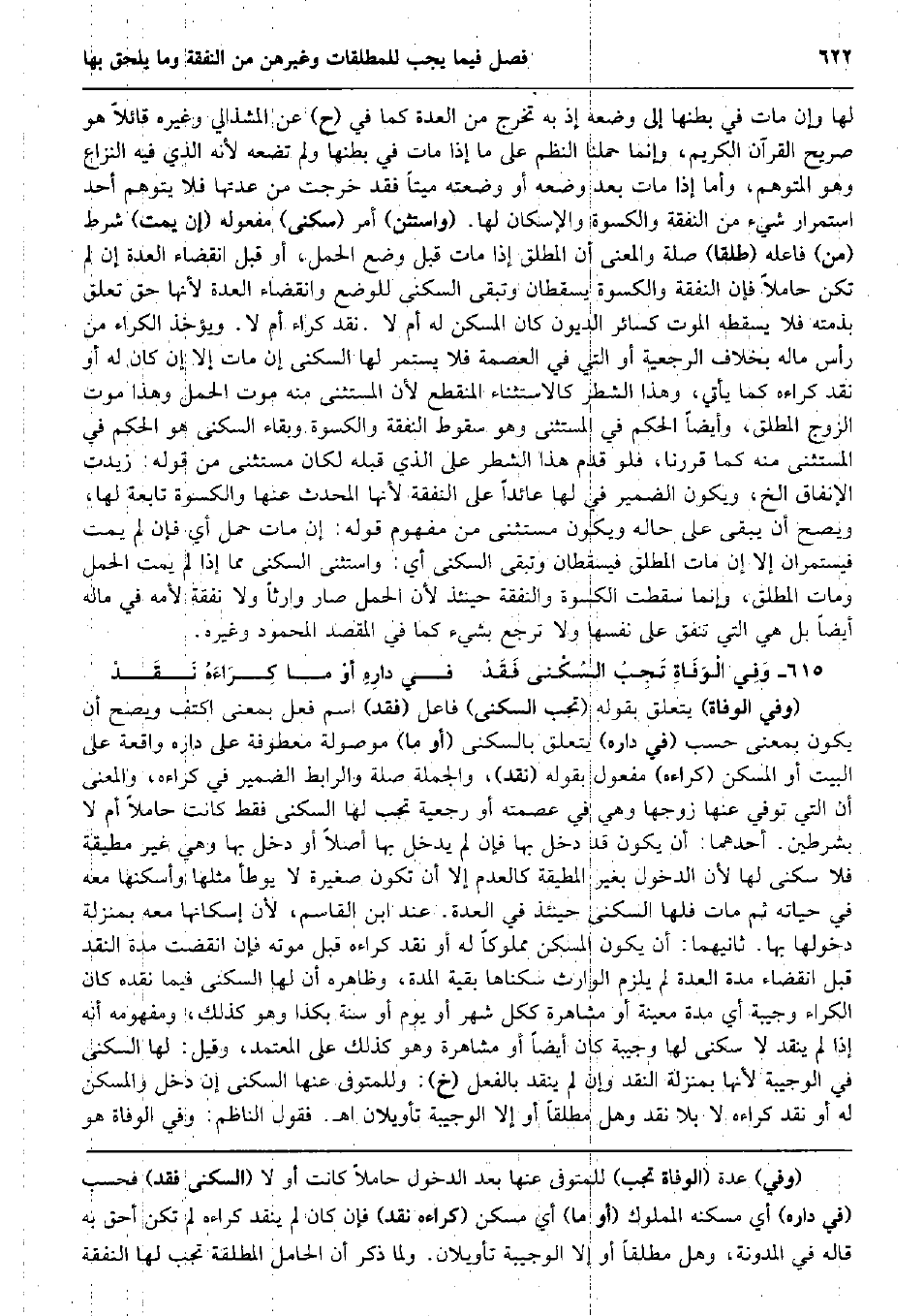 لَهَا وَإِن مَاتَ فِي بَطنهَا إِلَى وَضعه إِذْ بِهِ تخرج من الْعدة كَمَا فِي (ح) عَن المشذالي وَغَيره قَائِلا هُوَ صَرِيح الْقُرْآن الْكَرِيم، وَإِنَّمَا حملنَا النّظم على مَا إِذا مَاتَ فِي بَطنهَا وَلم تضعه لِأَنَّهُ الَّذِي فِيهِ النزاع وَهُوَ المتوهم، وَأما إِذا مَاتَ بعد وَضعه أَو وَضعته مَيتا فقد خرجت من عدتهَا فَلَا يتَوَهَّم أحد اسْتِمْرَار شَيْء من النَّفَقَة وَالْكِسْوَة والإسكان لَهَا. (واستثن) أَمر (سُكْنى) مَفْعُوله (إِن يمت) شَرط (من) فَاعله (طلقا) صلَة وَالْمعْنَى أَن الْمُطلق إِذا مَاتَ قبل وضع الْحمل، أَو قبل انْقِضَاء الْعدة إِن لم تكن حَامِلا فَإِن النَّفَقَة وَالْكِسْوَة يسقطان وَتبقى السُّكْنَى للوضع وانقضاء الْعدة لِأَنَّهَا حق تعلق بِذِمَّتِهِ فَلَا يسْقطهُ الْمَوْت كَسَائِر الدُّيُون كَانَ الْمسكن لَهُ أم لَا. نقد كِرَاء أم لَا. وَيُؤْخَذ الْكِرَاء من رَأس مَاله بِخِلَاف الرَّجْعِيَّة أَو الَّتِي فِي الْعِصْمَة فَلَا يسْتَمر لَهَا السُّكْنَى إِن مَاتَ إِلَّا إِن كَانَ لَهُ أَو نقد كراءه كَمَا يَأْتِي، وَهَذَا الشّطْر كالاستثناء الْمُنْقَطع لِأَن الْمُسْتَثْنى مِنْهُ موت الْحمل وَهَذَا موت الزَّوْج الْمُطلق، وَأَيْضًا الحكم فِي الْمُسْتَثْنى وَهُوَ سُقُوط النَّفَقَة وَالْكِسْوَة وَبَقَاء السُّكْنَى هُوَ الحكم فِي الْمُسْتَثْنى مِنْهُ كَمَا قَررنَا، فَلَو قدم هَذَا الشّطْر على الَّذِي قبله لَكَانَ مُسْتَثْنى من قَوْله: زيدت الْإِنْفَاق الخ، وَيكون الضَّمِير فِي لَهَا عَائِدًا على النَّفَقَة لِأَنَّهَا الْمُحدث عَنْهَا وَالْكِسْوَة تَابِعَة لَهَا، وَيصِح أَن يبْقى على حَاله وَيكون مُسْتَثْنى من مَفْهُوم قَوْله: إِن مَاتَ حمل أَي فَإِن لم يمت فيستمران إِلَّا إِن مَاتَ الْمُطلق فيسقطان وَتبقى السُّكْنَى أَي: وَاسْتثنى السُّكْنَى مِمَّا إِذا لم يمت الْحمل وَمَات الْمُطلق، وَإِنَّمَا سَقَطت الْكسْوَة وَالنَّفقَة حِينَئِذٍ لِأَن الْحمل صَار وَارِثا وَلَا نَفَقَة لأمه فِي مَاله أَيْضا بل هِيَ الَّتِي تنْفق على نَفسهَا وَلَا ترجع بِشَيْء كَمَا فِي الْمَقْصد الْمَحْمُود وَغَيره. وَفِي الْوَفَاةِ تَجِبُ السُكْنى فَقَدْ فِي دارِهِ أوْ مَا كِرَاءَهُ نَقَدْ (وَفِي الْوَفَاة) يتَعَلَّق بقوله (تجب السُّكْنَى) فَاعل (فقد) اسْم فعل بِمَعْنى اكتف وَيصِح أَن يكون بِمَعْنى حسب (فِي دَاره) يتَعَلَّق بِالسُّكْنَى (أَو مَا) مَوْصُولَة معطوفة على دَاره وَاقعَة على الْبَيْت أَو الْمسكن (كراءه) مفعول بقوله (نقد) ، وَالْجُمْلَة صلَة والرابط الضَّمِير فِي كراءه، وَالْمعْنَى أَن الَّتِي توفّي عَنْهَا زَوجهَا وَهِي فِي عصمته أَو رَجْعِيَّة تجب لَهَا السُّكْنَى فَقَط كَانَت حَامِلا أم لَا بِشَرْطَيْنِ. أَحدهمَا: أَن يكون قد دخل بهَا فَإِن لم يدْخل بهَا أصلا أَو دخل بهَا وَهِي غير مطيقة فَلَا سُكْنى لَهَا لِأَن الدُّخُول بِغَيْر المطيقة كَالْعدمِ إِلَّا أَن تكون صَغِيرَة لَا يُوطأ مثلهَا وأسكنها مَعَه فِي حَيَاته ثمَّ مَاتَ فلهَا السُّكْنَى حِينَئِذٍ فِي الْعدة. عِنْد ابْن الْقَاسِم، لِأَن إسكانها مَعَه بِمَنْزِلَة دُخُولهَا بهَا. ثَانِيهمَا: أَن يكون الْمسكن مَمْلُوكا لَهُ أَو نقد كراءه قبل مَوته فَإِن انْقَضتْ مُدَّة النَّقْد قبل انْقِضَاء مُدَّة الْعدة لم يلْزم الْوَارِث سكناهَا بَقِيَّة الْمدَّة، وَظَاهره أَن لَهَا السُّكْنَى فِيمَا نَقده كَانَ الْكِرَاء وجيبة أَي مُدَّة مُعينَة أَو مشاهرة ككل شهر أَو يَوْم أَو سنة بِكَذَا وَهُوَ كَذَلِك، وَمَفْهُومه أَنه إِذا لم ينْقد لَا سُكْنى لَهَا وجيبة كَانَ أَيْضا أَو مشاهرة وَهُوَ كَذَلِك على الْمُعْتَمد، وَقيل: لَهَا السُّكْنَى فِي الوجيبة لِأَنَّهَا بِمَنْزِلَة النَّقْد وَإِن لم ينْقد بِالْفِعْلِ (خَ) : وللمتوفى عَنْهَا السُّكْنَى إِن دخل والمسكن لَهُ أَو نقد كرا