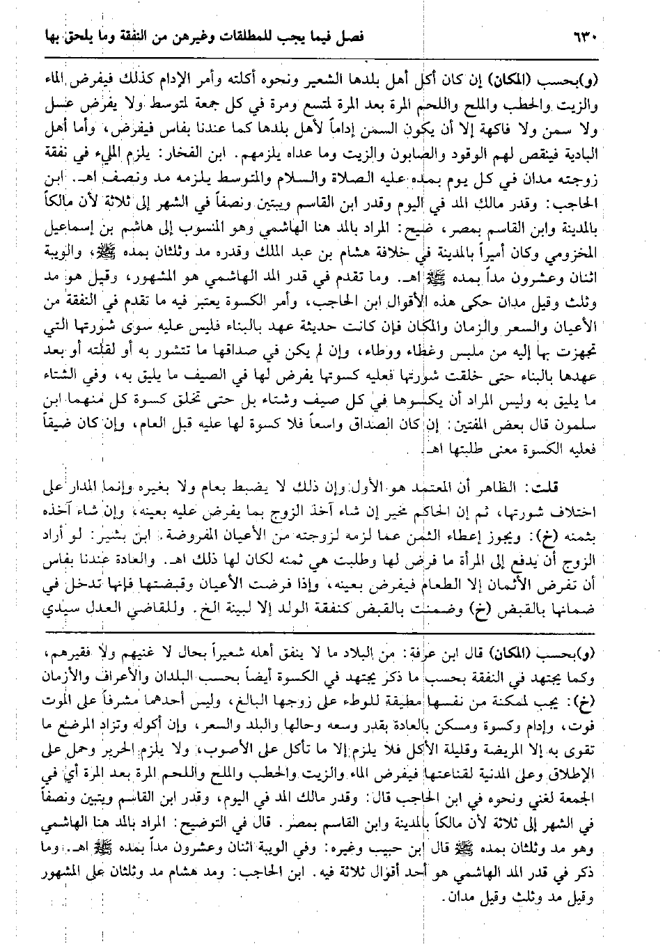 (و) بِحَسب (الْمَكَان) إِن كَانَ أكل أهل بَلَدهَا الشّعير وَنَحْوه أَكلته وَأمر الإدام كَذَلِك فيفرض المَاء وَالزَّيْت والحطب وَالْملح وَاللَّحم الْمرة بعد الْمرة لمتسع وَمرَّة فِي كل جُمُعَة لمتوسط وَلَا يفْرض عسل وَلَا سمن وَلَا فَاكِهَة إِلَّا أَن يكون السّمن إدَامًا لأهل بَلَدهَا كَمَا عندنَا بفاس فيفرض، وَأما أهل الْبَادِيَة فينقص لَهُم الْوقُود والصابون وَالزَّيْت وَمَا عداهُ يلْزمهُم. ابْن الفخار: يلْزم المليء فِي نَفَقَة زَوجته مدان فِي كل يَوْم بمده عَلَيْهِ الصَّلَاة وَالسَّلَام والمتوسط يلْزمه مد وَنصف اه. ابْن الْحَاجِب: وَقدر مَالك الْمَدّ فِي الْيَوْم وَقدر ابْن الْقَاسِم ويبتين وَنصفا فِي الشَّهْر إِلَى ثَلَاثَة لِأَن مَالِكًا بِالْمَدِينَةِ وَابْن الْقَاسِم بِمصْر، ضيح: المُرَاد بِالْمدِّ هُنَا الْهَاشِمِي وَهُوَ الْمَنْسُوب إِلَى هَاشم بن إِسْمَاعِيل المَخْزُومِي وَكَانَ أَمِيرا بِالْمَدِينَةِ فِي خلَافَة هِشَام بن عبد الْملك وَقدره مد وَثُلُثَانِ بمده صلى الله عَلَيْهِ وَسلم، والويبة اثْنَان وَعِشْرُونَ مدا بمده صلى الله عَلَيْهِ وَسلم اه. وَمَا تقدم فِي قدر الْمَدّ الْهَاشِمِي هُوَ الْمَشْهُور، وَقيل هُوَ مد وَثلث وَقيل مدان حكى هَذِه الْأَقْوَال ابْن الْحَاجِب، وَأمر الْكسْوَة يعْتَبر فِيهِ مَا تقدم فِي النَّفَقَة من الْأَعْيَان والسعر وَالزَّمَان وَالْمَكَان فَإِن كَانَت حَدِيثَة عهد بِالْبِنَاءِ فَلَيْسَ عَلَيْهِ سوى شورتها الَّتِي تجهزت بهَا إِلَيْهِ من ملبس وغطاء ووطاء، وَإِن لم يكن فِي صَدَاقهَا مَا تتشور بِهِ أَو لقلته أَو بعد عهدها بِالْبِنَاءِ حَتَّى خلقت شورتها فَعَلَيهِ كسوتها يفْرض لَهَا فِي الصَّيف مَا يَلِيق بِهِ، وَفِي الشتَاء مَا يَلِيق بِهِ وَلَيْسَ المُرَاد أَن يَكْسُوهَا فِي كل صيف وشتاء بل حَتَّى تخلق كسْوَة كل مِنْهُمَا ابْن سَلمُون قَالَ بعض الْمُفْتِينَ: إِن كَانَ الصَدَاق وَاسِعًا فَلَا كسْوَة لَهَا عَلَيْهِ قبل الْعَام، وَإِن كَانَ ضيقا فَعَلَيهِ الْكسْوَة معنى طلبتها اه. قلت: الظَّاهِر أَن الْمُعْتَمد هُوَ الأول وَإِن ذَلِك لَا يضْبط بعام وَلَا بِغَيْرِهِ وَإِنَّمَا الْمدَار على اخْتِلَاف شورتها، ثمَّ إِن الْحَاكِم مُخَيّر إِن شَاءَ آخذ الزَّوْج بِمَا يفْرض عَلَيْهِ بِعَيْنِه، وَإِن شَاءَ آخذه بِثمنِهِ (خَ) : وَيجوز إِعْطَاء الثّمن عَمَّا لزمَه لزوجته من الْأَعْيَان الْمَفْرُوضَة. ابْن بشير: لَو أَرَادَ الزَّوْج أَن يدْفع إِلَى الْمَرْأَة مَا فرض لَهَا وَطلبت هِيَ ثمنه لَكَانَ لَهَا ذَلِك اه. وَالْعَادَة عندنَا بفاس أَن تفرض الْأَثْمَان إِلَّا الطَّعَام فيفرض بِعَيْنِه، وَإِذا فرضت الْأَعْيَان وقبضتها فَإِنَّهَا تدخل فِي ضَمَانهَا بِالْقَبْضِ (خَ) وضمنت بِالْقَبْضِ كَنَفَقَة الْوَلَد إِلَّا لبينة الخ. وللقاضي الْعدْل سَيِّدي