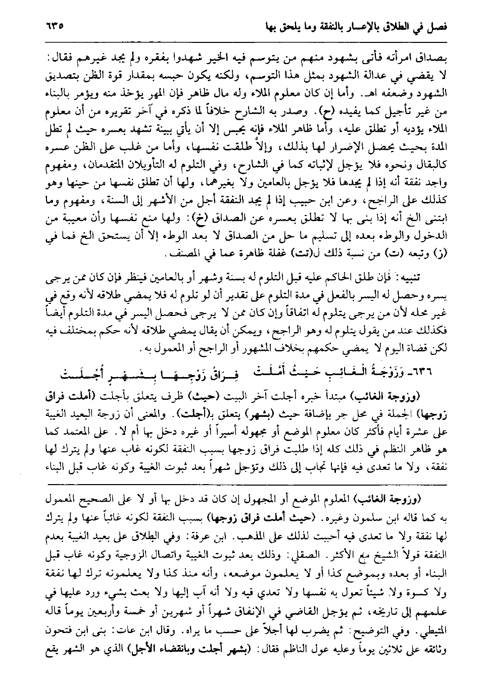 بِصَدَاق امْرَأَته فَأتى بِشُهُود مِنْهُم من يتوسم فِيهِ الْخَيْر شهدُوا بفقره وَلم يجد غَيرهم فَقَالَ: لَا يقْضِي فِي عَدَالَة الشُّهُود بِمثل هَذَا التوسم، وَلكنه يكون حَبسه بِمِقْدَار قُوَّة الظَّن بِتَصْدِيق الشُّهُود وَضَعفه اه. وَأما إِن كَانَ مَعْلُوم الملاء وَله مَال ظَاهر فَإِن الْمهْر يُؤْخَذ مِنْهُ وَيُؤمر بِالْبِنَاءِ من غير تَأْجِيل كَمَا يفِيدهُ (ح) . وَصدر بِهِ الشَّارِح خلافًا لما ذكره فِي آخر تَقْرِيره من أَن مَعْلُوم الملاء يُؤَدِّيه أَو تطلق عَلَيْهِ، وَأما ظَاهر الملاء فَإِنَّهُ يحبس إِلَّا أَن يَأْتِي بِبَيِّنَة تشهد بعسره حَيْثُ لم تطل الْمدَّة بِحَيْثُ يحصل الْإِضْرَار لَهَا بذلك، وإلاَّ طلقت نَفسهَا، وَأما من غلب على الظَّن عسره كالبقال وَنَحْوه فَلَا يُؤَجل لإثباته كَمَا فِي الشَّارِح، وَفِي التَّلَوُّم لَهُ التأويلان المتقدمان، وَمَفْهُوم وَاجِد نَفَقَة أَنه إِذا لم يجدهَا فَلَا يُؤَجل بالعامين وَلَا بِغَيْرِهِمَا، وَلها أَن تطلق نَفسهَا من حينها وَهُوَ كَذَلِك على الرَّاجِح، وَعَن ابْن حبيب إِذا لم يجد النَّفَقَة أجل من الْأَشْهر إِلَى السّنة، وَمَفْهُوم وَمَا ابتنى الخ أَنه إِذا بنى بهَا لَا تطلق بعسره عَن الصَدَاق (خَ) : وَلها منع نَفسهَا وَأَن مَعِيبَة من الدُّخُول وَالْوَطْء بعده إِلَى تَسْلِيم مَا حل من الصَدَاق لَا بعد الْوَطْء إِلَّا أَن يسْتَحق الخ فَمَا فِي (ز) وَتَبعهُ (ت) من نِسْبَة ذَلِك ل (تت) غَفلَة ظَاهِرَة عَمَّا فِي المُصَنّف. تَنْبِيه: فَإِن طلق الْحَاكِم عَلَيْهِ قبل التَّلَوُّم لَهُ بِسنة وَشهر أَو بالعامين فَينْظر فَإِن كَانَ مِمَّن يُرْجَى يسره وَحصل لَهُ الْيُسْر بِالْفِعْلِ فِي مُدَّة التَّلَوُّم على تَقْدِير أَن لَو تلوم لَهُ فَلَا يمْضِي طَلَاقه لِأَنَّهُ وَقع فِي غير مَحَله لِأَن من يُرْجَى يتلوم لَهُ اتِّفَاقًا وَإِن كَانَ مِمَّن لَا يُرْجَى فَحصل الْيُسْر فِي مُدَّة التَّلَوُّم أَيْضا فَكَذَلِك عِنْد من يَقُول يتلوم لَهُ وَهُوَ الرَّاجِح، وَيُمكن أَن يُقَال يمْضِي طَلَاقه لِأَنَّهُ حكم بمختلف فِيهِ لَكِن قُضَاة الْيَوْم لَا يمْضِي حكمهم بِخِلَاف الْمَشْهُور أَو الرَّاجِح أَو الْمَعْمُول بِهِ. وَزَوْجَةُ الْغَائِبِ حَيْثُ أَمَّلَتْ فِرَاقُ زَوْجِهَا بِشَهْرٍ أُجِّلَتْ (وَزَوْجَة الْغَائِب) مُبْتَدأ خَبره أجلت آخر الْبَيْت (حَيْثُ) ظرف يتَعَلَّق بأجلت (أملت فِرَاق زَوجهَا) الْجُمْلَة فِي مَحل جر بِإِضَافَة حَيْثُ (بِشَهْر) يتَعَلَّق ب (أجلت) . وَالْمعْنَى أَن زَوْجَة الْبعيد الْغَيْبَة على عشرَة أَيَّام فَأكْثر كَانَ مَعْلُوم الْموضع أَو مجهوله أَسِيرًا أَو غَيره دخل بهَا أم لَا. على الْمُعْتَمد كَمَا هُوَ ظَاهر النّظم فِي ذَلِك كُله إِذا طلبت فِرَاق زَوجهَا بِسَبَب النَّفَقَة لكَونه غَابَ عَنْهَا وَلم يتْرك لَهَا نَفَقَة، وَلَا مَا تعدى فِيهِ فَإِنَّهَا تجاب إِلَى ذَلِك وتؤجل شهرا بعد ثُبُوت الْغَيْبَة وَكَونه غَابَ قبل الْبناء