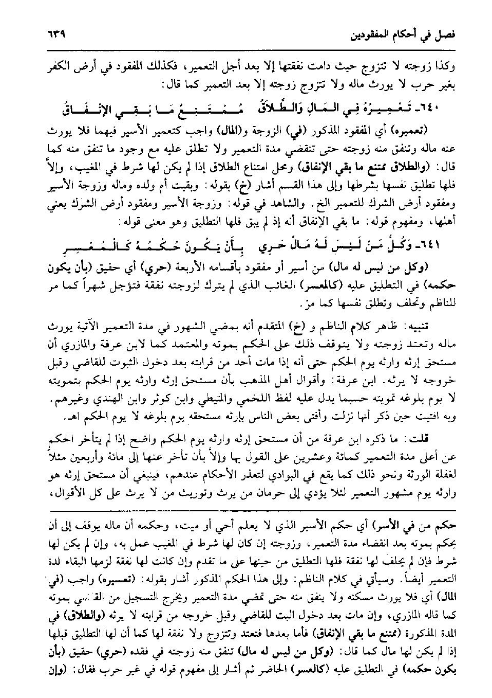 وَكَذَا زَوجته لَا تتَزَوَّج حَيْثُ دَامَت نَفَقَتهَا إِلَّا بعد أجل التَّعْمِير، فَكَذَلِك الْمَفْقُود فِي أَرض الْكفْر بِغَيْر حَرْب لَا يُورث مَاله وَلَا تتَزَوَّج زَوجته إِلَّا بعد التَّعْمِير كَمَا قَالَ: تَعْمِيرُهُ فِي المَالِ وَالطَّلاَقُ مُمْتَنِعٌ مَا بَقِي الإنْفَاقُ (تعميره) أَي الْمَفْقُود الْمَذْكُور (فِي) الزَّوْجَة و (المَال) وَاجِب كتعمير الْأَسير فيهمَا فَلَا يُورث عَنهُ مَاله وتنفق مِنْهُ زَوجته حَتَّى تَنْقَضِي مُدَّة التَّعْمِير وَلَا تطلق عَلَيْهِ مَعَ وجود مَا تنْفق مِنْهُ كَمَا قَالَ: (وَالطَّلَاق مُمْتَنع مَا بَقِي الْإِنْفَاق) وَمحل امْتنَاع الطَّلَاق إِذا لم يكن لَهَا شَرط فِي المغيب، وإلاَّ فلهَا تطليق نَفسهَا بشرطها وَإِلَى هَذَا الْقسم أَشَارَ (خَ) بقوله: وَبقيت أم وَلَده وَمَاله وَزَوْجَة الْأَسير ومفقود أَرض الشّرك للتعمير الخ. وَالشَّاهِد فِي قَوْله: وَزَوْجَة الْأَسير ومفقود أَرض الشّرك يَعْنِي أَهلهَا، وَمَفْهُوم قَوْله: مَا بَقِي الْإِنْفَاق أَنه إِذْ لم يبْق فلهَا التَّطْلِيق وَهُوَ معنى قَوْله: وَكُلُّ مَنْ لَيْسَ لَهُ مَالٌ حَرِي بِأَنْ يَكُونَ حُكْمُهُ كَالْمُعْسِرِ (وكل من لَيْسَ لَهُ مَال) من أَسِير أَو مَفْقُود بأقسامه الْأَرْبَعَة (حري) أَي حقيق (بِأَن يكون حكمه) فِي التَّطْلِيق عَلَيْهِ (كالمعسر) الْغَائِب الَّذِي لم يتْرك لزوجته نَفَقَة فتؤجل شهرا كَمَا مر للناظم وتحلف وَتطلق نَفسهَا كَمَا مرّ. تَنْبِيه: ظَاهر كَلَام النَّاظِم و (خَ) الْمُتَقَدّم أَنه بِمُضِيِّ الشُّهُور فِي مُدَّة التَّعْمِير الْآتِيَة يُورث مَاله وَتعْتَد زَوجته وَلَا يتَوَقَّف ذَلِك على الحكم بِمَوْتِهِ وَالْمُعْتَمد كَمَا لِابْنِ عَرَفَة والمازري أَن مُسْتَحقّ إِرْثه وَارثه يَوْم الحكم حَتَّى أَنه إِذا مَاتَ أحد من قرَابَته بعد دُخُول الثُّبُوت للْقَاضِي وَقبل خُرُوجه لَا يَرِثهُ. ابْن عَرَفَة: وأقوال أهل الْمَذْهَب بِأَن مُسْتَحقّ إِرْثه وَارثه يَوْم الحكم بتمويته لَا يَوْم بُلُوغه تمويته حَسْبَمَا يدل عَلَيْهِ لفظ اللَّخْمِيّ والمتيطي وَابْن كوثر وَابْن الْهِنْدِيّ وَغَيرهم. وَبِه افتيت حِين ذكر أَنَّهَا نزلت وَأفْتى بعض النَّاس بإرثه مُسْتَحقّه يَوْم بُلُوغه لَا يَوْم الحكم اه. قلت: مَا ذكره ابْن عَرَفَة من أَن مُسْتَحقّ إِرْثه وَارثه يَوْم الحكم وَاضح إِذا لم يتَأَخَّر الحكم عَن أَعلَى مُدَّة التَّعْمِير كمائة وَعشْرين على القَوْل بهَا وإلاَّ بِأَن تَأَخّر عَنْهَا إِلَى مائَة وَأَرْبَعين مثلا لغفلة الْوَرَثَة وَنَحْو ذَلِك كَمَا يَقع فِي الْبَوَادِي لتعذر الْأَحْكَام عِنْدهم، فَيَنْبَغِي أَن مُسْتَحقّ إِرْثه هُوَ وَارثه يَوْم مَشْهُور التَّعْمِير لِئَلَّا يُؤَدِّي إِلَى حرمَان من يَرث وتوريث من لَا يَرث على كل الْأَقْوَال،