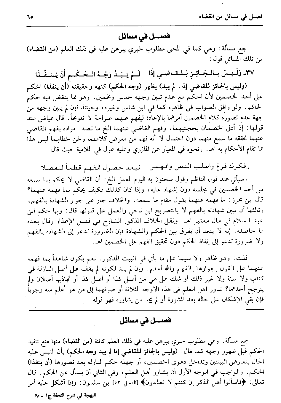 جع مَسْأَلَة: وَهِي كَمَا فِي الْمحلى مَطْلُوب خبري يبرهن عَلَيْهِ فِي ذَلِك الْعلم (من الْقَضَاء) من تِلْكَ الْمسَائِل قَوْله: وَلَيْسَ بالجَائِزِ لِلقاضي إذَا لَمْ يَبْدُ وَجْهُ الحُكْمِ أَنْ يُنَفِّذَا (وَلَيْسَ بالجائز للْقَاضِي إِذا. لم يبد) يظْهر (وَجه الحكم) كنهه وَحَقِيقَته (أَن ينفذا) الحكم على أحد الْخَصْمَيْنِ لِأَن الحكم مَعَ عدم تبين وَجهه حدس وتخمين، وَهُوَ مِمَّا ينْقض فِيهِ حكم الْحَاكِم. وَلَو وَافق الصَّوَاب فِي ظَاهره كَمَا فِي ابْن شَاس وَغَيره، وَحِينَئِذٍ فَإِن لم يبين وَجهه من جِهَة عدم تصَوره كَلَام الْخَصْمَيْنِ أَمرهمَا بِالْإِعَادَةِ ليفهم عَنْهُمَا صَرَاحَة لَا تَلْوِيحًا. قَالَ عِيَاض عِنْد قَوْلهَا: إِذا أدلى الخصمان بحجتيهما، وَفهم القَاضِي عَنْهُمَا الخ مَا نَصه: مُرَاده بفهم القَاضِي عَنْهُمَا تحَققه مَا سمع مِنْهُمَا دون احْتِمَال لَا أَنه فهم من معرض كَلَامهمَا ولحن خطابهما لَيْسَ هَذَا مِمَّا تُقَام الْأَحْكَام بِهِ اه. وَنَحْوه فِي المعيار عَن الْمَازرِيّ وَعَلِيهِ عول فِي اللامية حَيْثُ قَالَ: وفكرك فرغ واطلب النَّص وافهمن فَبعد حُصُول الْفَهم قطعا لتفصلا وَسَيَأْتِي عِنْد قَول النَّاظِم وَقَول سَحْنُون بِهِ الْيَوْم الْعَمَل الخ: أَن القَاضِي لَا يحكم بِمَا سَمعه من أحد الْخَصْمَيْنِ فِي مَجْلِسه دون إِشْهَاد عَلَيْهِ، وَإِذا كَانَ كَذَلِك فَكيف يحكم بِمَا فهمه عَنْهُمَا؟ قَالَ ابْن مُحرز: مَا فهمه عَنْهُمَا يَقُول مقَام مَا سَمعه، وَالْخلاف جَار على جَوَاز الشَّهَادَة بالفهم، وَثَالِثهَا أَن يبين شَهَادَته بالفهم لَا بالتصريح ابْن نَاجِي وَالْعَمَل على قبُولهَا قَالَ: وَبهَا حكم ابْن عبد السَّلَام فِي مَال مُعْتَبر اه. وَنقل الْخلاف الْمَذْكُور الشَّارِح فِي فصل الْإِعْذَار وَقَالَ بعده مَا حَاصله: إِنَّه لَا يبعد أَن يفرق بَين الحكم وَالشَّهَادَة فَإِن الضَّرُورَة تَدْعُو إِلَى الشَّهَادَة بالفهم وَلَا ضَرُورَة تَدْعُو إِلَى إِنْفَاذ الحكم دون تَحْقِيق الْفَهم على الْخَصْمَيْنِ اه. قلت: وَهُوَ ظَاهر وَلَا سِيمَا على مَا يَأْتِي فِي الْبَيْت الْمَذْكُور. نعم يكون شَاهدا بِمَا فهمه عَنْهُمَا على القَوْل بجوازها بالفهم وَالله أعلم. وَإِن لم يبد لكَونه لم يقف على أصل النَّازِلَة فِي كتاب وَلَا سنة وَلَا غير ذَلِك أَو شكّ هَل هِيَ من أصل كَذَا أَو أصل كَذَا أَو تجاذبها أصلان وَلم يتَرَجَّح أَحدهمَا؟ شاور أهل الْعلم فِي هَذِه الْأَوْجه الثَّلَاثَة أَو صرفهما إِلَى من هُوَ أعلم مِنْهُ وجوبا فَإِن بَقِي الْإِشْكَال على حَاله بعد المشورة أَو لم يجد من يشاوره فَهُوَ قَوْله: