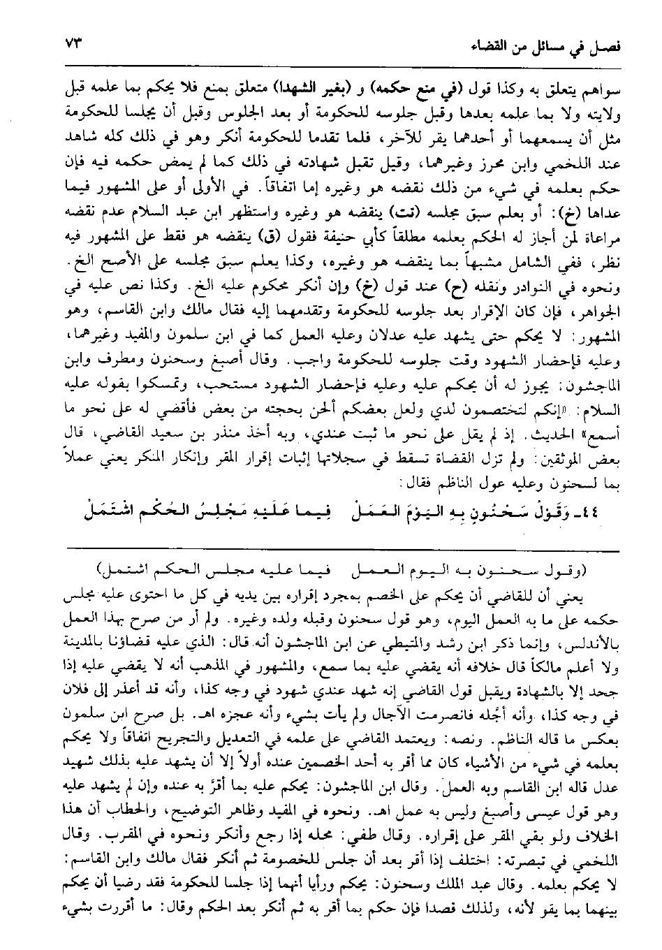سواهُم يتَعَلَّق بِهِ وَكَذَا قَول (فِي منع حكمه) و (بِغَيْر الشهدا) مُتَعَلق بِمَنْع فَلَا يحكم بِمَا علمه قبل ولَايَته وَلَا بِمَا علمه بعْدهَا وَقبل جُلُوسه للحكومة أَو بعد الْجُلُوس وَقبل أَن يجلسا للحكومة مثل أَن يسمعهما أَو أَحدهمَا يقر للْآخر، فَلَمَّا تقدما للحكومة أنكر وَهُوَ فِي ذَلِك كُله شَاهد عِنْد اللَّخْمِيّ وَابْن مُحرز وَغَيرهمَا، وَقيل تقبل شَهَادَته فِي ذَلِك كَمَا لم يمض حكمه فِيهِ فَإِن حكم بِعِلْمِهِ فِي شَيْء من ذَلِك نقضه هُوَ وَغَيره إِمَّا اتِّفَاقًا. فِي الأولى أَو على الْمَشْهُور فِيمَا عَداهَا (خَ) : أَو بِعلم سبق مَجْلِسه (تت) ينْقضه هُوَ وَغَيره وَاسْتظْهر ابْن عبد السَّلَام عدم نقضه مُرَاعَاة لمن أجَاز لَهُ الحكم بِعِلْمِهِ مُطلقًا كَأبي حنيفَة فَقَوْل (ق) ينْقضه هُوَ فَقَط على الْمَشْهُور فِيهِ نظر، فَفِي الشَّامِل مشبهاً بِمَا ينْقضه هُوَ وَغَيره، وَكَذَا يعلم سبق مَجْلِسه على الْأَصَح الخ. وَنَحْوه فِي النَّوَادِر وَنَقله (ح) عِنْد قَول (خَ) وَإِن أنكر مَحْكُوم عَلَيْهِ الخ. وَكَذَا نَص عَلَيْهِ فِي الْجَوَاهِر، فَإِن كَانَ الْإِقْرَار بعد جُلُوسه للحكومة وتقدمهما إِلَيْهِ فَقَالَ مَالك وَابْن الْقَاسِم، وَهُوَ الْمَشْهُور: لَا يحكم حَتَّى يشْهد عَلَيْهِ عَدْلَانِ وَعَلِيهِ الْعَمَل كَمَا فِي ابْن سَلمُون والمفيد وَغَيرهمَا، وَعَلِيهِ فإحضار الشُّهُود وَقت جُلُوسه للحكومة وَاجِب. وَقَالَ أصبغ وَسَحْنُون ومطرف وَابْن الْمَاجشون: يجوز لَهُ أَن يحكم عَلَيْهِ وَعَلِيهِ فإحضار الشُّهُود مُسْتَحبّ، وتمسكوا بقوله عَلَيْهِ السَّلَام: (إِنَّكُم لتختصمون لدي وَلَعَلَّ بَعْضكُم أَلحن بحجته من بعض فأقضي لَهُ على نَحْو مَا أسمع) الحَدِيث. إِذْ لم يقل على نَحْو مَا ثَبت عِنْدِي، وَبِه أَخذ مُنْذر بن سعيد القَاضِي قَالَ بعض الموثقين: وَلم تزل الْقُضَاة تسْقط فِي سجلاتها إِثْبَات إِقْرَار الْمقر وإنكار الْمُنكر يَعْنِي عملا بِمَا لسَحْنُون وَعَلِيهِ عول النَّاظِم فَقَالَ: وَقَوْلُ سَحْنُونٍ بِهِ اليَوْمَ العَمَلْ فِيما عَلَيْهِ مَجْلِسُ الحُكْم اشْتَمَلْ