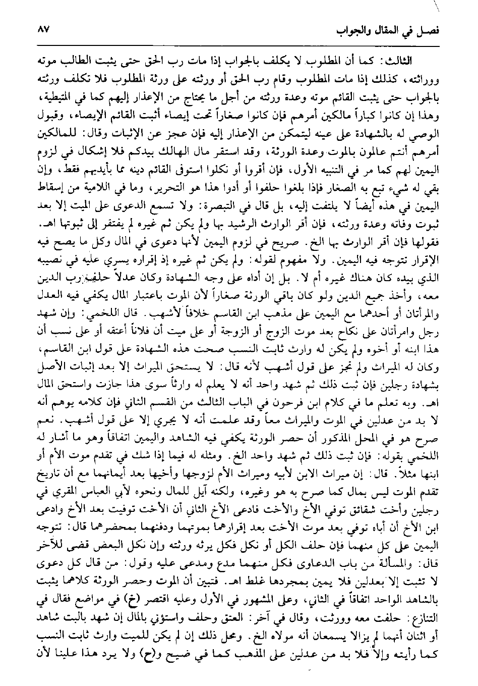 الثَّالِث: كَمَا أَن الْمَطْلُوب لَا يُكَلف بِالْجَوَابِ إِذا مَاتَ رب الْحق حَتَّى يثبت الطَّالِب مَوته ووراثته، كَذَلِك إِذا مَاتَ الْمَطْلُوب وَقَامَ رب الْحق أَو ورثته على وَرَثَة الْمَطْلُوب فَلَا تكلّف ورثته بِالْجَوَابِ حَتَّى يثبت الْقَائِم مَوته وعدة ورثته من أجل مَا يحْتَاج من الْإِعْذَار إِلَيْهِم كَمَا فِي الْمُتَيْطِيَّة، وَهَذَا إِن كَانُوا كبارًا مالكين أَمرهم فَإِن كَانُوا صغَارًا تَحت إيصاء أثبت الْقَائِم الْإِيصَاء وَقبُول الْوَصِيّ لَهُ بِالشَّهَادَةِ على عينه ليتَمَكَّن من الْإِعْذَار إِلَيْهِ فَإِن عجز عَن الْإِثْبَات وَقَالَ: للمالكين أَمرهم أَنْتُم عالمون بِالْمَوْتِ وعدة الْوَرَثَة، وَقد اسْتَقر مَال الْهَالِك بيدكم فَلَا إِشْكَال فِي لُزُوم الْيَمين لَهُم كَمَا مر فِي التَّنْبِيه الأول، فَإِن أقرُّوا أَو نكلوا استوفى الْقَائِم دينه مِمَّا بِأَيْدِيهِم فَقَط، وَإِن بَقِي لَهُ شَيْء تبع بِهِ الصغار فَإِذا بلغُوا حلفوا أَو أَدّوا هَذَا هُوَ التَّحْرِير، وَمَا فِي اللامية من إِسْقَاط الْيَمين فِي هَذِه أَيْضا لَا يلْتَفت إِلَيْهِ، بل قَالَ فِي التَّبْصِرَة: وَلَا تسمع الدَّعْوَى على الْمَيِّت إِلَّا بعد ثُبُوت وَفَاته وعدة ورثته، فَإِن أقرّ الْوَارِث الرشيد بهَا وَلم يكن ثمَّ غَيره لم يفْتَقر إِلَى ثُبُوتهَا اه. فقولها فَإِن أقرّ الْوَارِث بهَا الخ. صَرِيح فِي لُزُوم الْيَمين لِأَنَّهَا دَعْوَى فِي المَال وكل مَا يَصح فِيهِ الْإِقْرَار تتَوَجَّه فِيهِ الْيَمين. وَلَا مَفْهُوم لقَوْله: وَلم يكن ثمَّ غَيره إِذْ إِقْرَاره يسري عَلَيْهِ فِي نصِيبه الَّذِي بِيَدِهِ كَانَ هُنَاكَ غَيره أم لَا. بل إِن أَدَّاهُ على وَجه الشَّهَادَة وَكَانَ عدلا حلف رب الدّين مَعَه، وَأخذ جَمِيع الدّين وَلَو كَانَ بَاقِي الْوَرَثَة صغَارًا لِأَن الْمَوْت بِاعْتِبَار المَال يَكْفِي فِيهِ الْعدْل والمرأتان أَو أَحدهمَا مَعَ الْيَمين على مَذْهَب ابْن الْقَاسِم خلافًا لأَشْهَب. قَالَ اللَّخْمِيّ: وَإِن شهد رجل وَامْرَأَتَانِ على نِكَاح بعد موت الزَّوْج أَو الزَّوْجَة أَو على ميت أَن فلَانا أعْتقهُ أَو على نسب أَن هَذَا ابْنه أَو أَخُوهُ وَلم يكن لَهُ وَارِث ثَابت النّسَب صحت هَذِه الشَّهَادَة على قَول ابْن الْقَاسِم، وَكَانَ لَهُ الْمِيرَاث وَلم تجز على قَول أَشهب لِأَنَّهُ قَالَ: لَا يسْتَحق الْمِيرَاث إِلَّا بعد إِثْبَات الأَصْل بِشَهَادَة رجلَيْنِ فَإِن ثَبت ذَلِك ثمَّ شهد وَاحِد أَنه لَا يعلم لَهُ وَارِثا سوى هَذَا جَازَت وَاسْتحق المَال اه. وَبِه تعلم مَا فِي كَلَام ابْن فَرِحُونَ فِي الْبَاب الثَّالِث من الْقسم الثَّانِي فَإِن كَلَامه يُوهم أَنه لَا بُد من عَدْلَيْنِ فِي الْمَوْت وَالْمِيرَاث مَعًا وَقد علمت أَنه لَا يجْرِي إِلَّا على قَول أَشهب. نعم صرح هُوَ فِي الْمحل الْمَذْكُور أَن حصر الْوَرَثَة يَكْفِي فِيهِ الشَّاهِد وَالْيَمِين اتِّفَاقًا وَهُوَ مَا أَشَارَ لَهُ اللَّخْمِيّ بقوله: فَإِن ثَبت ذَلِك ثمَّ شهد وَاحِد الخ. وَمثله لَهُ فِيمَا إِذا شكّ فِي تقدم موت الْأُم أَو ابْنهَا مثلا. قَالَ: إِن مِيرَاث الابْن لِأَبِيهِ وميراث الْأُم لزَوجهَا وأخيها بعد أيمانهما مَعَ أَن تَارِيخ تقدم الْمَوْت لَيْسَ بِمَال كَمَا صرح بِهِ هُوَ وَغَيره، وَلكنه آيل لِلْمَالِ وَنَحْوه لأبي الْعَبَّاس الْمقري فِي رجلَيْنِ وَأُخْت شقائق توفّي الْأَخ وَالْأُخْت فَادّعى الْأَخ الثَّانِي أَن الْأُخْت توفيت بعد الْأَخ وَادّعى ابْن الْأَخ أَن أَبَاهُ توفّي بعد موت الْأُخْت بعد إقرارهما بموتهما ودفنهما بمحضرهما قَالَ: تتَوَجَّه الْيَمين على كل مِنْهُمَا فَإِن حلف الْكل أَو نكل فَكل يَرِثهُ ورثته وَإِن نكل الْبَعْض قضى للْآخر قَالَ: وَالْمَسْأَلَة من بَاب الدَّعَاوَى فَكل مِنْهُمَا مُدع ومدعى عَلَيْهِ وَقَول: من قَالَ كل