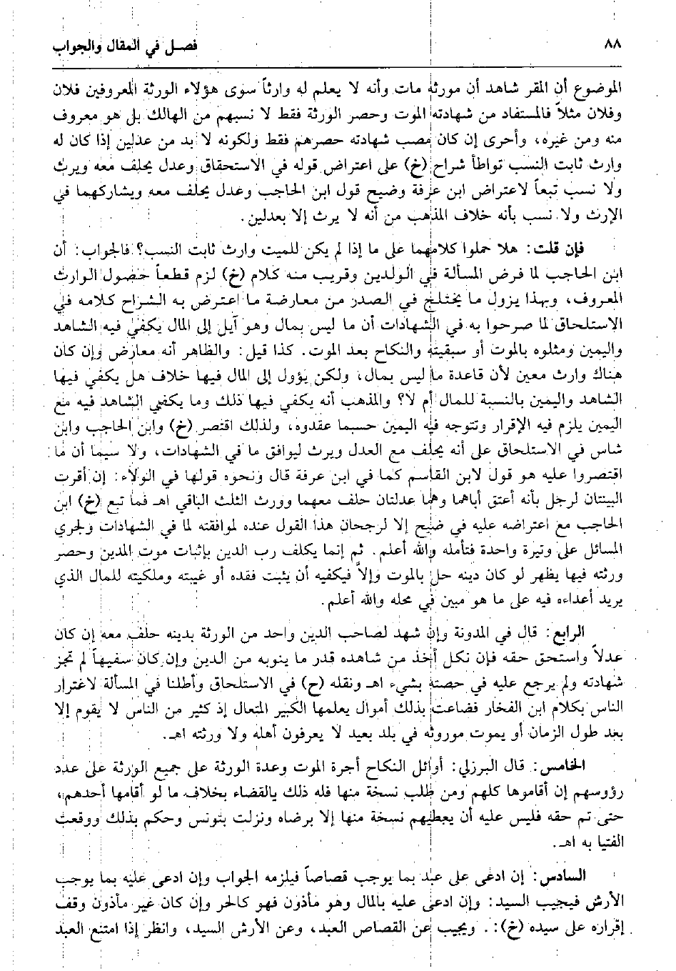 الْمَوْضُوع أَن الْمقر شَاهد أَن مُوَرِثه مَاتَ وَأَنه لَا يعلم لَهُ وَارِثا سوى هَؤُلَاءِ الْوَرَثَة المعروفين فلَان وَفُلَان مثلا فالمستفاد من شَهَادَته الْمَوْت وَحصر الْوَرَثَة فَقَط لَا نسبهم من الْهَالِك بل هُوَ مَعْرُوف مِنْهُ وَمن غَيره، وَأَحْرَى إِن كَانَ مصب شَهَادَته حصرهم فَقَط ولكونه لَا بُد من عَدْلَيْنِ إِذا كَانَ لَهُ وَارِث ثَابت النّسَب تواطأ شرَّاح (خَ) على اعْتِرَاض قَوْله فِي الِاسْتِحْقَاق وَعدل يحلف مَعَه وَيَرِث وَلَا نسب تبعا لاعتراض ابْن عَرَفَة وضيح قَول ابْن الْحَاجِب وَعدل يحلف مَعَه ويشاركهما فِي الْإِرْث وَلَا نسب بِأَنَّهُ خلاف الْمَذْهَب من أَنه لَا يَرث إِلَّا بعدلين. فَإِن قلت: هلا حملُوا كَلَامهمَا على مَا إِذا لم يكن للْمَيت وَارِث ثَابت النّسَب؟ فَالْجَوَاب: أَن ابْن الْحَاجِب لما فرض الْمَسْأَلَة فِي الْوَلَدَيْنِ وَقَرِيب مِنْهُ كَلَام (خَ) لزم قطعا حُصُول الْوَارِث الْمَعْرُوف، وَبِهَذَا يَزُول مَا يختلج فِي الصَّدْر من مُعَارضَة مَا اعْترض بِهِ الشُّرَّاح كَلَامه فِي الِاسْتِلْحَاق لما صَرَّحُوا بِهِ فِي الشَّهَادَات أَن مَا لَيْسَ بِمَال وَهُوَ آيل إِلَى المَال يَكْفِي فِيهِ الشَّاهِد وَالْيَمِين ومثلوه بِالْمَوْتِ أَو سبقيته وَالنِّكَاح بعد الْمَوْت. كَذَا قيل: وَالظَّاهِر أَنه معَارض وَإِن كَانَ هُنَاكَ وَارِث معِين لِأَن قَاعِدَة مَا لَيْسَ بِمَال، وَلَكِن يؤول إِلَى المَال فِيهَا خلاف هَل يَكْفِي فِيهَا الشَّاهِد وَالْيَمِين بِالنِّسْبَةِ لِلْمَالِ أم لَا؟ وَالْمذهب أَنه يَكْفِي فِيهَا ذَلِك وَمَا يَكْفِي الشَّاهِد فِيهِ مَعَ الْيَمين يلْزم فِيهِ الْإِقْرَار وتتوجه فِيهِ الْيَمين حَسْبَمَا عقدوه، وَلذَلِك اقْتصر (خَ) وَابْن الْحَاجِب وَابْن شَاس فِي الِاسْتِلْحَاق على أَنه يحلف مَعَ الْعدْل وَيَرِث ليُوَافق مَا فِي الشَّهَادَات، وَلَا سِيمَا أَن مَا اقتصروا عَلَيْهِ هُوَ قَول لِابْنِ الْقَاسِم كَمَا فِي ابْن عَرَفَة قَالَ وَنَحْوه قَوْلهَا فِي الْوَلَاء: إِن أقرَّت الْبَيِّنَتَانِ لرجل بِأَنَّهُ أعتق أباهما وهما عدلتان حلف مَعَهُمَا وَورث الثُّلُث الْبَاقِي اه فَمَا تبع (خَ) ابْن الْحَاجِب مَعَ اعتراضه عَلَيْهِ فِي ضيح إِلَّا لرجحان هَذَا القَوْل عِنْده لموافقته لما فِي الشَّهَادَات ولجري الْمسَائِل على وتيرة وَاحِدَة فَتَأَمّله وَالله أعلم. ثمَّ إِنَّمَا يُكَلف رب الدّين بِإِثْبَات موت الْمَدِين وَحصر ورثته فِيهَا يظْهر لَو كَانَ دينه حل بِالْمَوْتِ وإلاَّ فيكفيه أَن يثبت فَقده أَو غيبته وملكيته لِلْمَالِ الَّذِي يُرِيد أعداءه فِيهِ على مَا هُوَ مُبين فِي مَحَله وَالله أعلم. الرَّابِع: قَالَ فِي الْمُدَوَّنَة وَإِن شهد لصَاحب الدّين وَاحِد من الْوَرَثَة بِدِينِهِ حلف مَعَه إِن كَانَ عدلا وَاسْتحق حَقه فَإِن نكل أَخذ من شَاهده قدر مَا ينوبه من الدّين وَإِن كَانَ سَفِيها لم تجز شَهَادَته وَلم يرجع عَلَيْهِ فِي حِصَّته بِشَيْء اه وَنَقله (ح) فِي الِاسْتِلْحَاق وأطلنا فِي الْمَسْأَلَة لاغترار النَّاس بِكَلَام ابْن الفخار فَضَاعَت بذلك أَمْوَال يعلمهَا الْكَبِير المتعال إِذْ كثير من النَّاس لَا يقوم إِلَّا بعد طول الزَّمَان أَو يَمُوت موروثه فِي بلد بعيد لَا يعْرفُونَ أَهله وَلَا ورثته اه. الْخَامِس: قَالَ الْبُرْزُليّ: أَوَائِل النِّكَاح أُجْرَة الْمَوْت وعدة الْوَرَثَة على جَمِيع الْوَرَثَة على عدد رؤوسهم إِن أقاموها كلهم وَمن طلب نُسْخَة مِنْهَا فَلهُ ذَلِك بِالْقضَاءِ بِخِلَاف مَا لَو أَقَامَهَا أحدهم، حَتَّى تمّ حَقه فَلَيْسَ عَلَيْهِ أَن يعطيهم نُسْخَة مِنْهَا إِلَّا بِرِضَاهُ وَنزلت بتونس وَحكم بذلك وَوَقعت الْفتيا بِهِ اه. السَّادِس: إِن ادّعى على عبد بِمَا يُوجب قصاصا فَيلْزمهُ الْجَواب وَإِن ادّعى عَلَيْهِ بِمَا يُوجب الْأَرْش فيجيب السَّي