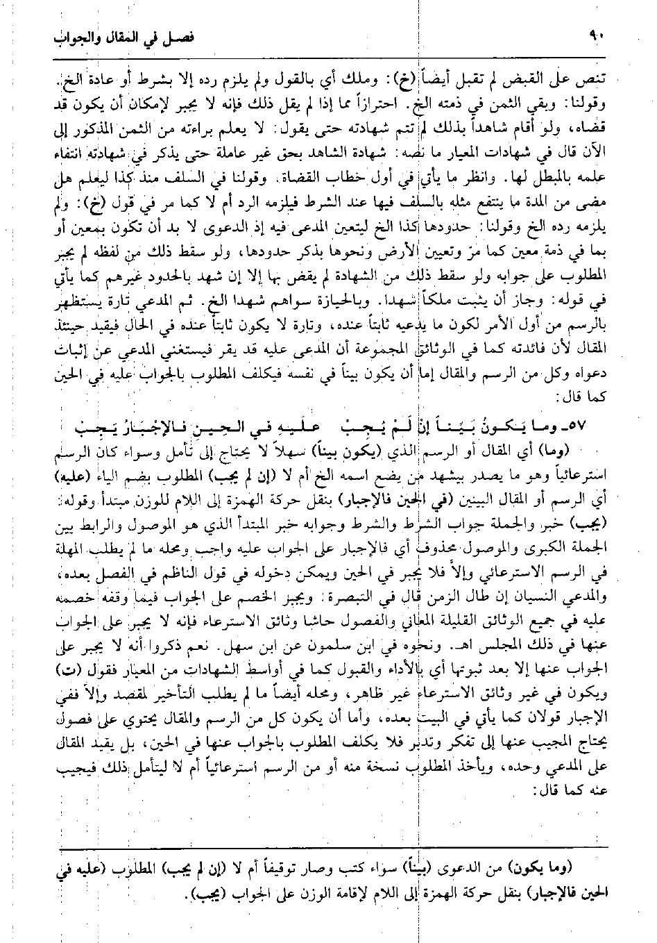 تنص على الْقَبْض، فَإِن الْمَطْلُوب لَا يجْبر لِإِمْكَان أَن لَا يكون قد قَبضه فَلَا يلْزمه رده وَلَو شهِدت الْبَيِّنَة بذلك وَلم تنص على الْقَبْض لم تقبل أَيْضا (خَ) : وَملك أَي بالْقَوْل وَلم يلْزم رده إِلَّا بِشَرْط أَو عَادَة الخ. وَقَوْلنَا: وَبَقِي الثّمن فِي ذمَّته الخ. احْتِرَازًا مِمَّا إِذا لم يقل ذَلِك فَإِنَّهُ لَا يجْبر لِإِمْكَان أَن يكون قد قَضَاهُ، وَلَو أَقَامَ شَاهدا بذلك لم تتمّ شَهَادَته حَتَّى يَقُول: لَا يعلم بَرَاءَته من الثّمن الْمَذْكُور إِلَى الْآن قَالَ فِي شَهَادَات المعيار مَا نَصه: شَهَادَة الشَّاهِد بِحَق غير عاملة حَتَّى يذكر فِي شَهَادَته انْتِفَاء علمه بالمبطل لَهَا. وَانْظُر مَا يَأْتِي فِي أول خطاب الْقُضَاة. وَقَوْلنَا فِي السّلف مُنْذُ كَذَا ليعلم هَل مضى من الْمدَّة مَا ينْتَفع مثله بالسلف فِيهَا عِنْد الشَّرْط فَيلْزمهُ الرَّد أم لَا كَمَا مر فِي قَول (خَ) : وَلم يلْزمه رده الخ وَقَوْلنَا: حُدُودهَا كَذَا الخ ليتعين الْمُدعى فِيهِ إِذْ الدَّعْوَى لَا بُد أَن تكون بِمعين أَو بِمَا فِي ذمَّة معِين كَمَا مرّ وَتَعْيِين الأَرْض وَنَحْوهَا بِذكر حُدُودهَا، وَلَو سقط ذَلِك من لَفظه لم يجْبر الْمَطْلُوب على جَوَابه وَلَو سقط ذَلِك من الشَّهَادَة لم يقْض بهَا إِلَّا إِن شهد بالحدود غَيرهم كَمَا يَأْتِي فِي قَوْله: وَجَاز أَن يثبت ملكا شَهدا. وبالحيازة سواهُم شَهدا الخ. ثمَّ الْمُدَّعِي تَارَة يستظهر بالرسم من أول الْأَمر لكَون مَا يَدعِيهِ ثَابتا عِنْده، وَتارَة لَا يكون ثَابتا عِنْده فِي الْحَال فيقيد حِينَئِذٍ الْمقَال لِأَن فَائِدَته كَمَا فِي الوثائق الْمَجْمُوعَة أَن الْمُدعى عَلَيْهِ قد يقر فيستغني الْمُدَّعِي عَن إِثْبَات دَعْوَاهُ وكل من الرَّسْم والمقال إِمَّا أَن يكون بَينا فِي نَفسه فيكلف الْمَطْلُوب بِالْجَوَابِ عَلَيْهِ فِي الْحِين كَمَا قَالَ: وَمَا يَكونُ بَيِّناً إنْ لَمْ يُجِبْ علَيهِ فِي الحِينِ فالإجْبَارُ يَجِبْ (وَمَا) أَي الْمقَال أَو الرَّسْم الَّذِي (يكون بَينا) سهلاً لَا يحْتَاج إِلَى تَأمل وَسَوَاء كَانَ الرَّسْم استرعائياً وَهُوَ مَا يصدر بيشهد من يضع اسْمه الخ أم لَا (إِن لم يجب) الْمَطْلُوب بِضَم الْيَاء (عَلَيْهِ) أَي الرَّسْم أَو الْمقَال البينين (فِي الْحِين فالإجبار) بِنَقْل حَرَكَة الْهمزَة إِلَى اللَّام للوزن مُبْتَدأ وَقَوله: (يجب) خبر وَالْجُمْلَة جَوَاب الشَّرْط وَالشّرط وَجَوَابه خبر الْمُبْتَدَأ الَّذِي هُوَ الْمَوْصُول والرابط بَين الْجُمْلَة الْكُبْرَى والموصول مَحْذُوف أَي فالإجبار على الْجَواب عَلَيْهِ وَاجِب وَمحله مَا لم يطْلب المهلة فِي الرَّسْم الاسترعائي وإلاَّ فَلَا يجْبر فِي الْحِين وَيُمكن دُخُوله فِي قَول النَّاظِم فِي الْفَصْل بعده وَالْمُدَّعِي النسْيَان إِن طَال الزَّمن قَالَ فِي التَّبْصِرَة: وَيجْبر الْخصم على الْجَواب فِيمَا وَقفه خَصمه عَلَيْهِ فِي جَمِيع الوثائق القليلة الْمعَانِي والفصول حاشا وثائق الاسترعاء فَإِنَّهُ لَا يجْبر على الْجَواب عَنْهَا فِي ذَلِك الْمجْلس اه. وَنَحْوه فِي ابْن سَلمُون عَن ابْن سهل. نعم ذكرُوا أَنه لَا يجْبر على الْجَواب عَنْهَا إِلَّا بعد ثُبُوتهَا أَي بِالْأَدَاءِ وَالْقَبُول كَمَا فِي أواسط الشَّهَادَات من المعيار فَقَوْل (ت) وَيكون فِي غير وثائق الاسترعاء غير ظَاهر، وَمحله أَيْضا مَا لم يطْلب التَّأْخِير لمقصد وإلاَّ فَفِي الْإِجْبَار قَولَانِ كَمَا يَأْتِي فِي الْبَيْت بعده، وَأما أَن يكون كل من الرَّسْم والمقال يحتوي على فُصُول يحْتَاج الْمُجيب عَنْهَا إِلَى تفكر وتدبر فَلَا يُكَلف الْمَطْلُوب بِالْجَوَابِ عَنْهَا فِي الْحِين، بل يُقيد الْمقَال على الْمُدَّعِي وَحده، وَيَأْخُذ الْمَطْلُوب نُسْخَة مِنْهُ أَو من الرَّسْم استرعائياً أم لَا ليتأمل ذَلِك فيجيب عَنهُ كَمَا قَالَ: