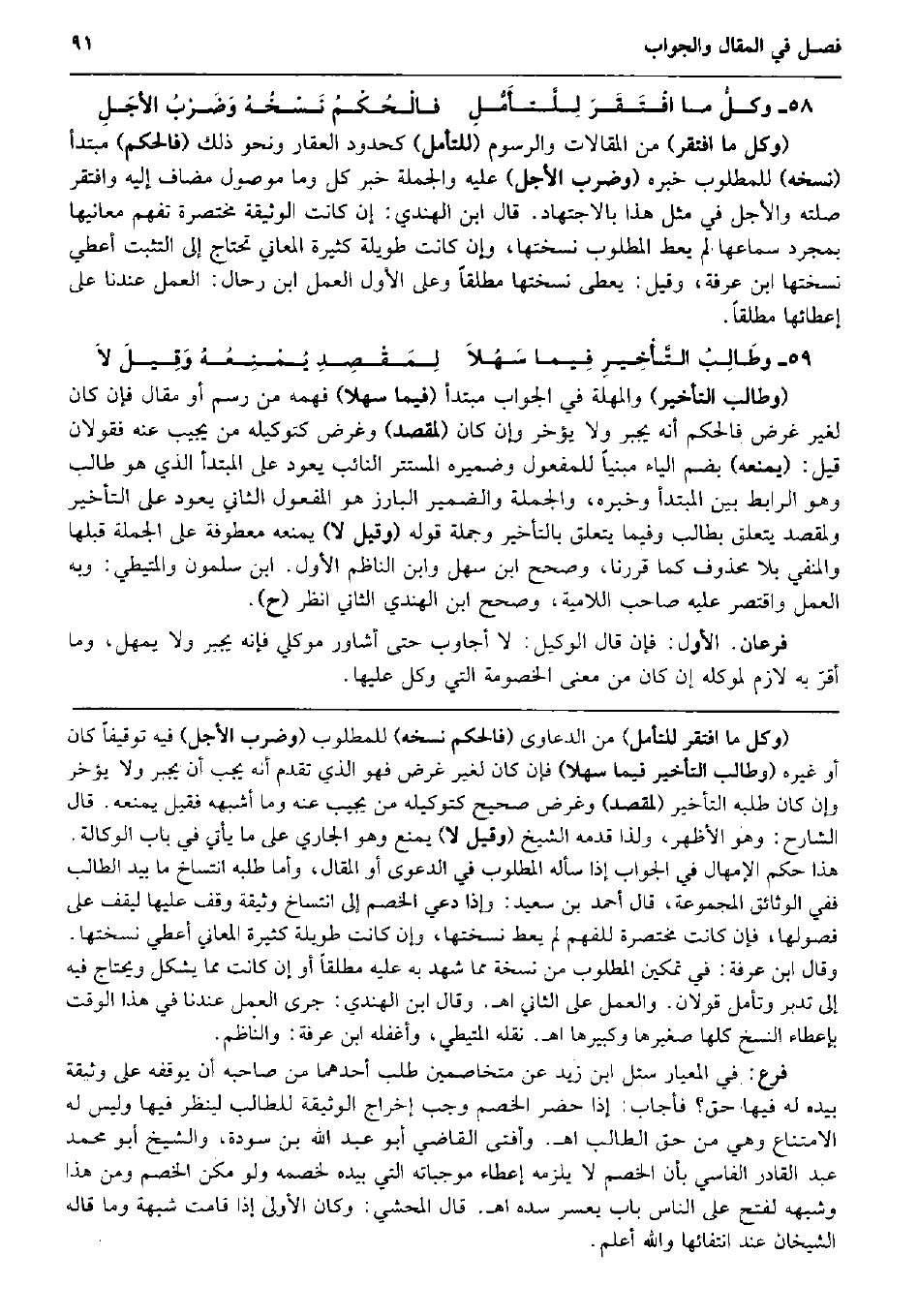 وكلُّ مَا افْتَقَرَ لِلَّتأَمُّلِ فالْحُكْمُ نَسْخُهُ وَضَرْبُ الأجَلِ (وكل مَا افْتقر) من المقالات والرسوم (للتأمل) كحدود الْعقار وَنَحْو ذَلِك (فَالْحكم) مُبْتَدأ (نسخه) للمطلوب خَبره (وَضرب الْأَجَل) عَلَيْهِ وَالْجُمْلَة خبر كل وَمَا مَوْصُول مُضَاف إِلَيْهِ وافتقر صلته وَالْأَجَل فِي مثل هَذَا بِالِاجْتِهَادِ. قَالَ ابْن الْهِنْدِيّ: إِن كَانَت الْوَثِيقَة مختصرة تفهم مَعَانِيهَا بِمُجَرَّد سماعهَا لم يُعْط الْمَطْلُوب نسختها، وَإِن كَانَت طَوِيلَة كَثِيرَة الْمعَانِي تحْتَاج إِلَى التثبت أعطي نسختها ابْن عَرَفَة، وَقيل: يعْطى نسختها مُطلقًا وعَلى الأول الْعَمَل ابْن رحال: الْعَمَل عندنَا على إعطائها مُطلقًا. وطَالِبُ التَّأْخِيرِ فِيما سَهُلاَ لِمَقْصِدِ يُمْنِعُهُ وَقِيلَ لاَ (وطالب التَّأْخِير) والمهلة فِي الْجَواب مُبْتَدأ (فِيمَا سهلا) فهمه من رسم أَو مقَال فَإِن كَانَ لغير غَرَض فَالْحكم أَنه يجْبر وَلَا يُؤَخر وَإِن كَانَ (لمقصد) وغرض كتوكيله من يُجيب عَنهُ فَقَوْلَانِ قيل: (يمنعهُ) بِضَم الْيَاء مَبْنِيا للْمَفْعُول وضميره الْمُسْتَتر النَّائِب يعود على الْمُبْتَدَأ الَّذِي هُوَ طَالب وَهُوَ الرابط بَين الْمُبْتَدَأ وَخَبره، وَالْجُمْلَة وَالضَّمِير البارز هُوَ الْمَفْعُول الثَّانِي يعود على التَّأْخِير ولمقصد يتَعَلَّق بطالب وَفِيمَا يتَعَلَّق بِالتَّأْخِيرِ وَجُمْلَة قَوْله (وَقيل لَا) يمنعهُ معطوفة على الْجُمْلَة قبلهَا والمنفي بِلَا مَحْذُوف كَمَا قَررنَا، وَصحح ابْن سهل وَابْن النَّاظِم الأول. ابْن سَلمُون والمتيطي: وَبِه الْعَمَل وَاقْتصر عَلَيْهِ صَاحب اللامية، وَصحح ابْن الْهِنْدِيّ الثَّانِي انْظُر (ح) . فرعان. الأول: فَإِن قَالَ الْوَكِيل: لَا أجاوب حَتَّى أشاور موكلي فَإِنَّهُ يجْبر وَلَا يُمْهل، وَمَا أقرّ بِهِ لَازم لمُوكلِه إِن كَانَ من معنى الْخُصُومَة الَّتِي وكل عَلَيْهَا.