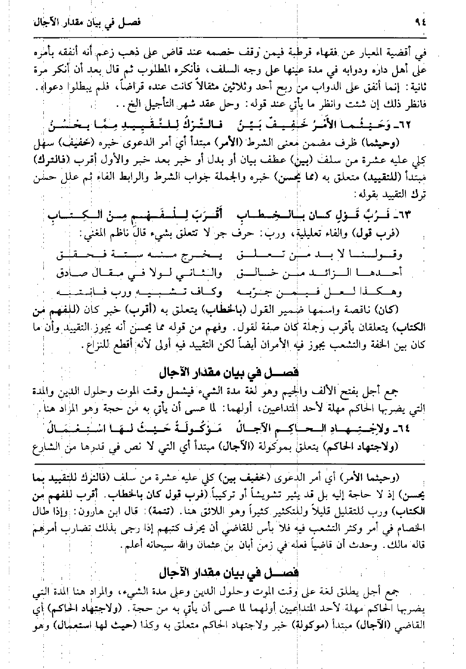 جمع أجل بِفَتْح الْألف وَالْجِيم وَهُوَ لُغَة مُدَّة الشَّيْء فَيشْمَل وَقت الْمَوْت وحلول الدّين والمدة الَّتِي يضْربهَا الْحَاكِم مهلة لأحد المتداعيين، أَولهمَا: لما عَسى أَن يَأْتِي بِهِ من حجَّة وَهُوَ المُرَاد هُنَا. ولاِجْتِهادِ الحاكِمِ الآجالُ مَوْكُولَةٌ حَيْثُ لهَا اسْتِعْمَالُ (ولاجتهاد الْحَاكِم) يتَعَلَّق بموكولة (الْآجَال) مُبْتَدأ أَي الَّتِي لَا نَص فِي قدرهَا من الشَّارِع