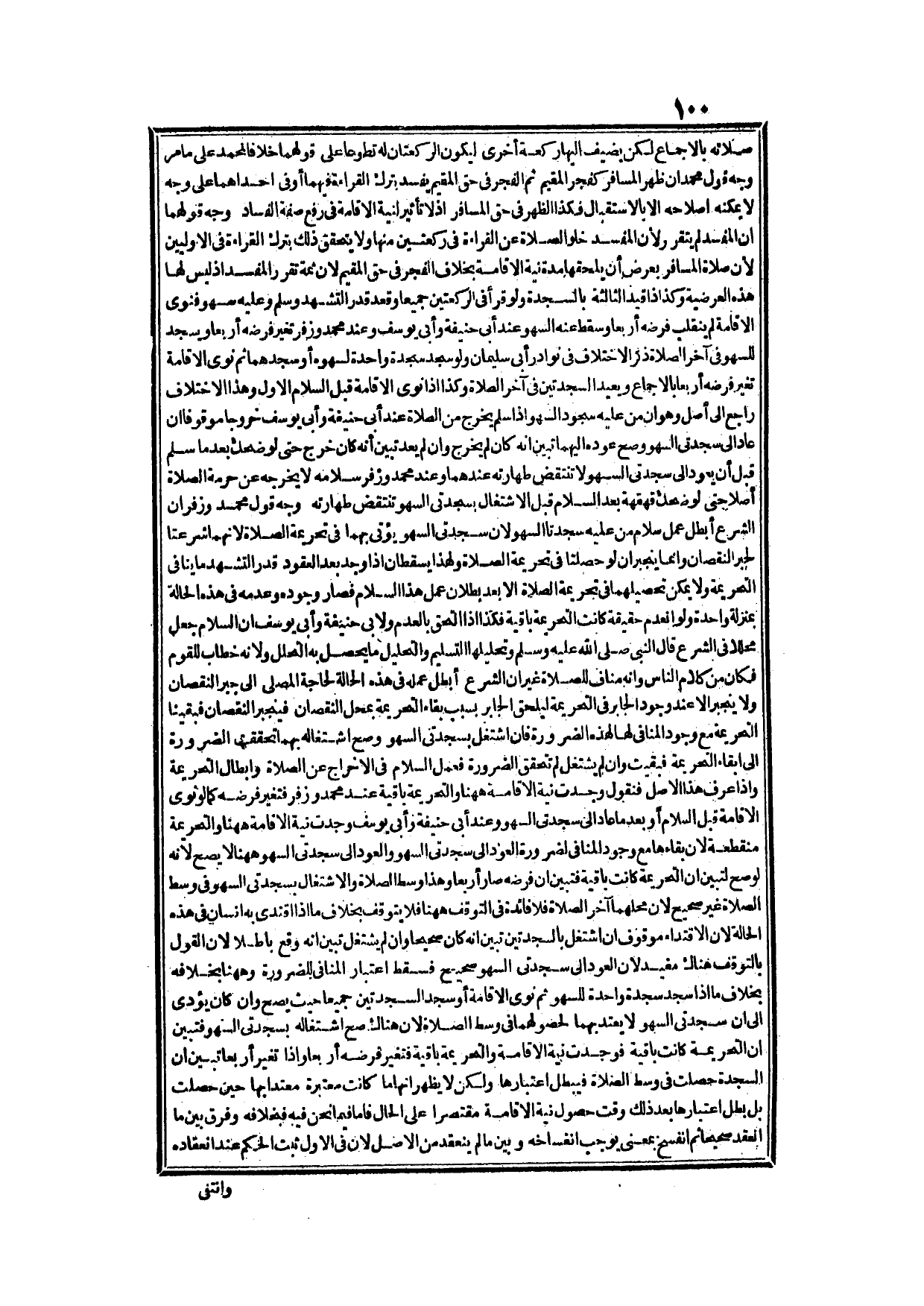 (وَجْهُ) قَوْلِ مُحَمَّدٍ أَنَّ ظُهْرَ الْمُسَافِرِ كَفَجْرِ الْمُقِيمِ، ثُمَّ الْفَجْرُ فِي حَقِّ الْمُقِيمِ يَفْسُدُ بِتَرْكِ الْقِرَاءَةِ فِيهِمَا أَوْ فِي إحْدَاهُمَا عَلَى وَجْهٍ لَا يُمْكِنُهُ إصْلَاحُهُ إلَّا بِالِاسْتِقْبَالِ، فَكَذَا الظُّهْرُ فِي حَقِّ الْمُسَافِرِ إذْ لَا تَأْثِيرَ لِنِيَّةِ الْإِقَامَةِ فِي رَفْعِ صِفَةِ الْفَسَادِ (وَجْهُ) قَوْلِهِمَا أَنَّ الْمُفْسِدَ لَمْ يَتَقَرَّرْ؛ لِأَنَّ الْمُفْسِدَ خُلُوُّ الصَّلَاةِ عَنْ الْقِرَاءَةِ فِي رَكْعَتَيْنِ مِنْهَا وَلَا يَتَحَقَّقُ ذَلِكَ بِتَرْكِ الْقِرَاءَةِ فِي الْأُولَيَيْنِ؛ لِأَنَّ صَلَاةَ الْمُسَافِرِ بِغَرَضِ أَنْ يَلْحَقَهَا مُدَّةُ نِيَّةِ الْإِقَامَةِ بِخِلَافِ الْفَجْرِ فِي حَقِّ الْمُقِيمِ؛ لِأَنَّ ثَمَّةَ تَقَرَّرَ الْمُفْسِدُ إذْ لَيْسَ لَهَا هَذِهِ الْعَرَضِيَّةُ، وَكَذَا إذَا قَيَّدَ الثَّالِثَةَ بِالسَّجْدَةِ وَلَوْ قَرَأَ فِي الرَّكْعَتَيْنِ جَمِيعًا وَقَعَدَ قَدْرَ التَّشَهُّدِ وَسَلَّمَ وَعَلَيْهِ سَهْوٌ فَنَوَى الْإِقَامَةَ لَمْ يَنْقَلِبْ فَرْضُهُ أَرْبَعًا وَسَقَطَ عَنْهُ السَّهْوُ عِنْدَ أَبِي حَنِيفَةَ وَأَبِي يُوسُفَ، وَعِنْدَ مُحَمَّدٍ وَزُفَرَ تَغَيَّرَ فَرْضُهُ أَرْبَعًا وَيَسْجُدُ لِلسَّهْوِ فِي آخِرِ الصَّلَاةِ، ذُكِرَ الِاخْتِلَافُ فِي نَوَادِرِ أَبِي سُلَيْمَانَ.