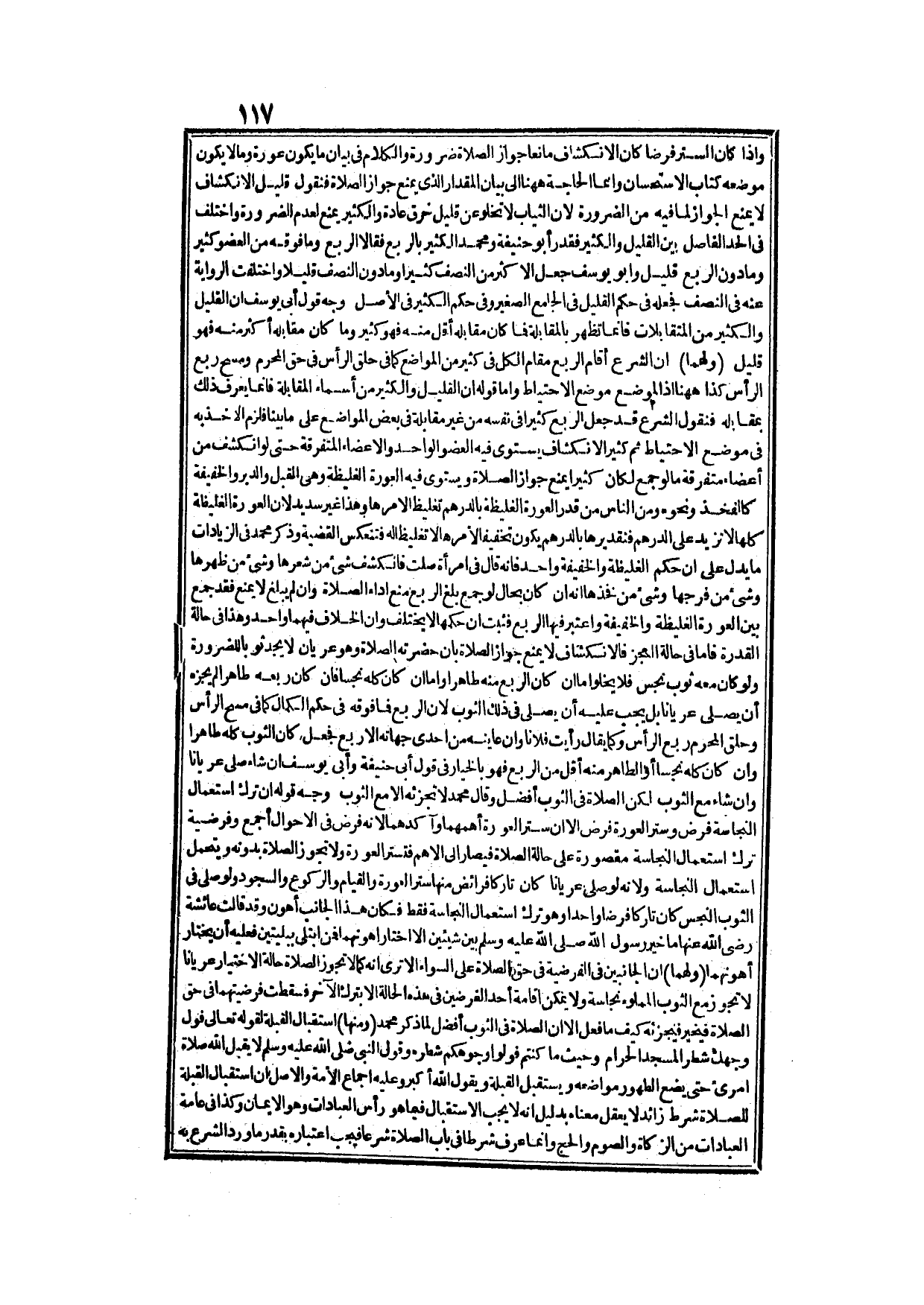 وَإِذَا كَانَ السَّتْرُ فَرْضًا كَانَ الِانْكِشَافُ مَانِعًا جَوَازَ الصَّلَاةِ ضَرُورَةً، وَالْكَلَامُ فِي بَيَانِ مَا يَكُونُ عَوْرَةً وَمَا لَا يَكُونُ مَوْضِعُهُ كِتَابُ الِاسْتِحْسَانِ، وَإِنَّمَا الْحَاجَةُ هَهُنَا إلَى بَيَانِ الْمِقْدَارِ الَّذِي يَمْنَعُ جَوَازَ الصَّلَاةِ فَنَقُولُ: قَلِيلُ الِانْكِشَافِ لَا يَمْنَعُ الْجَوَازَ لِمَا فِيهِ مِنْ الضَّرُورَةِ؛ لِأَنَّ الثِّيَابَ لَا تَخْلُو عَنْ قَلِيلِ خَرْقٍ عَادَةً وَالْكَثِيرُ يَمْنَعُ لِعَدَمِ الضَّرُورَةِ، وَاخْتُلِفَ فِي الْحَدِّ الْفَاصِلِ بَيْنَ الْقَلِيلِ وَالْكَثِيرِ فَقَدَّرَ أَبُو حَنِيفَةَ وَمُحَمَّدٌ الْكَثِيرَ بِالرُّبْعِ فَقَالَا: الرُّبْعُ وَمَا فَوْقَهُ مِنْ الْعُضْوِ كَثِيرٌ وَمَا دُونَ الرُّبْعِ قَلِيلٌ وَأَبُو يُوسُفَ جَعَلَ الْأَكْثَرَ مِنْ النِّصْفِ كَثِيرًا، وَمَا دُونَ النِّصْفِ قَلِيلًا، وَاخْتَلَفْت الرِّوَايَةُ عَنْهُ فِي النِّصْفِ، فَجَعَلَهُ فِي حُكْمِ الْقَلِيلِ فِي الْجَامِعِ الصَّغِيرِ، وَفِي حُكْمِ الْكَثِيرِ فِي الْأَصْلِ.
