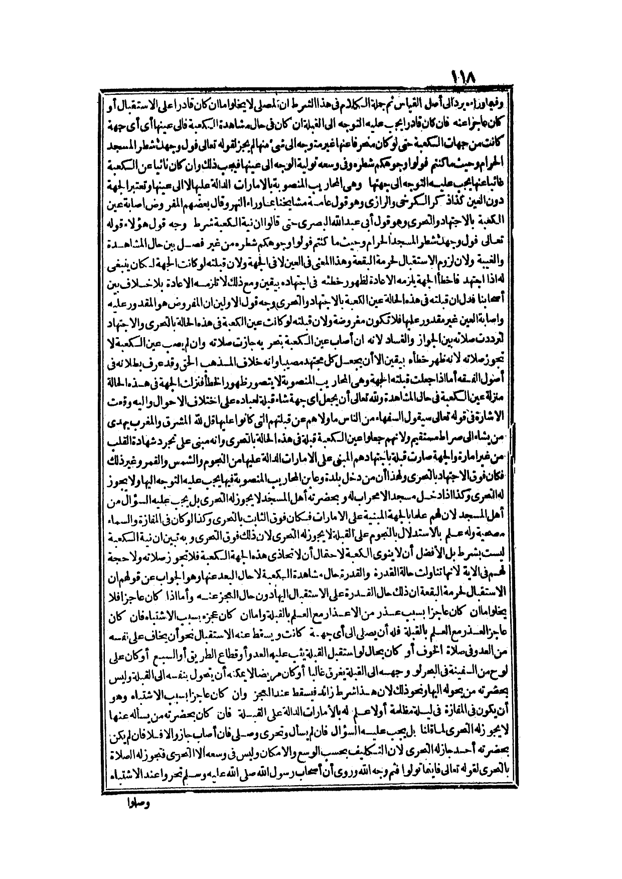 وَفِيمَا وَرَاءَهُ يُرَدُّ إلَى أَصْلِ الْقِيَاسِ، ثُمَّ جُمْلَةُ الْكَلَامِ فِي هَذَا الشَّرْطِ أَنَّ الْمُصَلِّيَ لَا يَخْلُو إمَّا إنْ كَانَ قَادِرًا عَلَى الِاسْتِقْبَالِ أَوْ كَانَ عَاجِزًا عَنْهُ فَإِنْ كَانَ قَادِرًا يَجِبُ عَلَيْهِ التَّوَجُّهُ إلَى الْقِبْلَةِ إنْ كَانَ فِي حَالِ مُشَاهَدَةِ الْكَعْبَةِ فَإِلَى عَيْنِهَا، أَيْ: أَيِّ جِهَةٍ كَانَتْ مِنْ جِهَاتِ الْكَعْبَةِ، حَتَّى لَوْ كَانَ مُنْحَرِفًا عَنْهَا غَيْرَ مُتَوَجِّهٍ إلَى شَيْءٍ مِنْهَا لَمْ يَجُزْ، لِقَوْلِهِ تَعَالَى: {فَوَلِّ وَجْهَكَ شَطْرَ الْمَسْجِدِ الْحَرَامِ وَحَيْثُ مَا كُنْتُمْ فَوَلُّوا وُجُوهَكُمْ شَطْرَهُ} [البقرة: 144] ، وَفِي وُسْعِهِ تَوْلِيَةُ الْوَجْهِ إلَى عَيْنِهَا فَيَجِبُ ذَلِكَ، وَإِنْ كَانَ نَائِيًا عَنْ الْكَعْبَةِ غَائِبًا عَنْهَا يَجِبُ عَلَيْهِ التَّوَجُّهُ إلَى جِهَتِهَا، وَهِيَ الْمَحَارِيبُ الْمَنْصُوبَةُ بِالْإِمَارَاتِ الدَّالَّةِ عَلَيْهَا لَا إلَى عَيْنِهَا، وَتُعْتَبَرُ الْجِهَةُ دُونَ الْعَيْنِ.