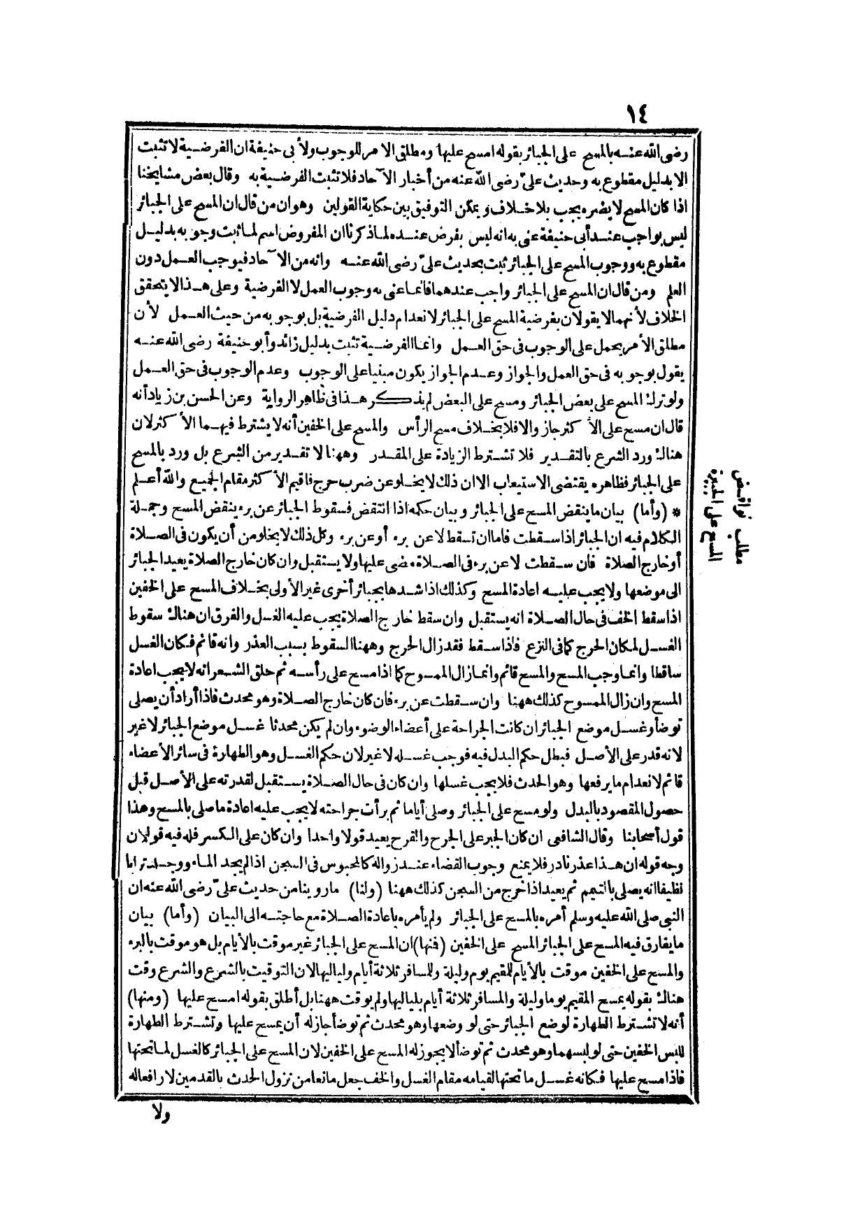 وَمَنْ قَالَ إنَّ الْمَسْحَ عَلَى الْجَبَائِرِ وَاجِبٌ عِنْدَهُمَا فَإِنَّمَا عَنَى بِهِ وُجُوبَ الْعَمَلِ لَا الْفَرْضِيَّةَ، وَعَلَى هَذَا لَا يَتَحَقَّقُ الْخِلَافُ لِأَنَّهُمَا يَقُولَانِ بِفَرْضِيَّةِ الْمَسْحِ عَلَى الْجَبَائِرِ لِانْعِدَامِ دَلِيلِ الْفَرْضِيَّةِ، بَلْ بِوُجُوبِهِ مِنْ حَيْثُ الْعَمَلُ؛ لِأَنَّ مُطْلَقَ الْأَمْرِ يُحْمَلُ عَلَى الْوُجُوب فِي حَقِّ الْعَمَلِ، وَإِنَّمَا الْفَرْضِيَّةُ تَثْبُتُ بِدَلِيلٍ زَائِدٍ، وَأَبُو حَنِيفَةَ - رَضِيَ اللَّهُ عَنْهُ - يَقُولُ بِوُجُوبِهِ فِي حَقِّ الْعَمَلِ، وَالْجَوَازُ، وَعَدَمُ الْجَوَازِ يَكُونُ مَبْنِيًّا عَلَى الْوُجُوبِ، وَعَدَمُ الْوُجُوبِ فِي حَقِّ الْعَمَلِ، وَلَوْ تَرَكَ الْمَسْحَ عَلَى بَعْضِ الْجَبَائِرِ، وَمَسَحَ عَلَى الْبَعْضِ لَمْ يَذْكُرْ هَذَا فِي ظَاهِرِ الرِّوَايَةِ.