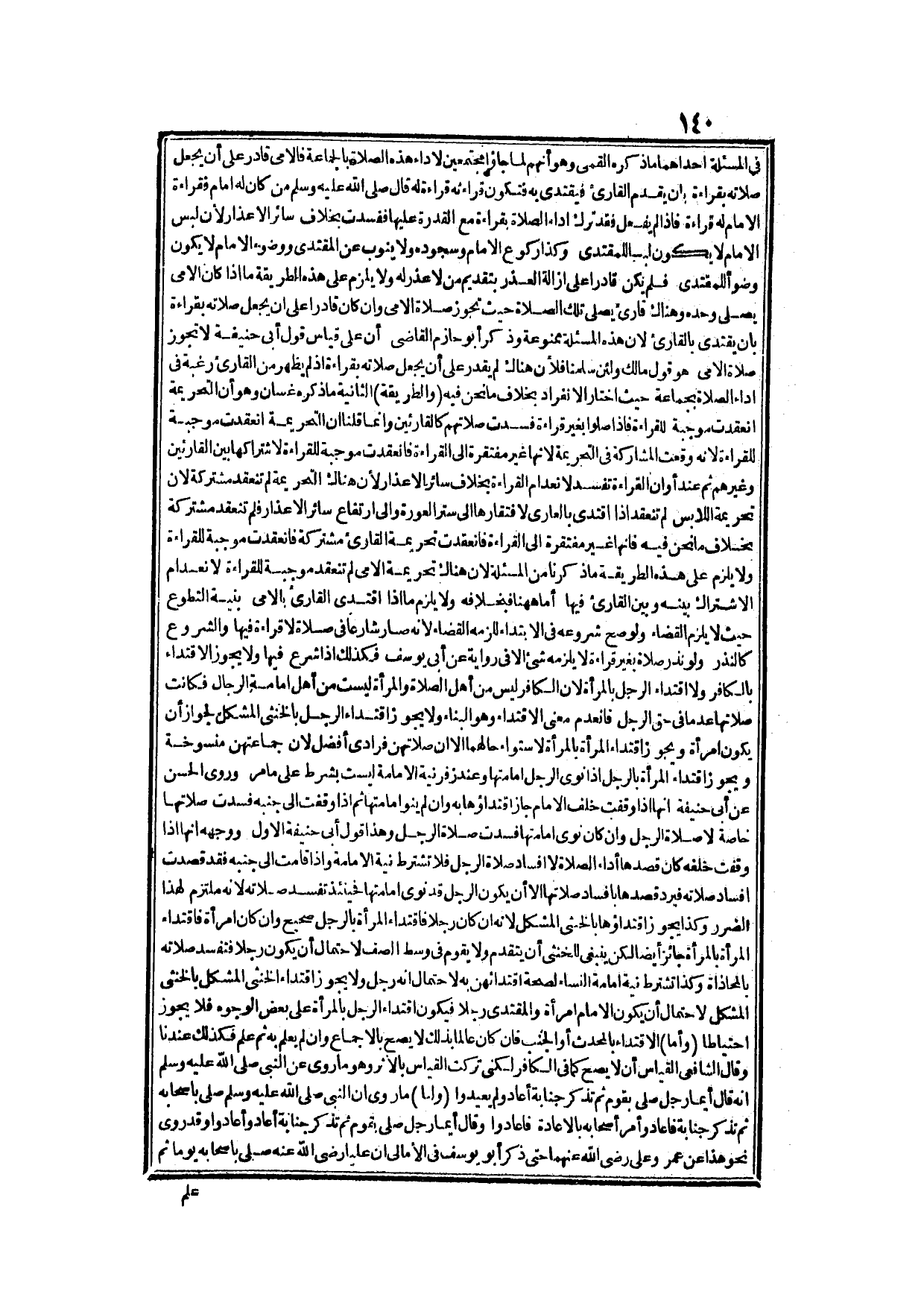 فِي الْمَسْأَلَةِ: إحْدَاهُمَا - مَا ذَكَرَهُ الْقُمِّيُّ وَهُوَ أَنَّهُمْ لَمَّا جَاءُوا مُجْتَمِعِينَ لِأَدَاءِ هَذِهِ الصَّلَاةِ بِالْجَمَاعَةِ - فَالْأُمِّيُّ قَادِرٌ عَلَى أَنْ يَجْعَلَ صَلَاتَهُ بِقِرَاءَةٍ، بِأَنْ يُقَدِّمَ الْقَارِئَ فَيَقْتَدِيَ بِهِ فَتَكُونَ قِرَاءَتُهُ قِرَاءَةً لَهُ، قَالَ - صَلَّى اللَّهُ عَلَيْهِ وَسَلَّمَ -: «مَنْ كَانَ لَهُ إمَامٌ فَقِرَاءَةُ الْإِمَامِ لَهُ قِرَاءَةٌ» فَإِذَا لَمْ يَفْعَلْ فَقَدْ تَرَكَ أَدَاءَ الصَّلَاةِ بِقِرَاءَةٍ مَعَ الْقُدْرَةِ عَلَيْهَا فَفَسَدَتْ، بِخِلَافِ سَائِرِ الْأَعْذَارِ؛ لِأَنَّ لُبْسَ الْإِمَامِ يَكُونُ لُبْسًا لِلْمُقْتَدِي، وَكَذَا رُكُوعُ الْإِمَامِ وَسُجُودُهُ، وَلَا يَنُوبُ عَنْ الْمُقْتَدِي، وَوُضُوءُ الْإِمَامِ لَا يَكُونُ وُضُوءً لِلْمُقْتَدِي فَلَمْ يَكُنْ قَادِرًا عَلَى إزَالَةِ الْعُذْرِ بِتَقْدِيمِ مَنْ لَا عُذْرَ لَهُ، وَلَا يَلْزَم عَلَى هَذِهِ الطَّرِيقَةِ مَا إذَا كَانَ الْأُمِّيُّ يُصَلِّي وَحْدَهُ وَهُنَاكَ قَارِئٌ يُصَلِّي تِلْكَ الصَّلَاةَ، حَيْثُ تَجُوزُ صَلَاةُ الْأُمِّيِّ وَإِنْ كَانَ قَادِرًا عَلَى أَنْ يَجْعَلَ صَلَاتَهُ بِقِرَاءَةٍ بِأَنْ يَقْتَدِيَ بِالْقَارِئِ؛ لِأَنَّ هَذِهِ الْمَسْأَلَةَ مَمْنُوعَةٌ، وَذَكَرَ أَبُو حَازِمٍ الْقَاضِي أَنَّ عَلَى قِيَاسِ قَوْلِ أَبِي حَنِيفَةَ لَا تَجُوزُ صَلَاةُ الْأُمِّيِّ، هُوَ قَوْلُ مَالِكٍ، وَلَئِنْ سَلَّمْنَا فَلِأَنَّ هُنَاكَ لَمْ يَقْدِرْ عَلَى أَنْ يَجْعَلَ صَلَاتَهُ بِقِرَاءَةٍ إذَا لَمْ يَظْهَرْ مِنْ الْقَارِئِ رَغْبَةٌ فِي أَدَاءِ الصَّلَاةِ بِجَمَاعَةٍ حَيْثُ اخْتَارَ الِانْفِرَادَ، بِخِلَافِ مَا نَحْنُ فِيهِ.