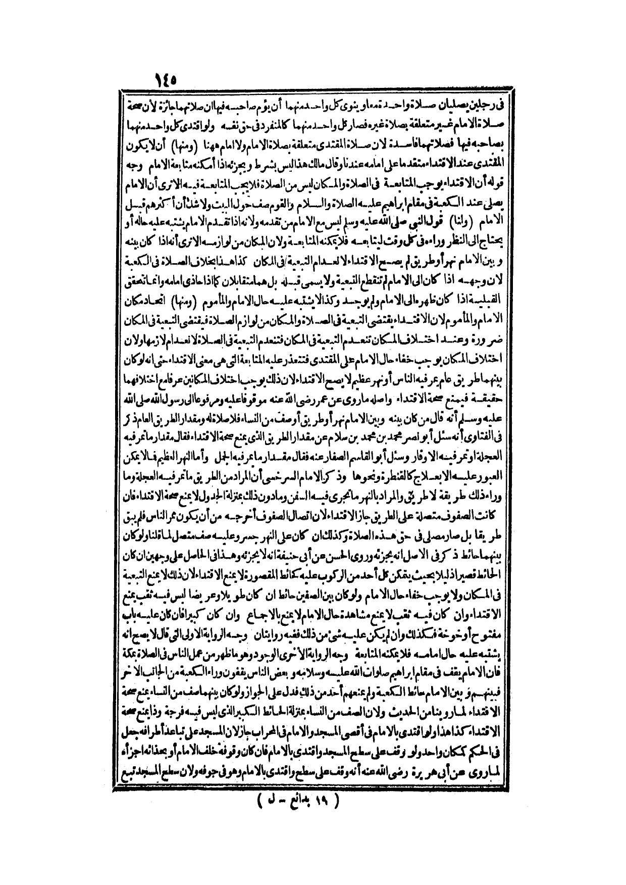(وَمِنْهَا) - اتِّحَادُ مَكَانِ الْإِمَامِ وَالْمَأْمُومِ، وَلِأَنَّ الِاقْتِدَاءَ يَقْتَضِي التَّبَعِيَّةَ فِي الصَّلَاةِ، وَالْمَكَانُ مِنْ لَوَازِمِ الصَّلَاةِ فَيَقْتَضِي التَّبَعِيَّةَ فِي الْمَكَانِ ضَرُورَةً، وَعِنْدَ اخْتِلَافِ الْمَكَانِ تَنْعَدِمُ التَّبَعِيَّةُ فِي الْمَكَانِ فَتَنْعَدِمُ التَّبَعِيَّةُ فِي الصَّلَاةِ لِانْعِدَامِ لَازِمِهَا؛ وَلِأَنَّ اخْتِلَافَ الْمَكَانِ يُوجِبُ خَفَاءَ حَالِ الْإِمَامِ عَلَى الْمُقْتَدِي فَتَتَعَذَّرُ عَلَيْهِ الْمُتَابَعَةُ الَّتِي هِيَ مَعْنَى الِاقْتِدَاءِ، حَتَّى أَنَّهُ لَوْ كَانَ بَيْنَهُمَا طَرِيقٌ عَامٌّ يَمُرُّ فِيهِ النَّاسُ أَوْ نَهْرٌ عَظِيمٌ لَا يَصِحَّ الِاقْتِدَاءُ؛ لِأَنَّ ذَلِكَ يُوجِبُ اخْتِلَافَ الْمَكَانَيْنِ عُرْفًا مَعَ اخْتِلَافِهِمَا حَقِيقَةً فَيَمْنَعُ صِحَّةَ الِاقْتِدَاءِ، وَأَصْلُهُ مَا رُوِيَ عَنْ عُمَرَ - رَضِيَ اللَّهُ عَنْهُ - مَوْقُوفًا عَلَيْهِ وَمَرْفُوعًا إلَى رَسُولِ اللَّهِ - صَلَّى اللَّهُ عَلَيْهِ وَسَلَّمَ - أَنَّهُ قَالَ:: «مَنْ كَانَ بَيْنَهُ وَبَيْنَ الْإِمَامِ نَهْرٌ أَوْ طَرِيقٌ أَوْ صَفٌّ مِنْ النِّسَاءِ فَلَا صَلَاةَ لَهُ» ، وَمِقْدَارُ الطَّرِيقِ الْعَامُّ ذُكِرَ فِي الْفَتَاوَى أَنَّهُ سُئِلَ أَبُو نَصْرٍ مُحَمَّدُ بْنُ مُحَمَّدِ بْنِ سَلَّامٍ عَنْ مِقْدَارِ الطَّرِيقِ الَّذِي يَمْنَعُ صِحَّةَ الِاقْتِدَاءِ فَقَالَ: مِقْدَارُ مَا تَمُرُّ فِيهِ الْعَجَلَةُ وَتَمُرُّ فِيهِ الْأَوْقَارُ، وَسُئِلَ أَبُو الْقَاسِمِ الصَّفَّارُ عَنْهُ فَقَالَ: مِقْدَارُ مَا يَمُرُّ فِيهِ الْجَمَلُ.