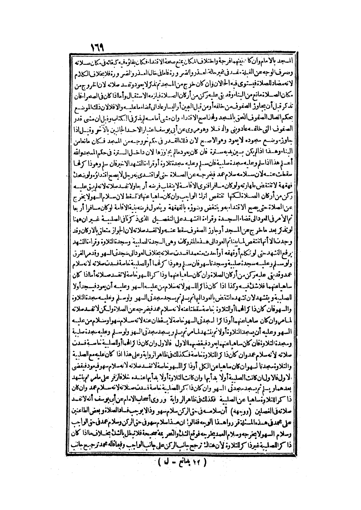 وَإِنْ مَشَى أَمَامَهُ، لَمْ يُذْكَرْ فِي الْكِتَابِ، وَقِيلَ: إنْ مَشَى قَدْرَ الصُّفُوفِ الَّتِي خَلْفَهُ عَادَ وَبَنَى وَإِلَّا فَلَا، وَهُوَ مَرْوِيٌّ عَنْ أَبِي يُوسُفَ اعْتِبَارًا لِأَحَدِ الْجَانِبَيْنِ بِالْآخَرِ، وَقِيلَ: إذَا جَاوَزَ مَوْضِعَ سُجُودِهِ لَا يَعُودُ، وَهُوَ الْأَصَحُّ؛ لِأَنَّ ذَلِكَ الْقَدْرَ فِي حُكْمِ خُرُوجِهِ مِنْ الْمَسْجِدِ فَكَانَ مَانِعًا مِنْ الْبِنَاءِ، وَهَذَا إذَا لَمْ يَكُنْ بَيْنَ يَدَيْهِ سُتْرَةٌ فَإِنْ كَانَ يَعُودُ مَا لَمْ يُجَاوِزْهَا؛ لِأَنَّ دَاخِلَ السُّتْرَةِ فِي حُكْمِ الْمَسْجِدِ وَاَللَّهُ أَعْلَمُ هَذَا إذَا سَلَّمَ وَعَلَيْهِ سَجْدَةٌ صُلْبِيَّةٌ فَإِنْ سَلَّمَ وَعَلَيْهِ سَجْدَةُ تِلَاوَةٍ، أَوْ قِرَاءَةُ التَّشَهُّدِ الْأَخِيرِ - فَإِنْ سَلَّمَ وَهُوَ ذَاكِرٌ لَهَا سَقَطَتْ عَنْهُ؛ لِأَنَّ سَلَامَهُ سَلَامَ عَمْدٍ فَيُخْرِجُهُ عَنْ الصَّلَاةِ، حَتَّى لَوْ اقْتَدَى بِهِ رَجُلٌ لَا يَصِحُّ اقْتِدَاؤُهُ.