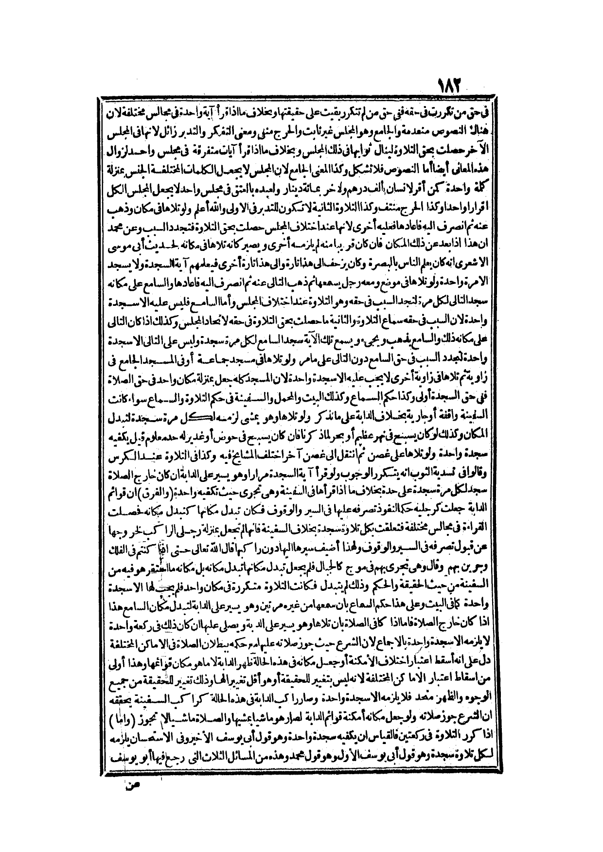 وَلَوْ تَلَاهَا فِي مَسْجِدِ جَمَاعَةٍ أَوْ فِي الْمَسْجِدِ الْجَامِعِ فِي زَاوِيَةٍ ثُمَّ تَلَاهَا فِي زَاوِيَةٍ أُخْرَى لَا يَجِبُ عَلَيْهِ إلَّا سَجْدَةٌ وَاحِدَةٌ؛ لِأَنَّ الْمَسْجِدَ كُلَّهُ جُعِلَ بِمَنْزِلَةِ مَكَان وَاحِدٍ فِي حَقِّ الصَّلَاةِ فَفِي حَقِّ السَّجْدَةِ أَوْلَى، وَكَذَا حُكْمُ السَّمَاعِ، وَكَذَلِكَ الْبَيْتُ وَالْمَحْمَلُ وَالسَّفِينَةُ فِي حُكْمِ التِّلَاوَةِ وَالسَّمَاعِ سَوَاءٌ كَانَتْ السَّفِينَةُ وَاقِفَةً، أَوْ جَارِيَةً بِخِلَافِ الدَّابَّةِ عَلَى مَا نَذْكُرُ.