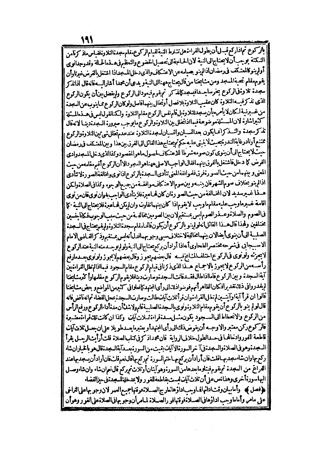وَلَا شَكَّ أَنَّ مُدَّةَ أَدَاءِ الرُّكُوعِ وَرَفْعِ الرَّأْسَ مِنْ الرُّكُوعِ وَالِانْحِطَاطِ إلَى السُّجُودِ يَكُونُ مِثْلَ مُدَّةِ قِرَاءَةِ ثَلَاثِ آيَاتٍ، وَكَذَا إنْ كَانَتْ تِلْكَ قِرَاءَةً مُعْتَبَرَةً فَالرُّكُوعُ رُكْنٌ مُعْتَبَرٌ، وَالْأَوْجَهُ أَنْ يُفَوِّضَ ذَلِكَ إلَى رَأْيِ الْمُجْتَهِد، أَوْ يَعْتَبِرَ مَا يُعَدُّ طَوِيلًا عَلَى أَنْ جَعَلَ ثَلَاثَ آيَاتٍ قَاطِعَةً لِلْفَوْرِ، وَإِدْخَالُهَا فِي حَدِّ الطُّولِ خِلَافُ الرِّوَايَةِ فَإِنَّ مُحَمَّدًا ذَكَرَ فِي كِتَابِ الصَّلَاةِ قُلْتُ: أَرَأَيْتَ الرَّجُلَ يَقْرَأُ السَّجْدَةَ وَهُوَ فِي الصَّلَاةِ وَالسَّجْدَةُ فِي آخِرِ السُّورَةِ إلَّا آيَاتٍ بَقِيَتْ مِنْ السُّورَةِ بَعْدَ آيَةِ السَّجْدَةِ قَالَ: هُوَ بِالْخِيَارِ إنْ شَاءَ رَكَعَ بِهَا، وَإِنْ شَاءَ سَجَدَ بِهَا قُلْت: فَإِنْ أَرَادَ أَنْ يَرْكَعَ بِهَا خَتَمَ السُّورَةَ ثُمَّ رَكَعَ بِهَا قَالَ: نَعَمْ قُلْت: فَإِنْ أَرَادَ أَنْ يَسْجُدَ بِهَا عِنْدَ الْفَرَاغِ مِنْ السَّجْدَةِ ثُمَّ يَقُومَ فَيَتْلُوَ مَا بَعْدَهَا مِنْ السُّورَةِ وَهُوَ آيَتَانِ أَوْ ثَلَاثٌ ثُمَّ يَرْكَعَ قَالَ: نَعَمْ إنْ شَاءَ وَإِنْ شَاءَ وَصَلَ إلَيْهَا سُورَةً أُخْرَى.