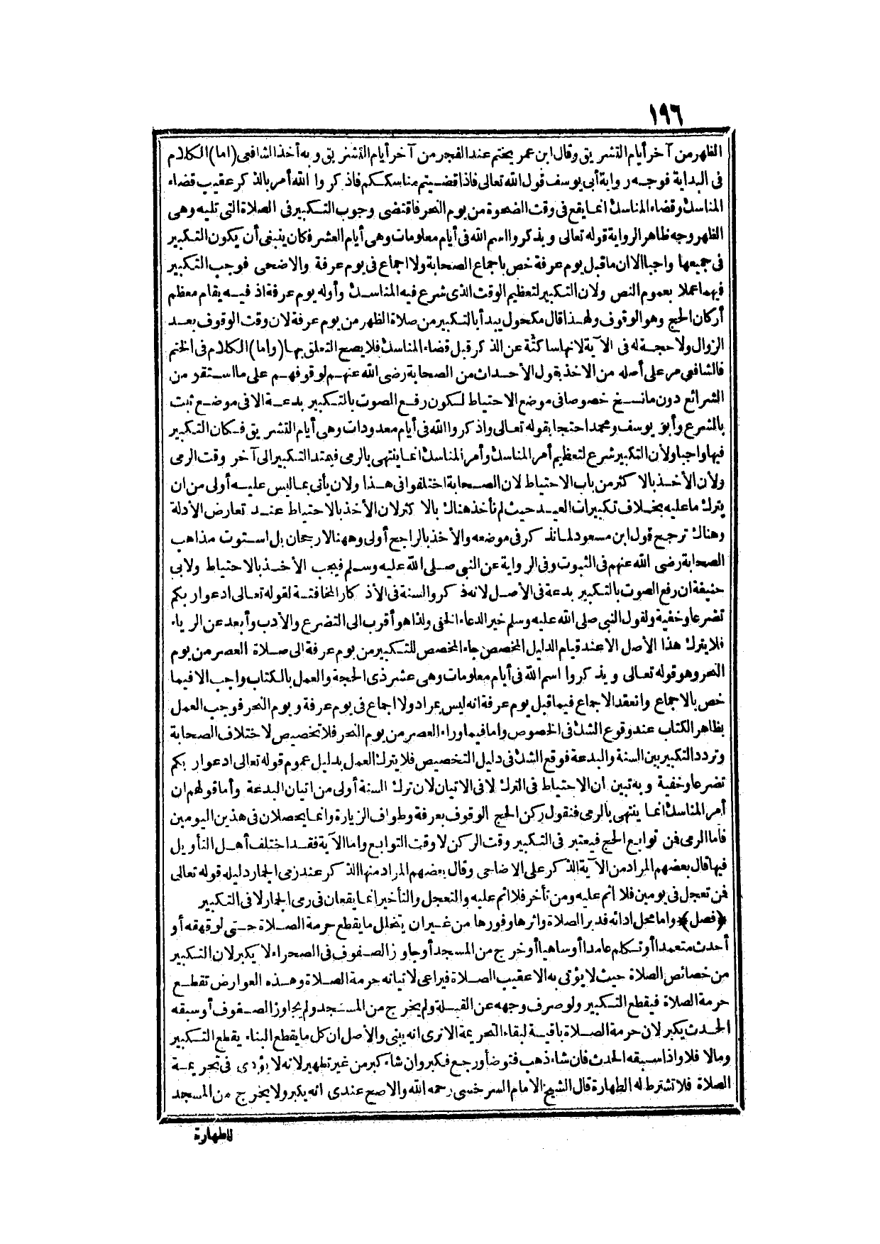 وَأَمَّا قَوْلُهُمْ إنَّ أَمْرَ الْمَنَاسِكِ إنَّمَا يَنْتَهِي بِالرَّمْيِ فَنَقُولُ رُكْنُ الْحَجِّ، الْوُقُوفُ بِعَرَفَةَ، وَطَوَافُ الزِّيَارَةِ، وَإِنَّمَا يَحْصُلَانِ فِي هَذَيْنِ الْيَوْمَيْنِ فَأَمَّا الرَّمْيُ فَمِنْ تَوَابِعِ الْحَجِّ فَيُعْتَبَرُ فِي التَّكْبِيرِ وَقْتُ الرُّكْنِ لَا وَقْتُ التَّوَابِعِ.