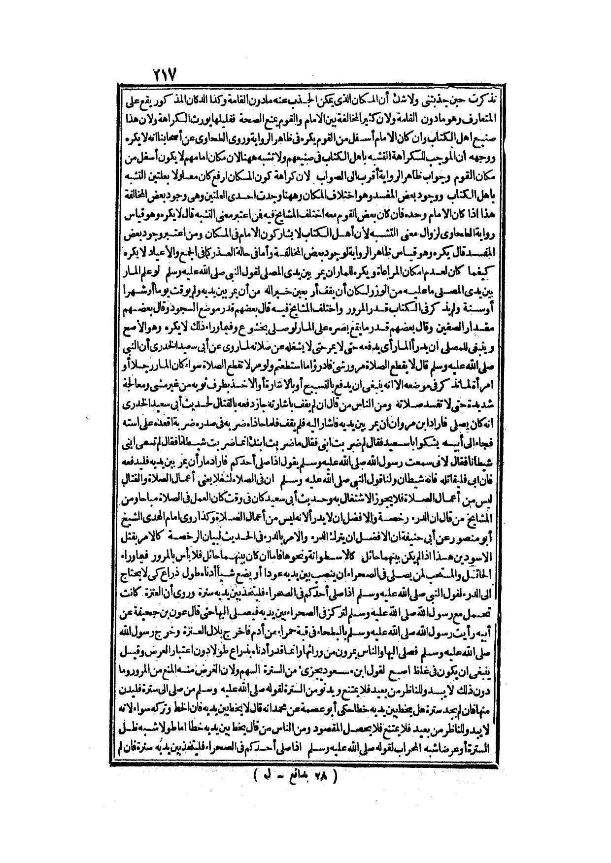 وَكَذَا رَوَى إمَامُ الْهُدَى الشَّيْخُ أَبُو مَنْصُورٍ عَنْ أَبِي حَنِيفَةَ أَنَّ الْأَفْضَلَ أَنْ يُتْرَكَ الدَّرْءُ، وَالْأَمْرُ بِالدَّرْءِ فِي الْحَدِيثِ لِبَيَانِ الرُّخْصَةِ كَالْأَمْرِ بِقَتْلِ الْأَسْوَدَيْنِ هَذَا إذَا لَمْ يَكُنْ بَيْنَهُمَا حَائِلٌ كَالْأُسْطُوَانَةِ وَنَحْوِهَا، فَأَمَّا إنْ كَانَ بَيْنَهُمَا حَائِلٌ فَلَا بَأْسَ بِالْمُرُورِ فِيمَا وَرَاءَ الْحَائِلِ وَالْمُسْتَحَبُّ لِمَنْ يُصَلِّي فِي الصَّحْرَاءِ أَنْ يَنْصِبَ بَيْنَ يَدَيْهِ عُودًا أَوْ يَضَعَ شَيْئًا أَدْنَاهُ طُولُ ذِرَاعٍ كَيْ لَا يَحْتَاجَ إلَى الدَّرْءِ؛ لِقَوْلِ النَّبِيِّ - صَلَّى اللَّهُ عَلَيْهِ وَسَلَّمَ - «إذَا صَلَّى أَحَدُكُمْ فِي الصَّحْرَاءِ فَلْيَتَّخِذْ بَيْنَ يَدَيْهِ سُتْرَةً» .