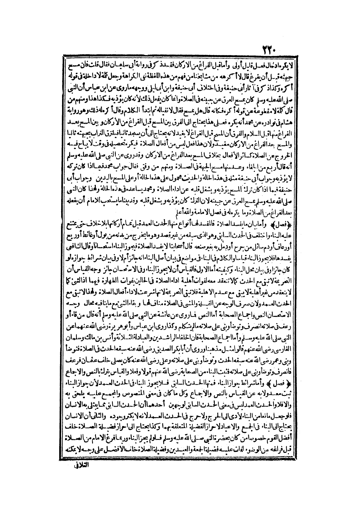 فَالْمُفْسِدُ لَهَا أَنْوَاعٌ، مِنْهَا الْحَدَثُ الْعَمْدُ قَبْلَ تَمَامِ أَرْكَانِهَا بِلَا خِلَافٍ حَتَّى يَمْتَنِعَ عَلَيْهِ الْبِنَاءُ، وَاخْتُلِفَ فِي الْحَدَثِ السَّابِقِ وَهُوَ الَّذِي سَبَقَهُ مِنْ غَيْرِ قَصْدٍ وَهُوَ مَا يَخْرُجُ مِنْ بَدَنِهِ مِنْ بَوْلٍ أَوْ غَائِطٍ أَوْ رِيحٍ أَوْ رُعَافٍ أَوْ دَمٍ سَائِلٍ مِنْ جُرْحٍ أَوْ دُمَّلٍ بِهِ بِغَيْرِ صُنْعِهِ قَالَ أَصْحَابُنَا: لَا يُفْسِدُ الصَّلَاةَ فَيَجُوزُ الْبِنَاءُ اسْتِحْسَانًا، وَقَالَ الشَّافِعِيُّ: يُفْسِدُهَا فَلَا يَجُوزُ الْبِنَاءُ قِيَاسًا، وَالْكَلَامُ فِي الْبِنَاءِ فِي مَوَاضِعَ، فِي بَيَانِ أَصْلِ الْبِنَاءِ أَنَّهُ جَائِزٌ أَمْ لَا؟ ، وَفِي بَيَانِ شَرَائِطِ جَوَازِهِ لَوْ كَانَ جَائِزًا، وَفِي بَيَانِ مَحَلِّ الْبِنَاءِ وَكَيْفِيَّتِهِ.