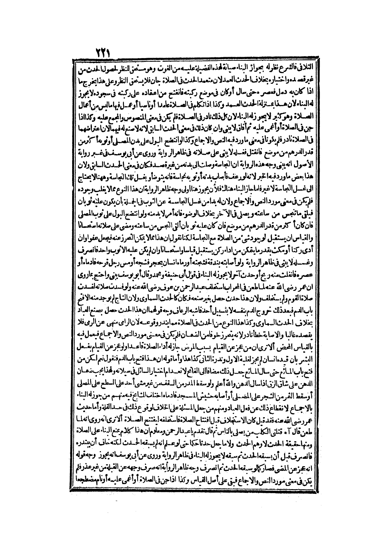 التَّلَاقِي فَالشَّرْعُ نَظَرَ لَهُ بِجَوَازِ الْبِنَاءِ صِيَانَةً لِهَذِهِ الْفَضِيلَةِ عَلَيْهِ مِنْ الْفَوْتِ وَهُوَ مُسْتَحِقٌّ لِلنَّظَرِ لِحُصُولِ الْحَدَثِ مِنْ غَيْرِ قَصْدِهِ وَاخْتِيَارِهِ بِخِلَافِ الْحَدَثِ الْعَمْدِ؛ لِأَنَّ مُتَعَمِّدَ الْحَدَثِ فِي الصَّلَاةِ جَانٍ فَلَا يَسْتَحِقُّ النَّظَرَ، وَعَلَى هَذَا يُخَرَّجُ مَا إذَا كَانَ بِهِ دُمَّلٌ فَعَصَرَهُ حَتَّى سَالَ، أَوْ كَانَ فِي مَوْضِعِ رُكْبَتِهِ فَانْتَفَخَ مِنْ اعْتِمَادِهِ عَلَى رُكْبَتِهِ فِي سُجُودِهِ لَا يَجُوزُ لَهُ الْبِنَاءُ؛ لِأَنَّ هَذَا بِمَنْزِلَةِ الْحَدَثِ الْعَمْدِ، وَكَذَا إذَا تَكَلَّمَ فِي الصَّلَاةِ عَامِدًا أَوْ نَاسِيًا أَوْ عَمِلَ فِيهَا مَا لَيْسَ مِنْ أَعْمَالِ الصَّلَاةِ وَهُوَ كَثِيرٌ لَا يَجُوزُ لَهُ الْبِنَاءُ؛ لِأَنَّ كُلَّ ذَلِكَ نَادِرٌ فِي الصَّلَاةِ فَلَمْ يَكُنْ فِي مَعْنَى الْمَنْصُوصِ وَالْمُجْمَعِ عَلَيْهِ، وَكَذَا إذَا جُنَّ فِي الصَّلَاةِ أَوْ أُغْمِيَ عَلَيْهِ ثُمَّ أَفَاقَ لَا يَبْنِي وَإِنْ كَانَ ذَلِكَ فِي مَعْنَى الْحَدَثِ السَّابِقِ؛ لِأَنَّهُ لَا صُنْعَ لَهُ فِيهِمَا؛ لِأَنَّ اعْتِرَاضَهُمَا فِي الصَّلَاةِ نَادِرٌ فَلَمْ يَكُونَا فِي مَعْنَى مَا وَرَدَ فِيهِ النَّصُّ وَالْإِجْمَاعُ، وَكَذَا لَوْ انْتَضَحَ الْبَوْلُ عَلَى بَدَنِ الْمُصَلِّي أَوْ ثَوْبِهِ أَكْثَرَ مِنْ قَدْرِ الدِّرْهَمِ مِنْ مَوْضِعٍ فَانْفَتَلَ فَغَسَلَهُ لَا يَبْنِي عَلَى صَلَاتِهِ فِي ظَاهِرِ الرِّوَايَةِ، وَرُوِيَ عَنْ أَبِي يُوسُفَ فِي غَيْرِ رِوَايَةِ الْأُصُولِ أَنَّهُ يَبْنِي.