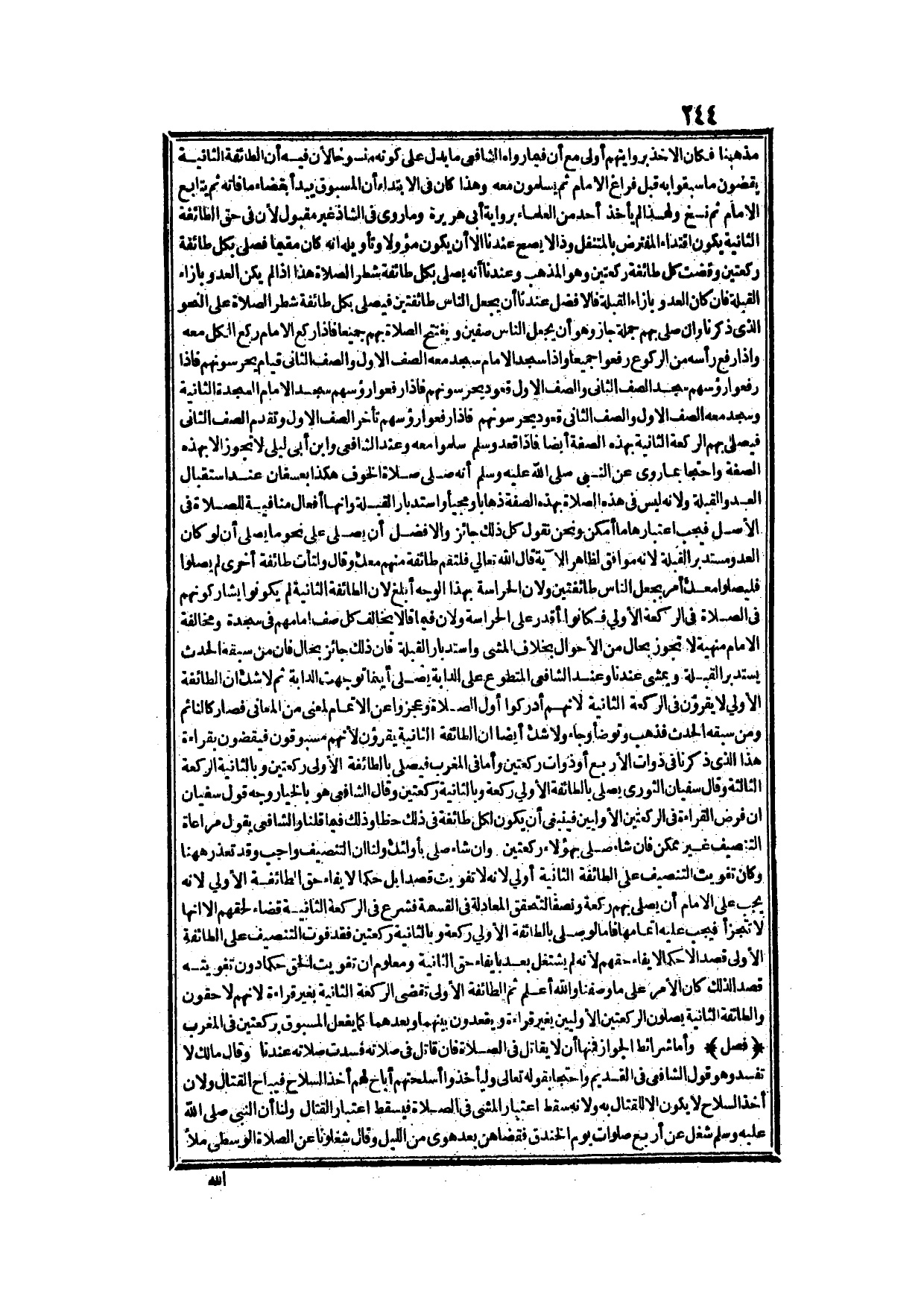 مَذْهَبِنَا فَكَانَ الْأَخْذُ بِرِوَايَتِهِمْ أَوْلَى مَعَ أَنَّ فِيمَا رَوَاهُ الشَّافِعِيُّ مَا يَدُلُّ عَلَى كَوْنِهِ مَنْسُوخًا؛ لِأَنَّ فِيهِ أَنَّ الطَّائِفَةَ الثَّانِيَةَ يَقْضُونَ مَا سُبِقُوا بِهِ قَبْلَ فَرَاغِ الْإِمَامِ ثُمَّ يُسَلِّمُونَ مَعَهُ، وَهَذَا كَانَ فِي الِابْتِدَاءِ أَنَّ الْمَسْبُوقَ يَبْدَأُ بِقَضَاءِ مَا فَاتَهُ ثُمَّ يُتَابِعُ الْإِمَامَ ثُمَّ نُسِخَ، وَلِهَذَا لَمْ يَأْخُذْ أَحَدٌ مِنْ الْعُلَمَاءِ بِرِوَايَةِ أَبِي هُرَيْرَةَ، وَمَا رُوِيَ فِي الشَّاذِّ غَيْرُ مَقْبُولٍ؛ لِأَنَّ فِي حَقِّ الطَّائِفَةِ الثَّانِيَةِ يَكُونُ اقْتِدَاءَ الْمُفْتَرِضِ بِالْمُتَنَفَّلِ وَذَا لَا يَصِحُّ عِنْدَنَا إلَّا أَنْ يَكُونَ مُؤَوَّلًا وَتَأْوِيلُهُ أَنَّهُ كَانَ مُقِيمًا فَصَلَّى بِكُلِّ طَائِفَةٍ رَكْعَتَيْنِ وَقَضَتْ كُلُّ طَائِفَةٍ رَكْعَتَيْنِ وَهُوَ الْمَذْهَبُ، وَعِنْدَنَا أَنَّهُ يُصَلِّي بِكُلِّ طَائِفَةٍ شَطْرَ الصَّلَاةِ هَذَا إذَا لَمْ يَكُنْ الْعَدُوُّ بِإِزَاءِ الْقِبْلَةِ فَإِنْ كَانَ الْعَدُوُّ بِإِزَاءِ الْقِبْلَةِ فَالْأَفْضَلُ عِنْدَنَا أَنْ يَجْعَلَ النَّاسَ طَائِفَتَيْنِ فَيُصَلِّي بِكُلِّ طَائِفَةٍ شَطْرَ الصَّلَاةِ عَلَى النَّحْوِ الَّذِي ذَكَرْنَا، وَإِنْ صَلَّى بِهِمْ جُمْلَةً جَازَ وَهُوَ أَنْ يَجْعَلَ النَّاسَ صَفَّيْنِ وَيَفْتَتِحَ الصَّلَاةَ بِهِمْ جَمِيعًا فَإِذَا رَكَعَ الْإِمَامُ رَكَعَ الْكُلُّ مَعَهُ وَإِذَا رَفَعَ رَأْسَهُ مِنْ الرُّكُوعِ رَفَعُوا جَمِيعًا وَإِذَا سَجَدَ الْإِمَامُ سَجَدَ مَعَهُ الصَّفُّ الْأَوَّلُ وَالصَّفُّ الثَّانِي قِيَامٌ يَحْرُسُونَهُمْ، فَإِذَا رَفَعُوا رُءُوسَهُمْ سَجَدَ الصَّفُّ الثَّانِي وَالصَّفُّ الْأَوَّلُ قُعُودٌ يَحْرُسُونَهُمْ، فَإِذَا رَفَعُوا رُءُوسَهُمْ سَجَدَ الْإِمَامُ السَّجْدَةَ الثَّانِيَةَ وَسَجَدَ مَعَهُ الصَّفُّ الْأَوَّلُ وَالصَّفُّ الثَّانِي قُعُودٌ يَحْرُسُونَهُمْ، فَإِذَا رَفَعُوا رُءُوسَهُمْ تَأَخَّرَ الصَّفُّ الْأَوَّلُ وَتَقَدَّمَ الصَّفُّ الثَّانِي فَيُصَلِّي بِهِمْ الرَّكْعَةَ الثَّانِيَةَ بِهَذِهِ الصِّفَةِ أَيْضًا، فَإِذَا قَعَدَ وَسَلِّمْ سَلَّمُوا مَعَهُ.