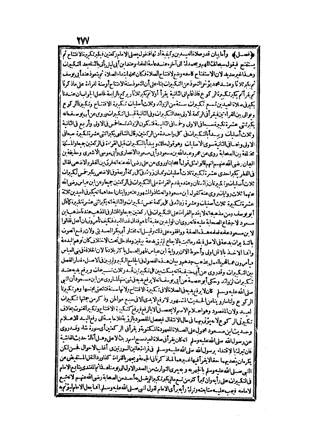 وَرُوِيَ عَنْ عَلِيٍّ - رَضِيَ اللَّهُ عَنْهُ - أَنَّهُ فَرَّقَ بَيْنَ الْفِطْرِ وَالْأَضْحَى فَقَالَ: فِي الْفِطْرِ يُكَبِّرُ إحْدَى عَشْرَةَ تَكْبِيرَةً: ثَلَاثٌ أَصْلِيَّاتٌ وَثَمَانٍ زَوَائِدُ فِي كُلِّ رَكْعَةٍ أَرْبَعَةٌ، وَفِي الْأَضْحَى يُكَبِّرُ خَمْسَ تَكْبِيرَاتٍ: ثَلَاثٌ أَصْلِيَّاتٌ وَتَكْبِيرَتَانِ زَائِدَتَانِ، وَعِنْدَهُ يُقَدِّمُ الْقِرَاءَةَ عَلَى التَّكْبِيرَاتِ فِي الرَّكْعَتَيْنِ جَمِيعًا، عَنْ ابْنِ عَبَّاسٍ - رَضِيَ اللَّهُ عَنْهُمَا - ثَلَاثُ رِوَايَاتٍ رُوِيَ عَنْهُ كَقَوْلِ ابْنِ مَسْعُودٍ وَأَنَّهُ شَاذٌّ، وَالْمَشْهُورُ عَنْهُ رِوَايَتَانِ إحْدَاهُمَا أَنَّهُ يُكَبِّرُ فِي الْعِيدَيْنِ ثَلَاثَةَ عَشْرَةَ تَكْبِيرَةً: ثَلَاثٌ أَصْلِيَّاتٌ وَعَشْرَةٌ زَوَائِدُ، فِي كُلِّ رَكْعَةٍ خَمْسُ تَكْبِيرَاتٍ، وَالثَّانِيَةُ أَنَّهُ يُكَبِّرُ اثْنَيْ عَشْرَةَ تَكْبِيرَةً كَمَا قَالَ أَبُو يُوسُفَ، وَمِنْ مَذْهَبِهِ أَنَّهُ لَا يُقَدِّمُ الْقِرَاءَةَ عَلَى التَّكْبِيرَاتِ فِي الرَّكْعَتَيْنِ جَمِيعًا؛ وَالْمُخْتَارُ فِي الْمَذْهَبِ عِنْدَنَا مَذْهَبُ ابْنِ مَسْعُودٍ لِاجْتِمَاعِ الصَّحَابَةِ عَلَيْهِ فَإِنَّهُ رُوِيَ أَنَّ الْوَلِيدَ بْنَ عُقْبَةَ أَتَاهُمْ فَقَالَ غَدًا الْعِيدُ فَكَيْفَ تَأْمُرُونِي أَنْ أَفْعَلَ فَقَالُوا لِابْنِ مَسْعُودٍ عَلِّمْهُ فَعَلَّمَهُ هَذِهِ الصِّفَةَ وَوَافَقُوهُ عَلَى ذَلِكَ.