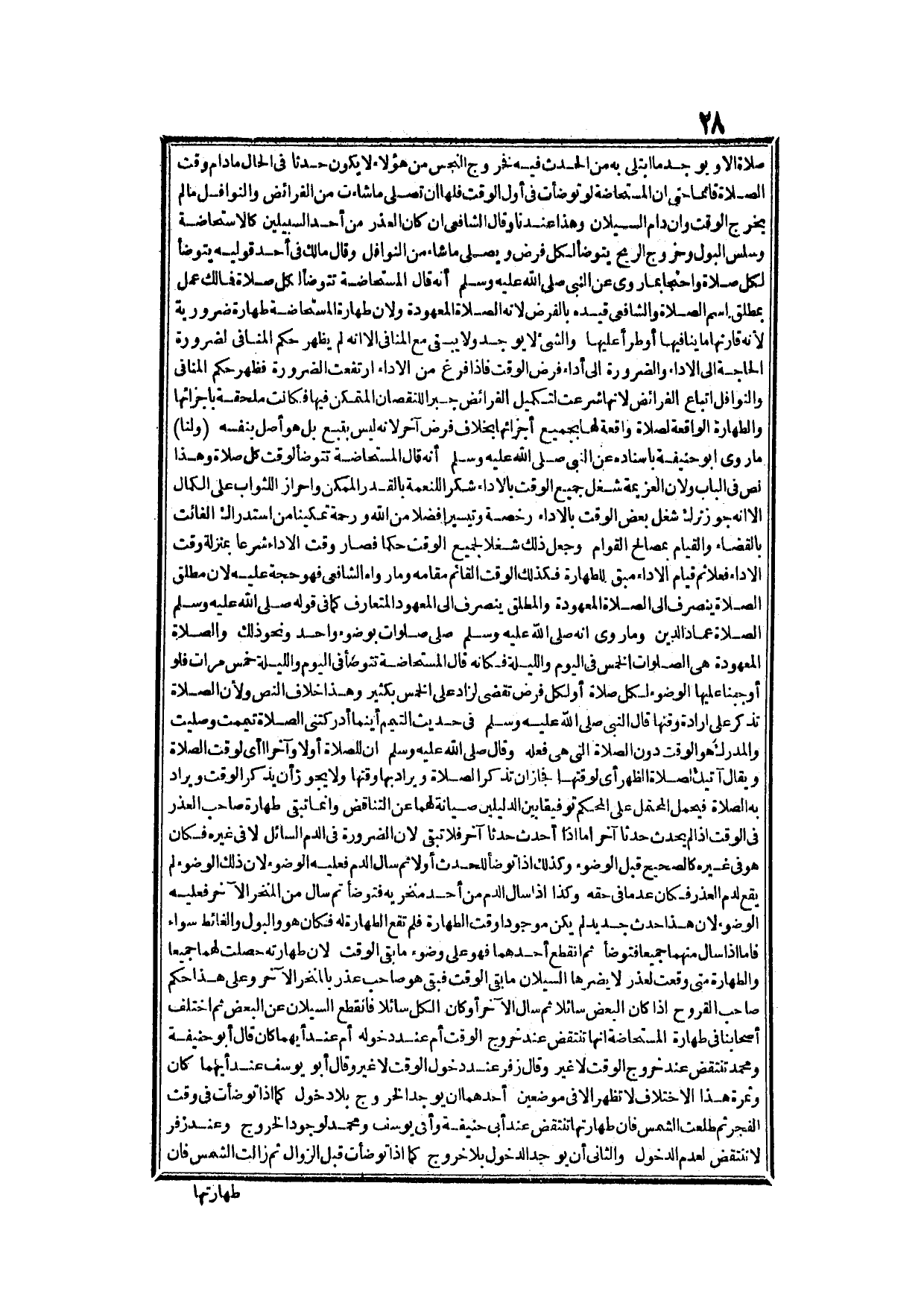 صَلَاةٍ إلَّا، وَيُوجَدُ مَا اُبْتُلِيَ بِهِ مِنْ الْحَدَثِ فِيهِ فَخُرُوجُ النَّجَسِ مِنْ هَؤُلَاءِ لَا يَكُونُ حَدَثًا فِي الْحَالِ مَا دَامَ وَقْتُ الصَّلَاةِ قَائِمًا، حَتَّى أَنَّ الْمُسْتَحَاضَةَ لَوْ تَوَضَّأَتْ فِي أَوَّلِ الْوَقْتِ فَلَهَا أَنْ تُصَلِّيَ مَا شَاءَتْ مِنْ الْفَرَائِضِ، وَالنَّوَافِلِ مَا لَمْ يَخْرُجْ الْوَقْتُ، وَإِنْ دَامَ السَّيَلَانِ، وَهَذَا عِنْدَنَا وَقَالَ الشَّافِعِيُّ إنْ كَانَ الْعُذْرُ مِنْ أَحَدِ السَّبِيلَيْنِ كَالِاسْتِحَاضَةِ، وَسَلَسِ الْبَوْلِ، وَخُرُوجِ الرِّيحِ يَتَوَضَّأُ لِكُلِّ فَرْضٍ، وَيُصَلِّي مَا شَاءَ مِنْ النَّوَافِلِ.