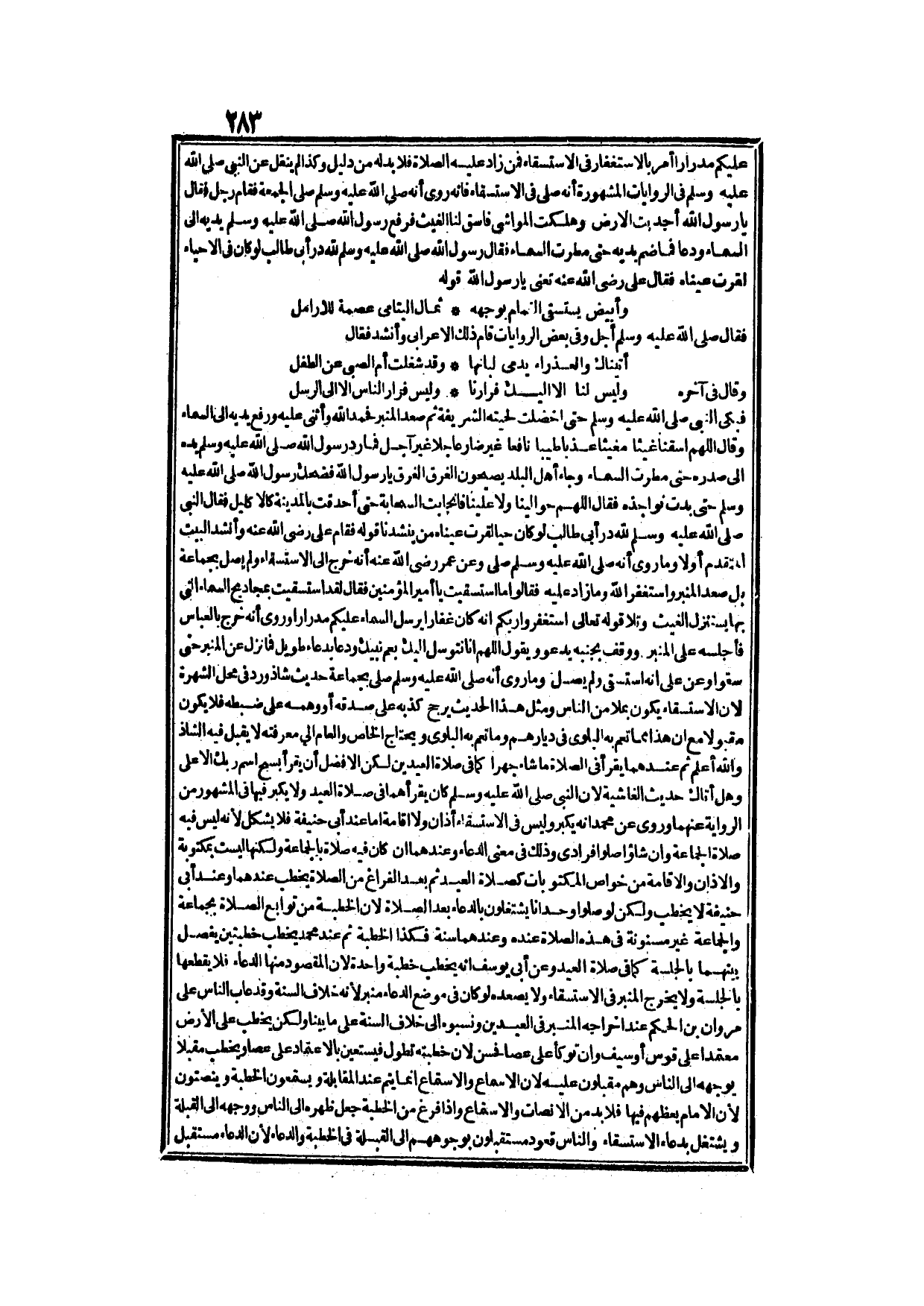 وَرُوِيَ أَنَّهُ خَرَجَ بِالْعَبَّاسِ فَأَجْلَسَهُ عَلَى الْمِنْبَرِ وَوَقَفَ بِجَنْبِهِ يَدْعُو وَيَقُولُ: اللَّهُمَّ إنَّا نَتَوَسَّلُ إلَيْك بِعَمِّ نَبِيُّكَ وَدَعَا بِدُعَاءٍ طَوِيلٍ فَمَا نَزَلَ عَنْ الْمِنْبَرِ حَتَّى سُقُوا، وَعَنْ عَلِيٍّ أَنَّهُ اسْتَسْقَى وَلَمْ يُصَلِّ، وَمَا رُوِيَ أَنَّهُ - صَلَّى اللَّهُ عَلَيْهِ وَسَلَّمَ - صَلَّى بِجَمَاعَةٍ حَدِيثٌ شَاذٌّ وَرَدَ فِي مَحِلِّ الشُّهْرَةِ؛ لِأَنَّ الِاسْتِسْقَاءَ يَكُونُ بِمَلَأٍ مِنْ النَّاسِ، وَمِثْلُ هَذَا الْحَدِيثِ يُرَجَّحُ كَذِبُهُ عَلَى صِدْقِهِ، أَوْ وَهْمُهُ عَلَى ضَبْطِهِ فَلَا يَكُونُ مَقْبُولًا مَعَ أَنَّ هَذَا مِمَّا تَعُمُّ بِهِ الْبَلْوَى فِي دِيَارِهِمْ، وَمَا تَعُمُّ بِهِ الْبَلْوَى، وَيَحْتَاجُ الْخَاصُّ وَالْعَامُّ إلَى مَعْرِفَتِهِ لَا يُقْبَلُ فِيهِ الشَّاذُّ وَاَللَّهُ أَعْلَمُ.