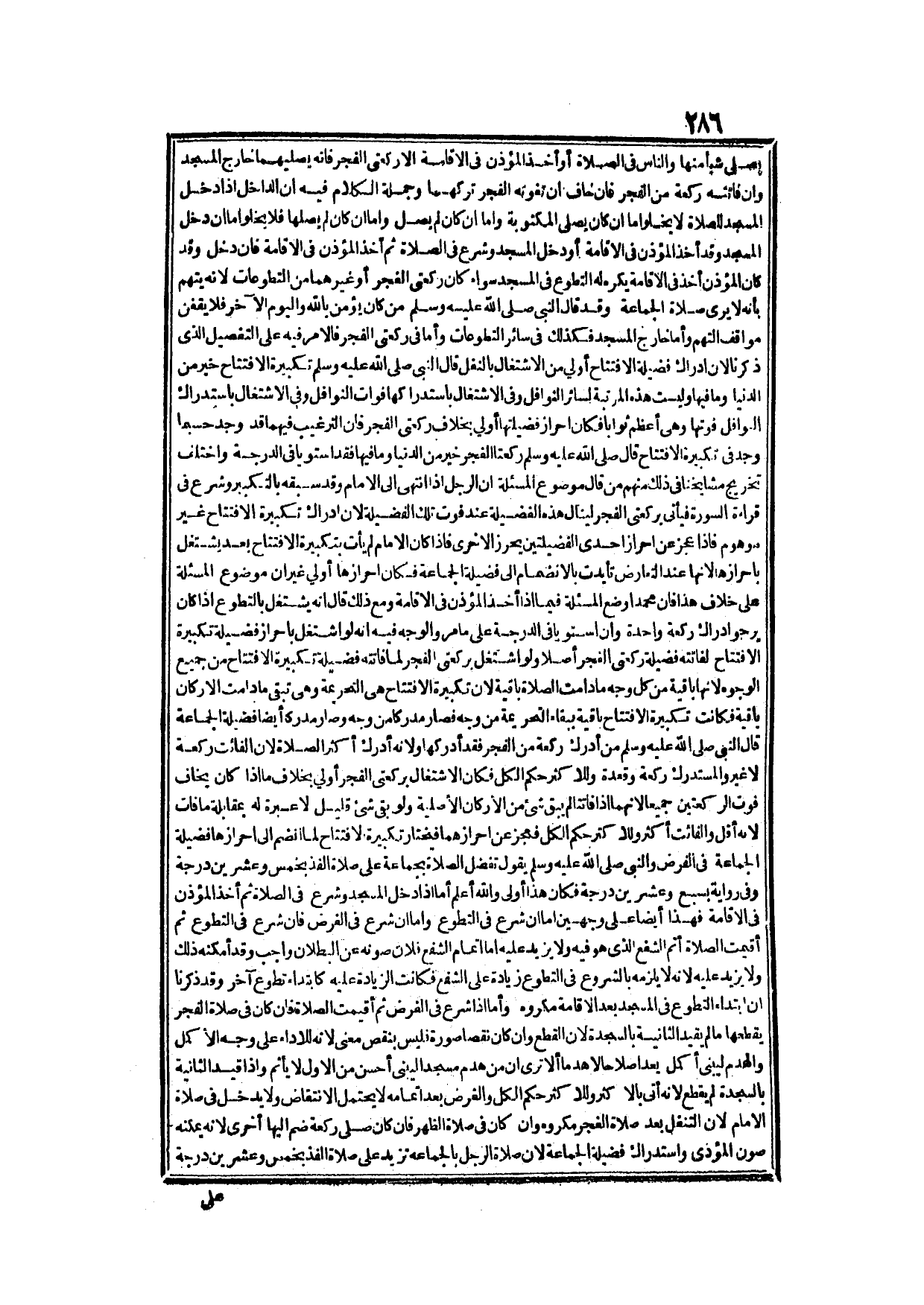 يُصَلِّي شَيْئًا مِنْهَا وَالنَّاسُ فِي الصَّلَاةِ، أَوْ أَخَذَ الْمُؤَذِّنُ فِي الْإِقَامَةِ إلَّا رَكْعَتَيْ الْفَجْرِ فَإِنَّهُ يُصَلِّيهِمَا خَارِجَ الْمَسْجِدِ، وَإِنْ فَاتَتْهُ رَكْعَةٌ مِنْ الْفَجْرِ، فَإِنْ خَافَ أَنْ تَفُوتَهُ الْفَجْرُ تَرَكَهُمَا وَجُمْلَةُ الْكَلَامِ فِيهِ أَنَّ الدَّاخِلَ إذَا دَخَلَ الْمَسْجِدَ لِلصَّلَاةِ لَا يَخْلُو إمَّا أَنْ كَانَ يُصَلِّي الْمَكْتُوبَةَ، وَإِمَّا أَنْ كَانَ لَمْ يُصَلِّ، وَإِمَّا أَنْ كَانَ لَمْ يُصَلِّهَا فَلَا يَخْلُو إمَّا أَنْ دَخَلَ الْمَسْجِدَ وَقَدْ أَخَذَ الْمُؤَذِّنُ فِي الْإِقَامَةِ، أَوْ دَخَلَ الْمَسْجِدَ وَشَرَعَ فِي الصَّلَاةِ ثُمَّ أَخَذَ الْمُؤَذِّنُ فِي الْإِقَامَةِ فَإِنْ دَخَلَ وَقَدْ كَانَ الْمُؤَذِّنُ أَخَذَ فِي الْإِقَامَةِ يُكْرَهُ لَهُ التَّطَوُّعُ فِي الْمَسْجِدِ سَوَاءٌ كَانَ رَكْعَتَيْ الْفَجْرِ، أَوْ غَيْرِهِمَا مِنْ التَّطَوُّعَاتِ؛ لِأَنَّهُ يُتَّهَمُ بِأَنَّهُ لَا يَرَى صَلَاةَ الْجَمَاعَةِ، وَقَدْ قَالَ النَّبِيُّ: - صَلَّى اللَّهُ عَلَيْهِ وَسَلَّمَ - «مَنْ كَانَ يُؤْمِنُ بِاَللَّهِ وَالْيَوْمِ الْآخِرِ فَلَا يَقِفَنَّ مَوَاقِفَ التُّهَمِ» .