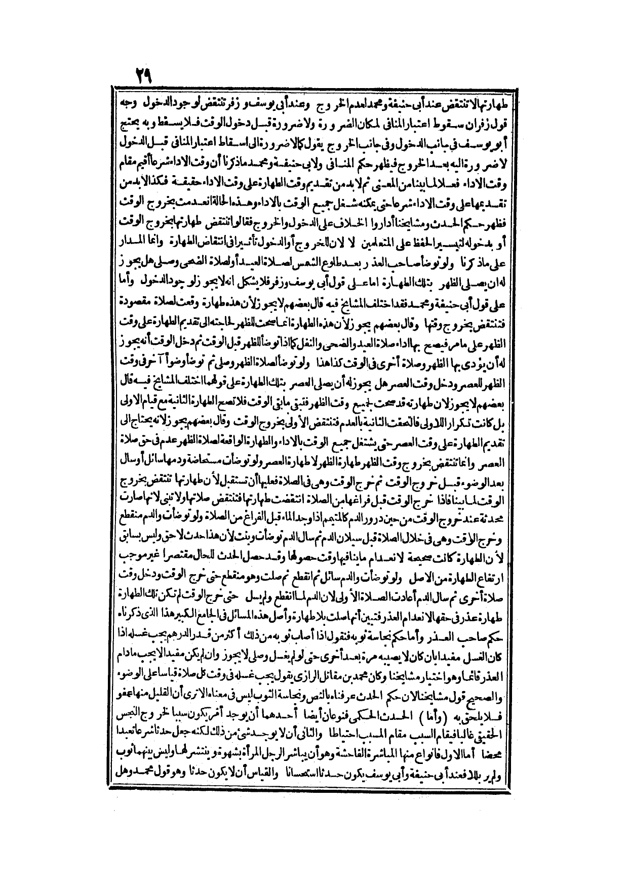 وَأَمَّا عَلَى قَوْلِ أَبِي حَنِيفَةَ، وَمُحَمَّدٍ فَقَدْ اخْتَلَفَ الْمَشَايِخُ فِيهِ قَالَ بَعْضُهُمْ: لَا يَجُوزُ، لِأَنَّ هَذِهِ طَهَارَةً وَقَعَتْ لِصَلَاةٍ مَقْصُودَةٍ فَتُنْتَقَضُ بِخُرُوجِ وَقْتِهَا.