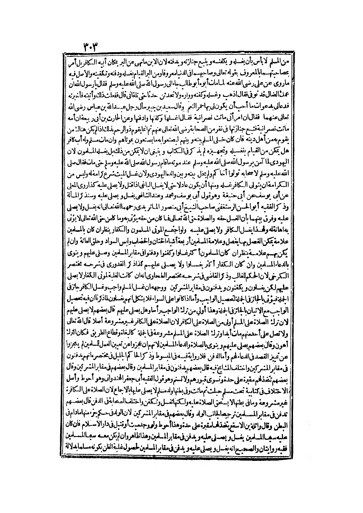وَأَصْلُ الِاخْتِلَافِ فِي كِتَابِيَّةٍ تَحْتَ مُسْلِمٍ حَبِلَتْ ثُمَّ مَاتَتْ وَفِي بَطْنِهَا وَلَدٌ مُسْلِمٌ لَا يُصَلَّى عَلَيْهَا بِالْإِجْمَاعِ؛ لِأَنَّ الصَّلَاةَ عَلَى الْكَافِرَةِ غَيْرُ مَشْرُوعَةٍ، وَمَا فِي بَطْنِهَا لَا يَسْتَحِقُّ الصَّلَاةَ عَلَيْهِ وَلَكِنَّهَا تُغَسَّلُ وَتُكَفَّنُ، وَاخْتَلَفَ الصَّحَابَةُ فِي الدَّفْنِ قَالَ بَعْضُهُمْ: تُدْفَنُ فِي مَقَابِرِ الْمُسْلِمِينَ تَرْجِيحًا لِجَانِبِ الْوَلَدِ، وَقَالَ بَعْضُهُمْ: فِي مَقَابِرِ الْمُشْرِكِينَ؛ لِأَنَّ الْوَلَدَ فِي حُكْمِ جُزْءٍ مِنْهَا مَا دَامَ فِي الْبَطْنِ، وَقَالَ وَاثِلَةُ بْنُ الْأَسْقَعِ: يُتَّخَذُ لَهَا مَقْبَرَةٌ عَلَى حِدَةٍ، وَهَذَا أَحْوَطُ.