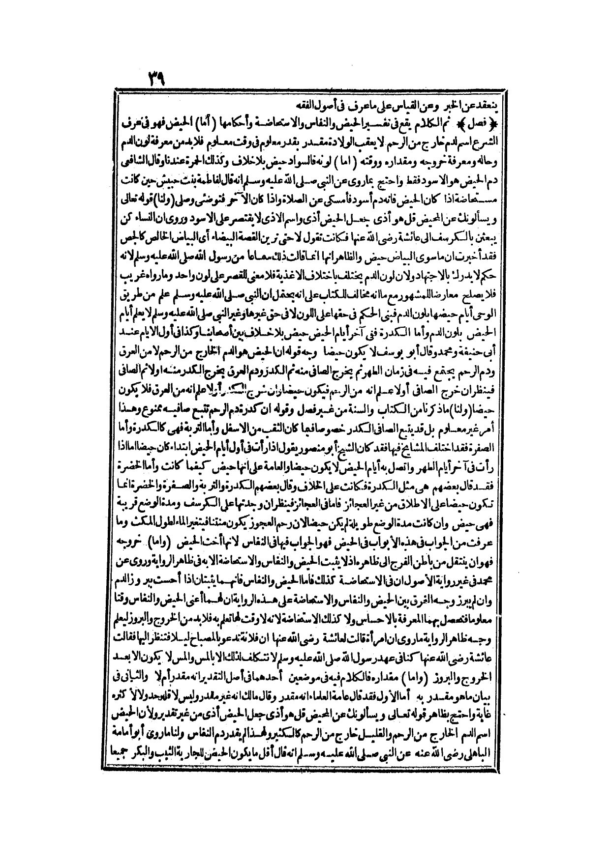 ثُمَّ الْكَلَامُ يَقَعُ فِي تَفْسِيرِ الْحَيْضِ، وَالنِّفَاسِ، وَالِاسْتِحَاضَةِ، وَأَحْكَامِهَا (أَمَّا) الْحَيْضُ فَهُوَ فِي عُرْفِ الشَّرْعِ اسْمٌ لِدَمٍ خَارِجٍ مِنْ الرَّحِمِ لَا يَعْقُبُ الْوِلَادَةَ مُقَدَّرٌ بِقَدْرٍ مَعْلُومٍ فِي وَقْتٍ مَعْلُومٍ، فَلَا بُدَّ مِنْ مَعْرِفَةِ لَوْنِ الدَّمِ، وَحَالِهِ، وَمَعْرِفَةِ خُرُوجِهِ، وَمِقْدَارِهِ، وَوَقْتِهِ (أَمَّا) لَوْنُهُ فَالسَّوَادُ حَيْضٌ بِلَا خِلَافٍ، وَكَذَلِكَ الْحُمْرَةُ عِنْدَنَا وَقَالَ الشَّافِعِيُّ: دَمُ الْحَيْضِ هُوَ الْأَسْوَدُ فَقَطْ، وَاحْتَجَّ بِمَا رُوِيَ عَنْ النَّبِيِّ - صَلَّى اللَّهُ عَلَيْهِ وَسَلَّمَ - أَنَّهُ قَالَ لَفَاطِمَةَ بِنْتِ حُبَيْشٍ حِينَ كَانَتْ مُسْتَحَاضَةً «إذَا كَانَ الْحَيْضُ فَإِنَّهُ دَمٌ أَسْوَدُ فَأَمْسِكِي عَنْ الصَّلَاةِ، وَإِذَا كَانَ الْآخَرُ فَتَوَضَّئِي، وَصَلِّي» .